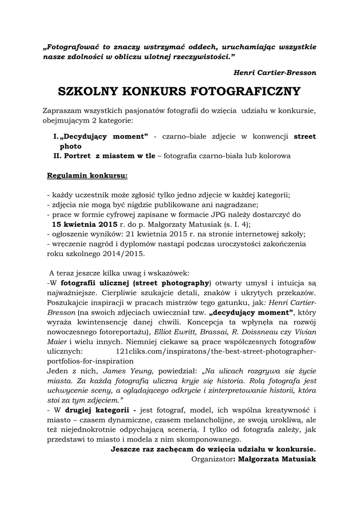 „Fotografować to znaczy wstrzymać oddech, uruchamiając wszystkie nasze zdolności w obliczu ulotnej rzeczywistości.” Henri Cartier-Bresson SZKOLNY KONKURS FOTOGRAFICZNY Zapraszam wszystkich pasjonatów fotografii do wzięcia udziału w konkursie, obejmującym 2 kategorie: I. „Decydujący moment” - czarno–białe zdjęcie w konwencji street photo II. Portret z miastem w tle – fotografia czarno-biała lub kolorowa Regulamin konkursu: - każdy uczestnik może zgłosić tylko jedno zdjęcie w każdej kategorii; - zdjęcia nie mogą być nigdzie publikowane ani nagradzane; - prace w formie cyfrowej zapisane w formacie JPG należy dostarczyć do 15 kwietnia 2015 r. do p. Małgorzaty Matusiak (s. I. 4); - ogłoszenie wyników: 21 kwietnia 2015 r. na stronie internetowej szkoły; - wręczenie nagród i dyplomów nastąpi podczas uroczystości zakończenia roku szkolnego 2014/2015. A teraz jeszcze kilka uwag i wskazówek: -W fotografii ulicznej (street photography) otwarty umysł i intuicja są najważniejsze. Cierpliwie szukajcie detali, znaków i ukrytych przekazów. Poszukajcie inspiracji w pracach mistrzów tego gatunku, jak: Henri CartierBresson (na swoich zdjęciach uwieczniał tzw. „decydujący moment”, który wyraża kwintensencję danej chwili. Koncepcja ta wpłynęła na rozwój nowoczesnego fotoreportażu), Elliot Ewritt, Brassai, R. Doissneau czy Vivian Maier i wielu innych. Niemniej ciekawe są prace współczesnych fotografów ulicznych: 121cliks.com/inspiratons/the-best-street-photographerportfolios-for-inspiration Jeden z nich, James Yeung, powiedział: „Na ulicach rozgrywa się życie miasta. Za każdą fotografią uliczną kryje się historia. Rolą fotografa jest uchwycenie sceny, a oglądającego odkrycie i zinterpretowanie historii, która stoi za tym zdjęciem.” - W drugiej kategorii - jest fotograf, model, ich wspólna kreatywność i miasto – czasem dynamiczne, czasem melancholijne, ze swoją urokliwą, ale też niejednokrotnie odpychającą scenerią. I tylko od fotografa zależy, jak przedstawi to miasto i modela z nim skomponowanego. Jeszcze raz zachęcam do wzięcia udziału w konkursie. Organizator: Małgorzata Matusiak