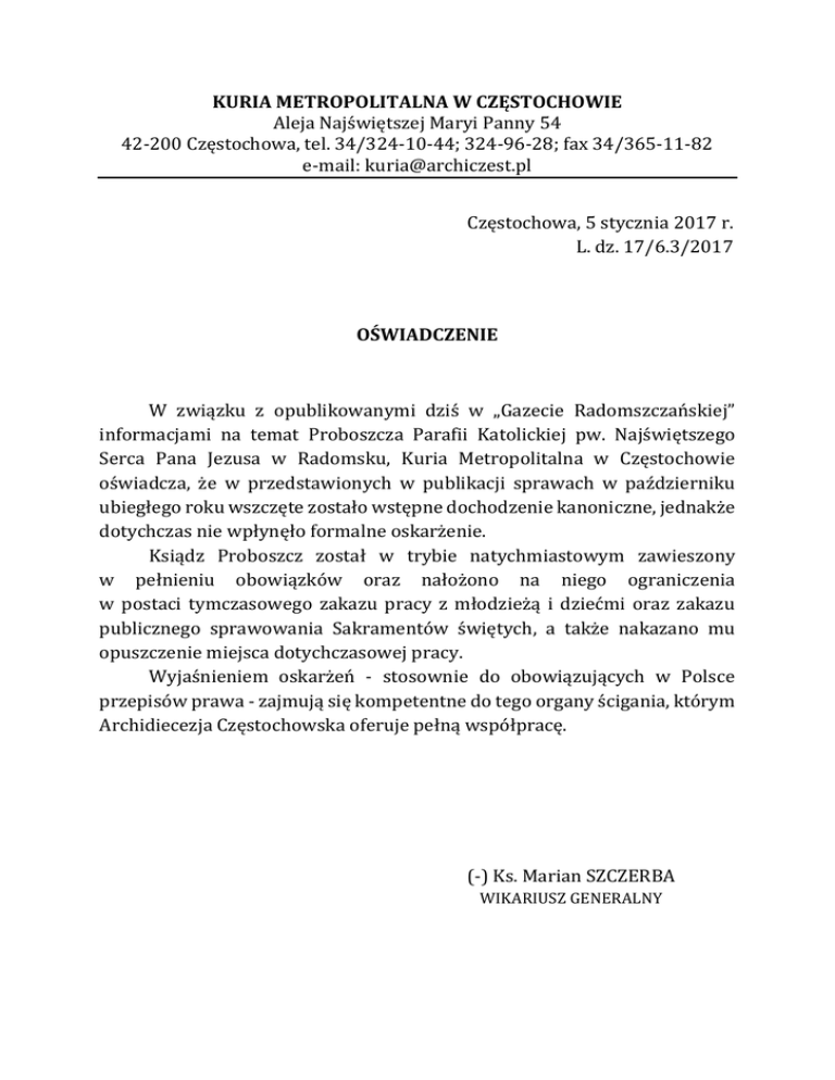 KURIA METROPOLITALNA W CZĘSTOCHOWIE Aleja Najświętszej Maryi Panny 54 42-200 Częstochowa, tel. 34/324-10-44; 324-96-28; fax 34/365-11-82 e-mail: [email protected] Częstochowa, 5 stycznia 2017 r. L. dz. 17/6.3/2017 OŚWIADCZENIE W związku z opublikowanymi dziś w „Gazecie Radomszczańskiej” informacjami na temat Proboszcza Parafii Katolickiej pw. Najświętszego Serca Pana Jezusa w Radomsku, Kuria Metropolitalna w Częstochowie oświadcza, że w przedstawionych w publikacji sprawach w październiku ubiegłego roku wszczęte zostało wstępne dochodzenie kanoniczne, jednakże dotychczas nie wpłynęło formalne oskarżenie. Ksiądz Proboszcz został w trybie natychmiastowym zawieszony w pełnieniu obowiązków oraz nałożono na niego ograniczenia w postaci tymczasowego zakazu pracy z młodzieżą i dziećmi oraz zakazu publicznego sprawowania Sakramentów świętych, a także nakazano mu opuszczenie miejsca dotychczasowej pracy. Wyjaśnieniem oskarżeń - stosownie do obowiązujących w Polsce przepisów prawa - zajmują się kompetentne do tego organy ścigania, którym Archidiecezja Częstochowska oferuje pełną współpracę. (-) Ks. Marian SZCZERBA WIKARIUSZ GENERALNY