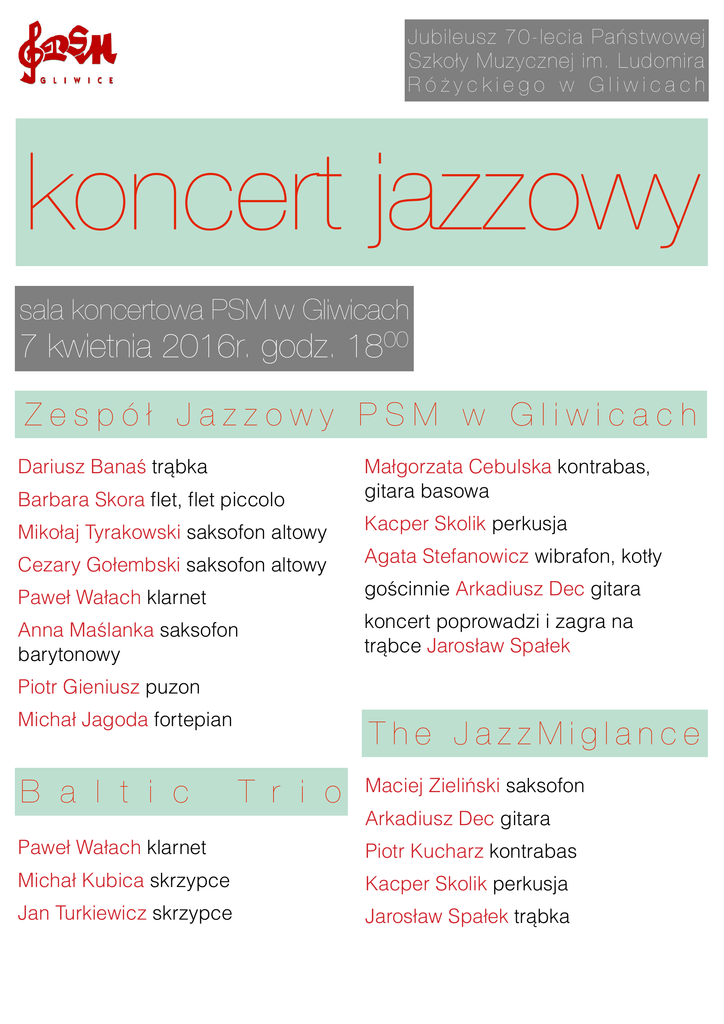 Jubileusz 70-lecia Państwowej Szkoły Muzycznej im. Ludomira Różyckiego w Gliwicach koncert jazzowy sala koncertowa PSM w Gliwicach 7 kwietnia 2016r. godz. 00 18 Zespół Jazzowy PSM w Gliwicach Dariusz Banaś trąbka Barbara Skora flet, flet piccolo Małgorzata Cebulska kontrabas, gitara basowa Mikołaj Tyrakowski saksofon altowy Kacper Skolik perkusja Cezary Gołembski saksofon altowy Agata Stefanowicz wibrafon, kotły Paweł Wałach klarnet gościnnie Arkadiusz Dec gitara Anna Maślanka saksofon barytonowy koncert poprowadzi i zagra na trąbce Jarosław Spałek Piotr Gieniusz puzon Michał Jagoda fortepian B a l t i c The JazzMiglance T r i o Maciej Zieliński saksofon Arkadiusz Dec gitara Paweł Wałach klarnet Piotr Kucharz kontrabas Michał Kubica skrzypce Kacper Skolik perkusja Jan Turkiewicz skrzypce Jarosław Spałek trąbka
