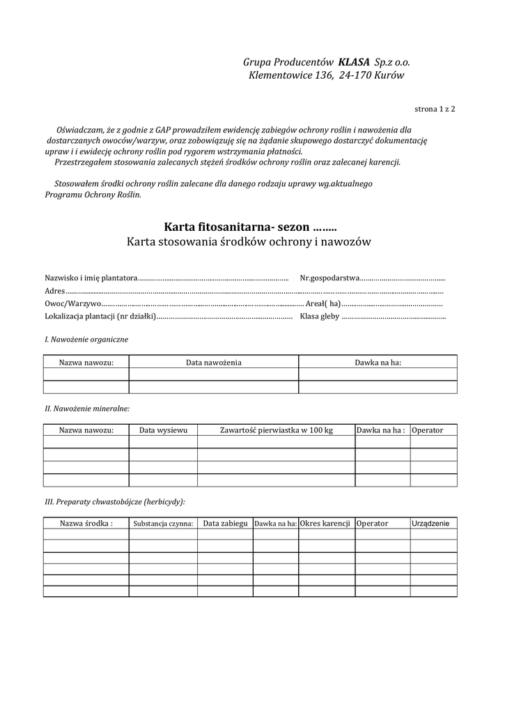 Grupa Producentów KLASA Sp.z o.o. Klementowice 136, 24-170 Kurów strona 1 z 2 Oświadczam, że z godnie z GAP prowadziłem ewidencję zabiegów ochrony roślin i nawożenia dla dostarczanych owoców/warzyw, oraz zobowiązuję się na żądanie skupowego dostarczyć dokumentację upraw i i ewidecję ochrony roślin pod rygorem wstrzymania płatności. Przestrzegałem stosowania zalecanych stężeń środków ochrony roślin oraz zalecanej karencji. Stosowałem środki ochrony roślin zalecane dla danego rodzaju uprawy wg.aktualnego Programu Ochrony Roślin. Karta fitosanitarna- sezon …….. Karta stosowania środków ochrony i nawozów Nazwisko i imię plantatora……………...….……………..……..………....…………….. Nr.gospodarstwa…….……………………………... Adres…....…............……………………………....……………………...……………………….……...……………………….……………..….….…………..… Owoc/Warzywo….………….……..……………………...………...…...…..………..…….........…. Areał( ha)……..……....…..………..……………… Lokalizacja plantacji (nr działki)…………………….…………….………...…………… Klasa gleby ………………………………...…...…….. I. Nawożenie organiczne Nazwa nawozu: Data nawożenia Dawka na ha: II. Nawożenie mineralne: Nazwa nawozu: Data wysiewu Zawartość pierwiastka w 100 kg Dawka na ha : Operator III. Preparaty chwastobójcze (herbicydy): Nazwa środka : Substancja czynna: Data zabiegu Dawka na ha: Okres karencji Operator Urządzenie Grupa Producentów KLASA Sp.z o.o. Klementowice 136, 24-170 Kurów strona 2 z 2 IV. Preparaty grzybobójcze (fungicydy) Nazwa środka : Substancja czynna: Data zabiegu Dawka na ha: Okres karencji Operator Urządzenie Data zabiegu Dawka na ha: Okres karencji Operator Urządzenie V. Preparaty owadobójcze (insektycydy) Nazwa środka : Substancja czynna: Oświadczam , że zapoznałem się ze specyfikacjami jakościowymi dla skupowanego surowca Oświadczam że dostarczony surowiec jest wolny od GMO. Prawdziwość w/w danych potwierdzam własnoręcznym podpisem. Data Czytelny Czytelny podpis podpis plantatora plantatora ___________________________________________________________________________________________________________________________
