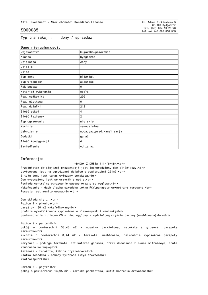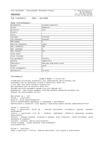 Alfa Investment - Nieruchomości Doradztwo Finanse SD00085 Typ transakcji: Al. Adama Mickiewicza 3 88-100 Bydgoszcz tel. (56) 664 10 25/26 tel.kom +48 888 658 303 domy / sprzedaż Dane nieruchomości: Województwo kujawsko-pomorskie Miasto Bydgoszcz Dzielnica Jary Osiedle Ulica Typ domu bliźniak Typ własności własność Rok budowy 0 Materiał wykonania cegła Pow. całkowita 200 Pow. użytkowa 0 Pow. działki 212 Ilość pokoi 4 Ilość łazienek 2 Typ ogrzewania miejskie Kuchnia samodzielna Uzbrojenie woda,gaz,prąd,kanalizacja Dodatki garaż Ilość kondygnacji 4 Zasiedlenie od zaraz Informacje: <b>DOM Z DUSZĄ !!!</b><br><br> Przedmiotem dzisiejszej prezentacji jest jednorodzinny dom bliźniaczy.<br> Usytuowany jest na ogrodzonej działce o powierzchni 221m2.<br> Z tyłu domu jest taras wyłożony terakotą.<br> Dom wyposażony jest we wszystkie media.<br> Posiada centralne ogrzewanie gazowe oraz piec węglowy.<br> Wykończenie - dach blacha szwedzka ,okna PCV,parapety wewnętrzne murowane.<br> Posesja jest monitorowana.<br><br> Dom składa się z :<br> Poziom 1 - piwnica<br> garaż ok. 30 m2 wykafelkowany<br> pralnia wykafelkowana wyposażona w zlewozmywak i wanienkę<br> pomieszczenie z piecem CO + piec węglowy z wydzieloną częścio barową (umeblowana)<br><br> Poziom 2 - parter<br> pokój o powierzchni 30,40 m2 - mozaika parkietowa, sztukateria gipsowa, parapety marmurowe<br> kuchnia o powierzchni 8,44 m2 - terakota, umeblowana, całkowicie wyposażona parapety marmurowe<br> korytarz - podłoga terakota, sztukateria gipsowa, drzwi drewniane z oknem witrażowym, szafa wbudowana we wnękę<br> łazienka - terakota, kabina prysznicowa<br> klatka schodowa - schody wyłożone litym drewnem<br>. wiatrołap<br><br> Poziom 3 - piętro<br> pokój o powierzchni 13,95 m2 - mozaika parkietowa, sufit boazeria drewniana<br> pokój o powierzchni 15,32 m2 - mozaika parkietowa, sztukateria gipsowa<br> pokój o powierzchni 15,32 m2 - mozaika parkietowa, sufit sztukateria gipsowa<br> łazienka 8,64 m2 - terakota, wanna<br><br> Poziom 4 - poddasze użytkowe<br> gabinet wraz z biblioteką powierzchnia podłogi ok 30m2, skosy, sufit drewniany, podłoga mozaika parkietowa.<br><br> Dogodna lokalizacja ,w pobliżu sklep przystanek tramwajowy i autobusowy ,kościół ,przychodnia ,park. Spokojna cicha i czysta okolica<br><br>. Serdecznie zapraszam na prezentację mieszkania, z przyjemnością odpowiem Państwu na wszelkie pytania oraz udzielę dodatkowych informacji.<br><br> Anna Mietlicka tel. 602320518<br><br> Pośrednik odpowiedzialny zawodowo: Paweł Dawidowicz numer licencji: 7432; Andrzej Pamin numer licencji 1145. WSPÓŁPRACUJEMY Z WIELOMA BANKAMI. Treść niniejszego ogłoszenia nie stanowi oferty handlowej w rozumieniu przepisów Kodeksu Cywilnego. Cena: 420 000 PLN Dokument wygenerowany ze strony www.alfa-investment.pl Strona 2