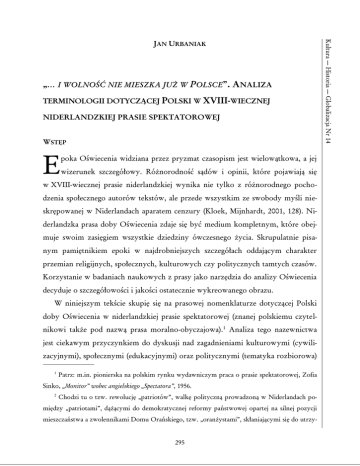 „… I WOLNOŚĆ NIE MIESZKA JUŻ W POLSCE”. ANALIZA TERMINOLOGII DOTYCZĄCEJ POLSKI W XVIII-WIECZNEJ NIDERLANDZKIEJ PRASIE SPEKTATOROWEJ WSTĘP E poka Oświecenia widziana przez pryzmat czasopism jest wielowątkowa, a jej wizerunek szczegółowy. Różnorodność sądów i opinii, które pojawiają się w XVIII-wiecznej prasie niderlandzkiej wynika nie tylko z różnorodnego pochodzenia społecznego autorów tekstów, ale przede wszystkim ze swobody myśli nieskrępowanej w Niderlandach aparatem cenzury (Kloek, Mijnhardt, 2001, 128). Niderlandzka prasa doby Oświecenia zdaje się być medium kompletnym, które obejmuje swoim zasięgiem wszystkie dziedziny ówczesnego życia. Skrupulatnie pisanym pamiętnikiem epoki w najdrobniejszych szczegółach oddającym charakter przemian religijnych, społecznych, kulturowych czy politycznych tamtych czasów. Korzystanie w badaniach naukowych z prasy jako narzędzia do analizy Oświecenia decyduje o szczegółowości i jakości ostatecznie wykreowanego obrazu. W niniejszym tekście skupię się na prasowej nomenklaturze dotyczącej Polski doby Oświecenia w niderlandzkiej prasie spektatorowej (znanej polskiemu czytelnikowi także pod nazwą prasa moralno-obyczajowa).1 Analiza tego nazewnictwa jest ciekawym przyczynkiem do dyskusji nad zagadnieniami kulturowymi (cywilizacyjnymi), społecznymi (edukacyjnymi) oraz politycznymi (tematyka rozbiorowa) 1 Patrz: m.in. pionierska na polskim rynku wydawniczym praca o prasie spektatorowej, Zofia Sinko, „Monitor” wobec angielskiego „Spectatora”, 1956. 2 Chodzi tu o tzw. rewolucję „patriotów”, walkę polityczną prowadzoną w Niderlandach po- między „patriotami”, dążącymi do demokratycznej reformy państwowej opartej na silnej pozycji mieszczaństwa a zwolennikami Domu Orańskiego, tzw. „oranżystami”, skłaniającymi się do utrzy- 295 Kultura — Historia — Globalizacja Nr 14 JAN URBANIAK Jan Urbaniak, „… i wolność nie mieszka już w Polsce”… prezentowanymi na łamach niderlandzkiej prasy w XVIII. wieku, na których rozwinięcie nie pozwala ograniczona formuła niniejszego tekstu. Tekst ma dać odpowiedź na pytania określające relacje pomiędzy Polakami a Holendrami w XVIII. stuleciu. Po pierwsze interesuje mnie, jakie są charakterystyczne składniki obrazu Polski i Polaków wykreowanego na łamach omawianych pism (immanentnym narzędziem w tworzeniu takiego obrazu będzie właśnie terminologia) oraz co obraz ten mówi o samych jego twórcach i ich narodowym charakterze. Kolejnym pytaniem, jakie stawiam w moim tekście jest pytanie o retoryczne funkcje omawianych wzmianek: staram się określić, w jakim celu holenderscy autorzy stosowali taką, a nie inną nomenklaturę. PRASA SPEKTATOROWA. SZKIC Prasa spektatorowa jest zjawiskiem mało znanym polskiemu czytelnikowi. Formuła tego typu czasopism pochodzi z Anglii — tytuł gatunku wziął się od periodyku The Spectator wydawanego właśnie tam na początku XVIII. stulecia. W Niderlandach pisma spektatorowe szybko uznane zostały za medium niezwykle popularne i ważne. Pierwszy periodyk tego typu został wydany w 1718 roku (De Mensch Ontmaskerd) otwierając rynek wydawniczy w Niderlandach na to nowe medium (Buijnsters, 1991, 104). Profil czasopisma spektatorowego odzwierciedlał protestancki, surowy i dogmatyczny charakter ówczesnego Holendra. Zamiast rozrywki — obecnej w pismach satyrycznych czy popularnych „kurantach” — spektator oferował przemyślaną misję edukacyjną opartą na tradycyjnym mieszczańskim modelu moralno-obyczajowym. Model ten uosabiany był przez fikcyjną postać — niejakiego „Pana Spektatora” — konstrukcję literacką łączącą w sobie kilka funkcji naraz. „Pan Spektator” mógł być zarazem autorem tekstów jak i wydawcą, a w nielicznych przypadkach niezwiązanym z redakcją zwykłym holenderskim mieszczaninem, który jedynie inspirował anonimowego autora do tworzenia prasowych tekstów. Wyważony w sądach, elegancki, kulturalny miał stanowić przykład wzorowego postępowania. 296 nauczycielem w delikatny lecz zdecydowany sposób określającym właściwe postawy obyczajowe mieszkańców niderlandzkiej Republiki w XVIII. stuleciu. Do postaw tych zaliczano m.in. patriotyzm, szacunek do tradycji, skromność, pracowitość i życzliwość (Hartog, 1870, 2; Martens, 1968, 16-17). Stąd tego typu periodyki w Anglii i Niemczech tamtego okresu określane były terminami „moral weeklies” oraz „moralische Wochenschriften” (Johannes, 1995, 6; Buijnsters, 1991, 104-110). Spektatory zaangażowane były w społeczną misję znaną pod nazwą „moralna reorientacja społeczeństwa niderlandzkiego” (Buijnsters, 1991, 70). Był to szeroko zakrojony proces społecznej naprawy, któremu od samego początku towarzyszyło pragnienie powrotu Niderlandów do potęgi z okresu Złotego Wieku (Van Sas, 2004, 73). Kolejne stulecie ze swoimi niepokojami społecznymi (przybierającymi w krytycznym momencie formę wojny domowej2), pauperyzacją zamożnych niegdyś miast, powolnym załamywaniem się handlu dalekomorskiego, wzbudzał niepokój i troskę zarazem (Israel, 1995, 1129-1134). Naturalną reakcją elit państwowych była społeczna debata o losach państwa, w której ważną rolę odegrała m.in. prasa (w tym właśnie pisma spektatorowe). Autorzy spektatorów (wywodzący się głównie z protestanckiego środowiska mennonickich duchownych) upadek państwa w XVIII. wieku wiązali z, najogólniej rzecz ujmując, brakiem moralności. Widoczny on był chociażby w nieszanowaniu narodowej tradycji (przykładem może być wszechobecna „gallofilia” — bezrefleksyjne naśladowanie francuskiej kultury w wielu dziedzinach), życie ponad stan arystokratycznych elit czy permanentne zaniedbywanie kontaktów handlowych przez niderlandzkich kupców. Spektatory oferowały w za- 2 Chodzi tu o tzw. rewolucję „patriotów”, walkę polityczną prowadzoną w Niderlandach po- m