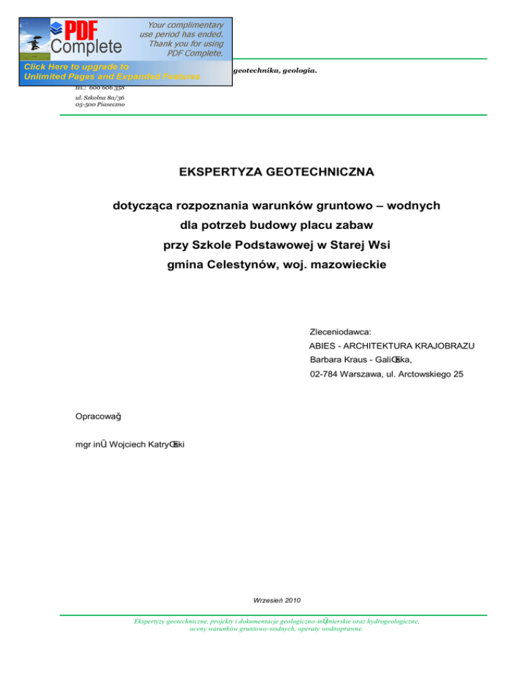 GEOTECHNIKAT - Inżynieria środowiska, geotechnika, geologia. mgr inż. Wojciech Katryński tel.: 600 606 358 ul. Szkolna 8a/36 05-500 Piaseczno EKSPERTYZA GEOTECHNICZNA dotycząca rozpoznania warunków gruntowo – wodnych dla potrzeb budowy placu zabaw przy Szkole Podstawowej w Starej Wsi gmina Celestynów, woj. mazowieckie Zleceniodawca: ABIES - ARCHITEKTURA KRAJOBRAZU Barbara Kraus - Galińska, 02-784 Warszawa, ul. Arctowskiego 25 Opracował: mgr inż. Wojciech Katryński Wrzesień 2010 Ekspertyzy geotechniczne, projekty i dokumentacje geologiczno-inżynierskie oraz hydrogeologiczne, oceny warunków gruntowo-wodnych, operaty wodnoprawne. 2 Spis treści: 1. Wstęp 3 2. Projektowana inwestycja 3 3. Budowa geologiczna i warunki hydrogeologiczne 4 4. Cel badań 4 5. Opis przeprowadzonych prac terenowych 5 6. Charakterystyka gruntów 5 7. Ocena warunków geotechnicznych 6 8. Podsumowanie i wnioski 7 Spis załączników 1. Położenie analizowanego terenu na tle mapy topograficznej, skala 1:50 000. 2. Mapa sytuacyjna z lokalizacją wykonanych otworów badawczych, skala 1:500. 3.1. Karta otworu geotechnicznego nr 1, skala 1:25. 3.2. Karta otworu geotechnicznego nr 2, skala 1:25. 4. Przekrój geotechniczny 1-2, skala pionowa 1:50, skala pozioma 1:100. 3 1. Wstęp. Niniejsza ekspertyza geotechniczna została wykonana na potrzeby budowy placu zabaw przy Szkole Podstawowej zlokalizowanej w Starej Wsi przy ulicy Fabrycznej 6, gmina Celestynów, woj. mazowieckie. Położenie analizowanego terenu na tle mapy topograficznej przedstawia załącznik nr 1. Przedstawioną ekspertyzę opracowano na podstawie dwóch otworów badawczych o głębokościach 2,0 m p.p.t., które wykonano w celu rozpoznania warunków gruntowo-wodnych występujących w podłożu. Wykonane małośrednicowe odwierty oraz analizy makroskopowe pozwoliły na rozpoznanie rodzajów zalegających gruntów oraz określenie przybliżonych parametrów geotechnicznych występujących w podłożu planowanej budowy placu zabaw. Ekspertyzę geotechniczną opracowano na podstawie odwiertów geotechnicznych z wykorzystaniem norm: 2. wykonanych · PN-B-04452 z 2002r.: Geotechnika. Badania polowe. · PN-81/B-03020 z 1981r.: Grunty budowlane. Posadowienie bezpośrednie budowli. · PN-B-02479 z 1998r.: Dokumentowanie geotechniczne. Zasady ogólne. Projektowana inwestycja. Na opiniowanym terenie planuje się budowę placu zabaw. Załącznik nr 2 przedstawia mapę sytuacyjną analizowanego terenu z lokalizacją wykonanych otworów badawczych. 4 3. Budowa geologiczna i warunki hydrogeologiczne. Przed rozpoczęciem prac terenowych przeanalizowano budowę geologiczną występującą na badanym terenie na podstawie Szczegółowej Mapy Geologicznej Polski, arkusz 561-Otwock, w skali 1 : 50 000 (Baraniecka M.D., Wydawnictwa Geologiczne, Warszawa 1975). Analizując w/w mapę, stwierdzono, że na danym obszarze w warstwie powierzchniowej zalegają najprawdopodobniej piaski rzeczne doliny Zabieżni-Celestynów wykształcone podczas zlodowaceń środkowopolskiego i północnopolskiego. Na badanym terenie przeprowadzono wiercenia do głębokości 2,0 m p.p.t. Na podstawie oporu świdra, postępu wykonywanych wierceń oraz makroskopowej analizy pobieranych próbek gruntowych, określono rodzaje i przybliżone stany gruntów występujących w podłożu. Wykonano karty otworów oraz przekrój geotechniczny (załączniki nr 3.1.-3.2. oraz 4). Wiercenia badawcze przeprowadzone w analizowanym podłożu potwierdziły występowanie piasków rzecznych wykształconych jako piaski drobne. Występujące w analizowanym podłożu utwory niespoiste (piaski drobne) są w stanie średnio zagęszczonym. W wykonanych odwiertach stwierdzono występowanie swobodnego zwierciadła wód gruntowych płytko, tzn. na głębokości 0,50-0,70 m p.p.t. Pomiary położenia zwierciadła wód gruntowych wykonano w dniu wierceń, tzn. 09.09.2010 r. (okres intensywnych opadów deszczu i wysokich stanów wód). 4. Cel badań. Celem badań było określenie warunków geotechnicznych występujących w analizowanym podłożu. Określono gruntów, tj.: wartości charakterystyczne · stopień zagęszczenia ID(n) · wilgotność naturalna wn(n) · gęstość objętościowa r(n) · kąt tarcia wewnętrznego Φu(n) parametrów geotechnicznych 5 · edometryczny moduł ściśliwości pierwotnej M0(n) · moduł pierwotnego odkształcenia E0(n) 5. Opis przeprowadzonych prac terenowych. Poniżej wymieniono prace terenowe, które zostały wykonane w ramach przeprowadzonych badań geotechnicznych w podłożu planowanej budowy placu zabaw przy Szkole Podstawowej zlokalizowanej przy ulicy Fabrycznej 6 w Starej Wsi. Wykonano: 6. 1) dwa wiercenia geotechniczne do głębokości 2,0 m p.p.t., 2) analizy makroskopowe w trakcie wykonywanych wierceń geotechnicznych (określenie rodzaju, barwy i wilgotności badanych gruntów oraz ich przybliżonych stanów), 3) pomiary położenia zwierciadła wód gruntowych w otworach wiertniczych. Charakterystyka gruntów. Grunty scharakteryzowano w oparciu o wyniki przeprowadzonych wierceń geotechnicznych z wykorzystaniem normy PN-81/B-03020. Jako parametr wiodący dla występujących w podłożu gruntów niespoistych przyjęto stopień zagęszczenia ID. Pozostałe parametry geotechniczne wyznaczono z wykresów i tabel z normy PN-81/B-03020. Ze względu na jednorodność zalegających gruntów wydzielono tylko jedną warstwę geotechniczną: Warstwa I – obejmuje utwory niespoiste - piaski drobne, żółte i szare, od wilgotnych do nawodnionych, znajdujące się w stanie średnio zgęszczonym, o uogólnionym stopniu zagęszczenia ID = 0,45. 6 W poniższej tabeli nr 1 zestawiono przybliżone wartości charakterystyczne parametrów geotechnicznych wyznaczone dla wydzielonej warstwy geotechnicznej. Tabela nr 1. Wartości charakterystyczne parametrów geotechnicznych wydzielonej warstwy. Nr warstwy geotechnicznej I Nazwa gruntu Stan gruntu Wilgotność naturalna Gęstość objęto