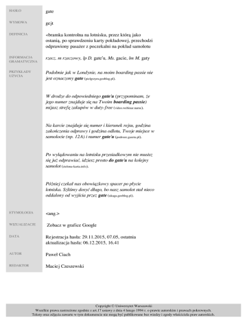 HASŁO gate WYMOWA gejt DEFINICJA «bramka kontrolna na lotnisku, przez którą jako ostanią, po sprawdzeniu karty pokładowej, przechodzi odprawiony pasażer z poczekalni na pokład samolotu» INFORMACJA GRAMATYCZNA rzecz. m rzeczowy, lp D. gate’u, Ms. gacie, lm M. gaty PRZYKŁADY UŻYCIA Podobnie jak w Londynie, na moim boarding passie nie jest oznaczony gate (pielgrzym.geoblog.pl). W drodze do odpowiedniego gate’u (przypominam, że jego numer znajduje się na Twoim boarding passie) mijasz strefę zakupów w duty-free (video.webinar.name). Na karcie znajduje się numer i kierunek rejsu, godzina zakończenia odprawy i godzina odlotu, Twoje miejsce w samolocie (np. 12A) i numer gate’u (podroze.gazeta.pl). Po wylądowaniu na lotnisku przesiadkowym nie musisz się już odprawiać, idziesz prosto do gate’u na kolejny samolot (zielona-karta.info). Później czekał nas obowiązkowy spacer po płycie lotniska. Szliśmy dosyć długo, bo nasz samolot stał nieco oddalony od wyjścia przez gate (ukaga.geoblog.pl). ETYMOLOGIA WIZUALIZACJE <ang.> Zobacz w grafice Google DATA Rejestracja hasła: 29.11.2015, 07.05, ostatnia aktualizacja hasła: 06.12.2015, 16.41 AUTOR Paweł Ciach REDAKTOR Maciej Czeszewski Copyright © Uniwersytet Warszawski Wszelkie prawa zastrzeżone zgodnie z art.17 ustawy z dnia 4 lutego 1994 r. o prawie autorskim i prawach pokrewnych. Teksty oraz zdjęcia zawarte w tym dokumencie nie mogą być publikowane bez wiedzy i zgody właściciela praw autorskich. Powered by TCPDF (www.tcpdf.org)
