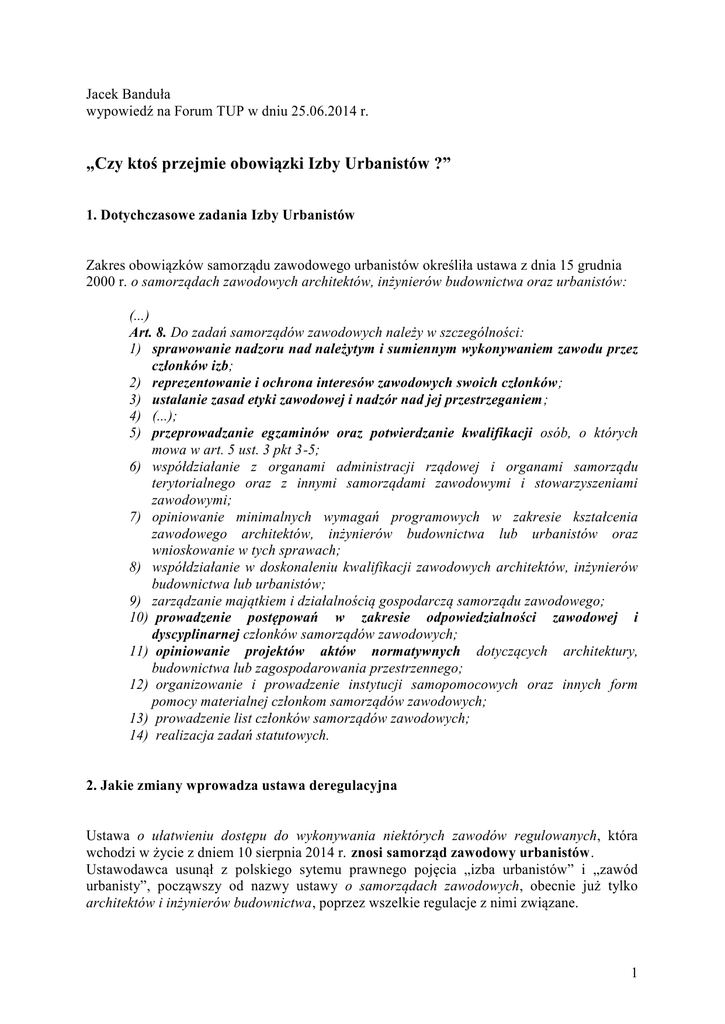 Jacek Banduła wypowiedź na Forum TUP w dniu 25.06.2014 r. „Czy ktoś przejmie obowiązki Izby Urbanistów ?” 1. Dotychczasowe zadania Izby Urbanistów Zakres obowiązków samorządu zawodowego urbanistów określiła ustawa z dnia 15 grudnia 2000 r. o samorządach zawodowych architektów, inżynierów budownictwa oraz urbanistów: (...) Art. 8. Do zadań samorządów zawodowych należy w szczególności: 1) sprawowanie nadzoru nad należytym i sumiennym wykonywaniem zawodu przez członków izb; 2) reprezentowanie i ochrona interesów zawodowych swoich członków; 3) ustalanie zasad etyki zawodowej i nadzór nad jej przestrzeganiem; 4) (...); 5) przeprowadzanie egzaminów oraz potwierdzanie kwalifikacji osób, o których mowa w art. 5 ust. 3 pkt 3-5; 6) współdziałanie z organami administracji rządowej i organami samorządu terytorialnego oraz z innymi samorządami zawodowymi i stowarzyszeniami zawodowymi; 7) opiniowanie minimalnych wymagań programowych w zakresie kształcenia zawodowego architektów, inżynierów budownictwa lub urbanistów oraz wnioskowanie w tych sprawach; 8) współdziałanie w doskonaleniu kwalifikacji zawodowych architektów, inżynierów budownictwa lub urbanistów; 9) zarządzanie majątkiem i działalnością gospodarczą samorządu zawodowego; 10) prowadzenie postępowań w zakresie odpowiedzialności zawodowej i dyscyplinarnej członków samorządów zawodowych; 11) opiniowanie projektów aktów normatywnych dotyczących architektury, budownictwa lub zagospodarowania przestrzennego; 12) organizowanie i prowadzenie instytucji samopomocowych oraz innych form pomocy materialnej członkom samorządów zawodowych; 13) prowadzenie list członków samorządów zawodowych; 14) realizacja zadań statutowych. 2. Jakie zmiany wprowadza ustawa deregulacyjna Ustawa o ułatwieniu dostępu do wykonywania niektórych zawodów regulowanych, która wchodzi w życie z dniem 10 sierpnia 2014 r. znosi samorząd zawodowy urbanistów. Ustawodawca usunął z polskiego sytemu prawnego pojęcia „izba urbanistów” i „zawód urbanisty”, począwszy od nazwy ustawy o samorządach zawodowych, obecnie już tylko architektów i inżynierów budownictwa, poprzez wszelkie regulacje z nimi związane. 1 Sposób likwidacji Izby określono jak poniżej: Art. 28. Postępowania wszczęte i niezakończone do dnia wejścia w życie niniejszej ustawy, dotyczące: 1) wpisu na listę członków izby urbanistów, 2) świadczenia usług transgranicznych, 3) uznawania kwalifikacji zawodowych urbanisty - umarza się. Art. 29. 1. Znosi się samorząd zawodowy urbanistów. 2. Czynności likwidacyjne podejmują organy samorządu na podstawie przepisów dotychczasowych. 3. Do czynności likwidacyjnych należą w szczególności: 1) zakończenie interesów bieżących; 2) ściągnięcie wierzytelności; 3) wypełnienie zobowiązań; 4) upłynnienie majątku samorządu. 4. Od dnia wejścia w życie niniejszej ustawy organy samorządu zawodowego urbanistów działają pod ich dotychczasowymi nazwami z dopiskiem "w likwidacji". 5. Czynności likwidacyjne, o których mowa w ust. 3 pkt 1-3, zostaną zakończone w terminie 6 miesięcy od dnia wejścia w życie niniejszej ustawy. 6. W terminie 30 dni po upływie terminu, o którym mowa w ust. 5, Nadzwyczajny Krajowy Zjazd Izby Urbanistów, zwołany przez Krajową Radę Izby Urbanistów, podejmuje uchwałę o przeznaczeniu majątku samorządu zawodowego urbanistów. Nadzwyczajny Krajowy Zjazd Izby Urbanistów informuje ministra właściwego do spraw budownictwa, lokalnego planowania i zagospodarowania przestrzennego oraz mieszkalnictwa niezwłocznie, nie później jednak niż w terminie 7 dni od dnia podjęcia uchwały, o jej treści. 7. Minister właściwy do spraw budownictwa, lokalnego planowania i zagospodarowania przestrzennego oraz mieszkalnictwa składa do Sądu Okręgowego w Warszawie wniosek w sprawie o: 1) wyznaczenie likwidatora, w razie niewykonania obowiązku, o którym mowa w ust. 5, lub 2) przeznaczenie majątku samorządu, w razie niewykonania obowiązku, o którym mowa w ust. 6. 8. Sąd orzeka o przeznaczeniu majątku na określony cel społeczny na podstawie przepisów ustawy z dnia 17 listopada 1964 r. - Kodeks postępowania cywilnego (Dz. U. z 2014 r. poz. 101, z późn. zm.) o postępowaniu nieprocesowym. 9. Koszty likwidacji pokrywa się z majątku likwidowanego samorządu zawodowego urbanistów. Art. 30. Dokumentacja znajdująca się w posiadaniu organów samorządu zawodowego urbanistów, niepodlegająca archiwizacji, z dniem wejścia w życie niniejszej ustawy zostanie przekazana ministrowi właściwemu do spraw budownictwa, lokalnego planowania i zagospodarowania przestrzennego oraz mieszkalnictwa. Ustawa deregulacyjna wprowadza także zmiany w ustawie z dnia 27 marca 2003 r. o planowaniu i zagospodarowaniu przestrzennym. Dotychczasowe wymagania w zakresie kwalifikacji zawodowych urbanistów zredukowano, rezygnując całkowicie z wymogu praktyki zawodowej. Projekty planów i studiów będzie teraz mógł opracowywać każdy absolwent studiów licencjackich o kierunku architektura, urbanistyka lub gospodarka 2 przestrzenna, a także absolwent dowolnego innego kierunku, o ile ukończy studia podyplomowe w zakresie planowania przestrzennego, urbanistyki lub gospodarki przestrzennej. Zmiany w ustawie o planowaniu i zagospodarowaniu przestrzennym: 1) art. 5 otrzymuje brzmienie: "Art. 5. Projekty planów zagospodarowania przestrzennego województwa, studium uwarunkowań i kierunków zagospodarowania przestrzennego gminy oraz miejscowego planu zagospodarowania przestrzennego sporządzają osoby, które spełniają jeden z warunków: 1) nabyły uprawnienia do projektowania w planowaniu przestrzennym na podstawie ustawy z dnia 12 lipca 1984 r. o planowaniu przestrzennym (Dz. U. z 1989 r. Nr 17, poz. 99, z późn. zm.); 2) nabyły uprawnienia urbanistyczne na podstawie art. 51 ustawy z dnia 7 lipca 1994 r. o zagospodarowaniu przestrzennym 