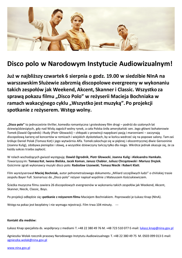 Disco polo w Narodowym Instytucie Audiowizualnym! Już w najbliższy czwartek 6 sierpnia o godz. 19.00 w siedzibie NInA na warszawskim Służewie zabrzmią discopolowe evergreeny w wykonaniu takich zespołów jak Weekend, Akcent, Skanner i Classic. Wszystko za sprawą pokazu filmu „Disco Polo” w reżyserii Macieja Bochniaka w ramach wakacyjnego cyklu „Wszystko jest muzyką”. Po projekcji spotkanie z reżyserem. Wstęp wolny. „Disco polo” to jednocześnie thriller, komedia romantyczna i groteskowy film drogi – podróż do szalonych lat dziewięćdziesiątych, gdy nad Wisłą zagościł wolny rynek, a cała Polska śniła amerykański sen. Jego główni bohaterowie Tomek (Dawid Ogrodnik) i Rudy (Piotr Głowacki) – chłopaki z prowincji napędzani pasją i marzeniami – zaczynają discopolową karierę od koncertów w remizach i wiejskich dyskotekach, by w końcu wedrzeć się na popowe salony. Tam zaś króluje Daniel Polak (Tomasz Kot) i jego wytwórnia Alfa. Tomek zakochuje się w pięknej i ekscentrycznej diwie Gensoninie (Joanna Kulig), zdobywa pieniądze i sławę, a wszystkie dziewczyny tańczą tylko dla niego. Wkrótce jednak okazuje się, że za każdy sukces trzeba zapłacić. W rolach wschodzących gwiazd występują: Dawid Ogrodnik, Piotr Głowacki, Joanna Kulig i Aleksandra Hamkało. Towarzyszą im: Tomasz Kot, Iwona Bielska, Jacek Koman, Janusz Chabior, Juliusz Chrząstowski i Mariusz Drężek. Gościnnie zgrali wykonawcy muzyki disco polo: Radosław Liszewski, Tomasz Niecik i Robert Klatt. Film wyreżyserował Maciej Bochniak, autor pełnometrażowego dokumentu „Miliard szczęśliwych ludzi” o chińskiej trasie zespołu Bayer Full. Scenariusz do „Disco polo” reżyser napisał wspólnie z Mateuszem Kościukiewiczem. Ścieżka muzyczna filmu zawiera 26 discopolowych evergreenów w wykonaniu takich zespołów jak Weekend, Akcent, Skanner, Niecik, Classic, Boys. Po projekcji odbędzie się spotkanie z reżyserem filmu Maciejem Bochniakiem. Poprowadzi je Łukasz Knap (NInA). Wstęp na pokaz jest bezpłatny i nie wymaga rejestracji. Film trwa 104 minuty. -- Kontakt dla mediów: Łukasz Knap specjalista ds. współpracy z mediami T. +48 22 380 49 76 M. +48 723 510 077 E-mail: [email protected] Agnieszka Wolak rzecznik prasowy Narodowego Instytutu Audiowizualnego T. +48 22 380 49 75 M. 0503 099 013 E-mail: [email protected] www.nina.gov.pl Data publikacji: 05 / 08 / 2015