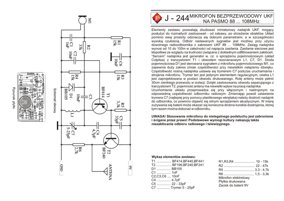 JABEL ® BEZPRZEWODOWY UKF J - 244MIKROFON NA PASMO 88 ... 108MHz Schemat ideowy Rysunek p³ytki Elementy zestawu pozwalaj¹ zbudowaæ miniaturowy nadajnik UKF, mog¹cy pos³u¿yæ do rozmaitych zastosowañ - od zabawy, po strze¿enie obiektów. Uk³ad pomimo swej prostoty odznacza siê dobrymi parametrami, a w szczególnoœci wysok¹ czu³oœci¹. Odbiór nadawanych sygna³ów jest mo¿liwy przy u¿yciu dowolnego radioodbiornika z zakresem UKF 88 ... 108MHz. Zasiêg nadajnika wynosi od 10 do 100m w zale¿noœci od napiêcia zasilania. Zasilanie sieciowe jest k³opotliwe ze wzglêdu na trudnoœci zwi¹zane z dok³adnym odfiltrowaniem zak³óceñ. “Sercem” nadajnika jest generator w. cz. o sprzê¿eniu pojemnoœciowym (uk³ad Colpitsa) z tranzystorem T1 i obwodem rezonansowym L1, C7, D1. Dioda pojemnoœciowa D1 jest sterowana sygna³em z mikrofonu pojemnoœciowego M1, co zapewnia du¿y zakres zmian czêstotliwoœci przy niewielkim natê¿eniu dŸwiêku. Czêstotliwoœæ noœn¹ nadajnika ustawia siê trymerem C7 podczas uruchamiania i strojenia mikrofonu. Trymer ten jest jedynym elementem regulacyjnym, cewka L1 jest zaprojektowana w postaci obwodu drukowanego. Rolê anteny mo¿e pe³niæ 30cm cienkiego przewodu w izolacji. Dziêki zastosowaniu obwodu separuj¹cego z tranzystorem T2, pojemnoœæ anteny ma niewielki wp³yw na pracê nadajnika. Uruchomienie uk³adu przeprowadza siê przy w³¹czonym i nastrojonym na odpowiedni¹ czêstotliwoœæ odbiorniku radiowym. Zmieniaj¹c powoli ustawienie trymera C7 (najlepiej przy pomocy plastikowego wkrêtaka) nale¿y dostroiæ nadajnik do odbiornika, co powinno objawiæ siê silnym sprzê¿eniem akustycznym. W miarê zu¿ywania siê baterii mo¿e okazaæ siê konieczna drobna korekta dostrojenia, której tym razem mo¿na dokonaæ w odbiorniku. UWAGA! Stosowanie mikrofonu do nielegalnego pods³uchu jest zabronione i œcigane przez prawo! Podstawowe wymogi kultury nakazuj¹ tak¿e niezak³ócanie odbioru radiowego i telewizyjnego. Wykaz elementów zestawu: T1 ................ BF414,BF440,BF441 T2 ................ BF199,BF240,BF241 D1 ............... BB105 C1 ............... 1nF C2,C3,C6 .... 10nF C4 ............... 4,7pF C5 ............... 22 - 33pF C7 .............. Trymer 5 - 25pF R1,R3,R4 ...................... 10 - 15kW R2 ................................. 22 - 47kW R5 ................................ 3,3 - 4,7kW R6 ................................ 1,5 - 3,3kW Mikrofon elektretowy P³ytka drukowana Zacisk do baterii 9V