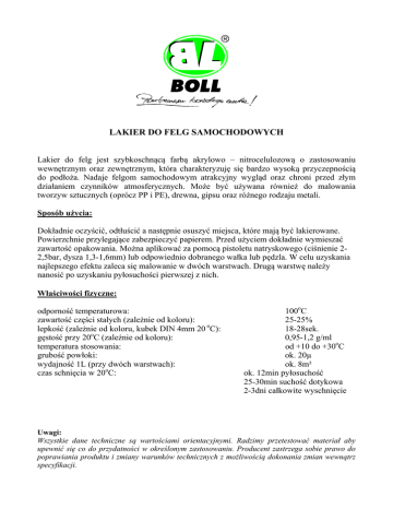 LAKIER DO FELG SAMOCHODOWYCH Lakier do felg jest szybkoschnącą farbą akrylowo – nitrocelulozową o zastosowaniu wewnętrznym oraz zewnętrznym, która charakteryzuję się bardzo wysoką przyczepnością do podłoża. Nadaje felgom samochodowym atrakcyjny wygląd oraz chroni przed złym działaniem czynników atmosferycznych. Może być używana również do malowania tworzyw sztucznych (oprócz PP i PE), drewna, gipsu oraz różnego rodzaju metali. Sposób użycia: Dokładnie oczyścić, odtłuścić a następnie osuszyć miejsca, które mają być lakierowane. Powierzchnie przylegające zabezpieczyć papierem. Przed użyciem dokładnie wymieszać zawartość opakowania. Można aplikować za pomocą pistoletu natryskowego (ciśnienie 22,5bar, dysza 1,3-1,6mm) lub odpowiednio dobranego wałka lub pędzla. W celu uzyskania najlepszego efektu zaleca się malowanie w dwóch warstwach. Drugą warstwę należy nanosić po uzyskaniu pyłosuchości pierwszej z nich. Właściwości fizyczne: odporność temperaturowa: zawartość części stałych (zależnie od koloru): lepkość (zależnie od koloru, kubek DIN 4mm 20 oC): gęstość przy 20oC (zależnie od koloru): temperatura stosowania: grubość powłoki: wydajność 1L (przy dwóch warstwach): czas schnięcia w 20oC: 100oC 25-25% 18-28sek. 0,95-1,2 g/ml od +10 do +30oC ok. 20µ ok. 8m² ok. 12min pyłosuchość 25-30min suchość dotykowa 2-3dni całkowite wyschnięcie Uwagi: Wszystkie dane techniczne są wartościami orientacyjnymi. Radzimy przetestować materiał aby upewnić się co do przydatności w określonym zastosowaniu. Producent zastrzega sobie prawo do poprawiania produktu i zmiany warunków technicznych z możliwością dokonania zmian wewnątrz specyfikacji.