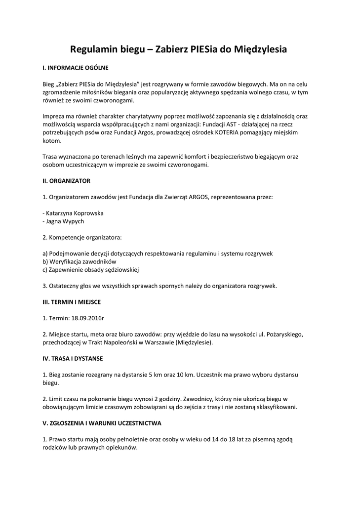 Regulamin biegu – Zabierz PIESia do Międzylesia I. INFORMACJE OGÓLNE Bieg „Zabierz PIESia do Międzylesia” jest rozgrywany w formie zawodów biegowych. Ma on na celu zgromadzenie miłośników biegania oraz popularyzację aktywnego spędzania wolnego czasu, w tym również ze swoimi czworonogami. Impreza ma również charakter charytatywny poprzez możliwośd zapoznania się z działalnością oraz możliwością wsparcia współpracujących z nami organizacji: Fundacji AST - działającej na rzecz potrzebujących psów oraz Fundacji Argos, prowadzącej ośrodek KOTERIA pomagający miejskim kotom. Trasa wyznaczona po terenach leśnych ma zapewnid komfort i bezpieczeostwo biegającym oraz osobom uczestniczącym w imprezie ze swoimi czworonogami. II. ORGANIZATOR 1. Organizatorem zawodów jest Fundacja dla Zwierząt ARGOS, reprezentowana przez: - Katarzyna Koprowska - Jagna Wypych 2. Kompetencje organizatora: a) Podejmowanie decyzji dotyczących respektowania regulaminu i systemu rozgrywek b) Weryfikacja zawodników c) Zapewnienie obsady sędziowskiej 3. Ostateczny głos we wszystkich sprawach spornych należy do organizatora rozgrywek. III. TERMIN I MIEJSCE 1. Termin: 18.09.2016r 2. Miejsce startu, meta oraz biuro zawodów: przy wjeździe do lasu na wysokości ul. Pożaryskiego, przechodzącej w Trakt Napoleooski w Warszawie (Międzylesie). IV. TRASA I DYSTANSE 1. Bieg zostanie rozegrany na dystansie 5 km oraz 10 km. Uczestnik ma prawo wyboru dystansu biegu. 2. Limit czasu na pokonanie biegu wynosi 2 godziny. Zawodnicy, którzy nie ukooczą biegu w obowiązującym limicie czasowym zobowiązani są do zejścia z trasy i nie zostaną sklasyfikowani. V. ZGŁOSZENIA I WARUNKI UCZESTNICTWA 1. Prawo startu mają osoby pełnoletnie oraz osoby w wieku od 14 do 18 lat za pisemną zgodą rodziców lub prawnych opiekunów. 2. Limit uczestników wynosi 300 osób. Organizator zastrzega sobie możliwośd zamknięcia zapisów po osiągnięciu wyżej wymienionej liczby zarejestrowanych uczestników. Organizator posiada prawo do zwiększenia limitu uczestników zawodów. 3. Opłata startowa wynosi 20 zł. 4. Zgłoszenia na bieg przyjmowane są do 05.09.2016, po tym terminie zgłoszenie będzie możliwe tylko po wcześniejszym kontakcie z organizatorem. 5. Aby zapisad się na zawody należy uiścid opłatę startową za pośrednictwem strony internetowej www.maratonczykpomiarczasu.pl oraz www.panel.maratonczykpomiarczasu.pl/bieg-miedzylesie 6. Tylko prawidłowe wypełnienie formularza opłaty startowej i opłacenie jej gwarantuje miejsce na ostatecznej liście startowej oraz udział w zawodach. O kolejności zgłoszenia decyduje data uiszczenia opłaty startowej. W przypadku rezygnacji z udziału w zawodach organizator nie zwraca opłaty startowej. VI. PAKIETY STARTOWE 1. Pakiety startowe będą wydawane w biurze zawodów na miejscu biegu w dniu zawodów w godzinach 09:00-10:30 2. Przy odbiorze pakietów startowych należy okazad dokument tożsamości ze zdjęciem. Odbiór pakietu startowego za innego zawodnika możliwy jest tylko na podstawie pisemnego pełnomocnictwa lub dokumentu, z którego wynikad będzie pokrewieostwo lub powinowactwo pierwszego stopnia. 3. Pakiet startowy będzie zawierał numer startowy, który należy przymocowad do przedniej części koszulki. VII. UCZESTNICTWO W ZAWODACH 1. Każdy zawodnik ma obowiązek uczestniczyd w biegu z numerem startowym przymocowanym do przedniej części koszulki. Zasłanianie numeru startowego lub jakakolwiek jego modyfikacja jest zabroniona pod rygorem dyskwalifikacji. 2. Organizator, poza podstawowym zabezpieczeniem medycznym imprezy, nie zapewnia Uczestnikowi jakiegokolwiek ubezpieczenia na życie, zdrowotnego, odpowiedzialności cywilnej w związku z chorobą, wypadkiem, czy odniesieniem obrażeo albo śmiercią lub innymi szkodami, jakie mogą wystąpid w związku z obecnością lub udziałem Uczestnika w imprezie oraz nie ponosi z tego tytułu żadnej odpowiedzialności. 3. Każdy Uczestnik lub jego opiekun podejmuje decyzję o uczestnictwie w zawodach na własną odpowiedzialnośd. Przed rozpoczęciem biegu Uczestnik jest zobowiązany podpisad niniejsze oświadczenie: "Ja niżej podpisana/y oświadczam, iż biorę udział w zawodach na własną odpowiedzialnośd. Jestem odpowiednio przygotowana/y do wysiłku podczas zawodów oraz zgodnie z moją obecną wiedzą nie posiadam żadnych przeciwwskazao zdrowotnych do uczestnictwa w zawodach biegowych. Zapoznałam/em się z regulaminem, całkowicie go akceptuję i zobowiązuje się go przestrzegad." 4. Decyzja lekarza o zakooczeniu biegu przez uczestnika jest ostateczna i nie podlega dyskusji. 5. Zawodnik zostanie sklasyfikowany, jeżeli ukooczy bieg samodzielnie, na oznaczonej trasie biegu, w przewidzianym limicie czasu. Skracanie trasy, korzystanie z jakichkolwiek środków transportu, utrudnianie biegu innym zawodnikom lub bieg pod wpływem środków odurzających lub dopingujących są niedozwolone i grożą dyskwalifikacją – decyzja Organizatora w tym względzie jest ostateczna. 6. Każdy Uczestnik wyraża zgodę na nieodpłatne wykorzystanie swojego wizerunku dla celów promocji biegu przez Organizatora bez konieczności każdorazowego ich zatwierdzania. VIII. KLASYFILACJE 1. Wyniki będą ogłoszone w następujących klasyfikacjach: a) kobiety – 5 km b) mężczyźni – 5 km c) kobiety – 10 km d) mężczyźni – 10 km e) klasyfikacja kobiet biegnących z psem – 5 km f) klasyfikacja kobiet biegnących z psem – 10 km g) klasyfikacja mężczyzn biegnących z psem – 5 km h) klasyfikacja mężczyzn biegnących z psem – 10 km 2. W wyżej wymienionych klasyfikacjach zostaną nagrodzone 3 pierwsze miejsca. 3. Każdy zawodnik, który ukooczy swój bieg, otrzyma pamiątkowy medal. IX. UWAGI DOTYCZĄCE ZWIERZĄT PODCZAS IMPREZY 1. Uczestnik ma prawo do udziału w biegu z psem. 2. Psy podczas całego wydarzenia muszą byd na smyczy. 3. Podczas wydarzenia należy mied ze sobą dokument