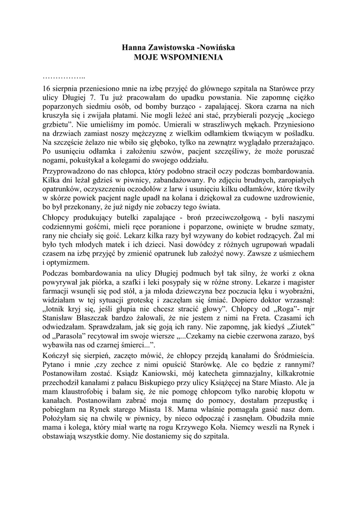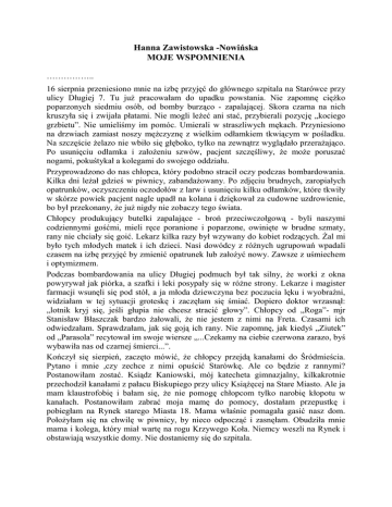 Hanna Zawistowska -Nowińska MOJE WSPOMNIENIA …………….. 16 sierpnia przeniesiono mnie na izbę przyjęć do głównego szpitala na Starówce przy ulicy Długiej 7. Tu juŜ pracowałam do upadku powstania. Nie zapomnę cięŜko poparzonych siedmiu osób, od bomby burząco - zapalającej. Skora czarna na nich kruszyła się i zwijała płatami. Nie mogli leŜeć ani stać, przybierali pozycję „kociego grzbietu”. Nie umieliśmy im pomóc. Umierali w straszliwych mękach. Przyniesiono na drzwiach zamiast noszy męŜczyznę z wielkim odłamkiem tkwiącym w pośladku. Na szczęście Ŝelazo nie wbiło się głęboko, tylko na zewnątrz wyglądało przeraŜająco. Po usunięciu odłamka i załoŜeniu szwów, pacjent szczęśliwy, Ŝe moŜe poruszać nogami, pokuśtykał a kolegami do swojego oddziału. Przyprowadzono do nas chłopca, który podobno stracił oczy podczas bombardowania. Kilka dni leŜał gdzieś w piwnicy, zabandaŜowany. Po zdjęciu brudnych, zaropiałych opatrunków, oczyszczeniu oczodołów z larw i usunięciu kilku odłamków, które tkwiły w skórze powiek pacjent nagle upadł na kolana i dziękował za cudowne uzdrowienie, bo był przekonany, Ŝe juŜ nigdy nie zobaczy tego świata. Chłopcy produkujący butelki zapalające - broń przeciwczołgową - byli naszymi codziennymi gośćmi, mieli ręce poranione i poparzone, owinięte w brudne szmaty, rany nie chciały się goić. Lekarz kilka razy był wzywany do kobiet rodzących. śal mi było tych młodych matek i ich dzieci. Nasi dowódcy z róŜnych ugrupowań wpadali czasem na izbę przyjęć by zmienić opatrunek lub załoŜyć nowy. Zawsze z uśmiechem i optymizmem. Podczas bombardowania na ulicy Długiej podmuch był tak silny, Ŝe worki z okna powyrywał jak piórka, a szafki i leki posypały się w róŜne strony. Lekarze i magister farmacji wsunęli się pod stół, a ja młoda dziewczyna bez poczucia lęku i wyobraźni, widziałam w tej sytuacji groteskę i zaczęłam się śmiać. Dopiero doktor wrzasnął: „lotnik kryj się, jeśli głupia nie chcesz stracić głowy”. Chłopcy od „Roga”- mjr Stanisław Błaszczak bardzo Ŝałowali, Ŝe nie jestem z nimi na Freta. Czasami ich odwiedzałam. Sprawdzałam, jak się goją ich rany. Nie zapomnę, jak kiedyś „Ziutek” od „Parasola” recytował im swoje wiersze „...Czekamy na ciebie czerwona zarazo, byś wybawiła nas od czarnej śmierci...”. Kończył się sierpień, zaczęto mówić, Ŝe chłopcy przejdą kanałami do Śródmieścia. Pytano i mnie ,czy zechce z nimi opuścić Starówkę. Ale co będzie z rannymi? Postanowiłam zostać. Ksiądz Kaniowski, mój katecheta gimnazjalny, kilkakrotnie przechodził kanałami z pałacu Biskupiego przy ulicy KsiąŜęcej na Stare Miasto. Ale ja mam klaustrofobię i bałam się, Ŝe nie pomogę chłopcom tylko narobię kłopotu w kanałach. Postanowiłam zabrać moja mamę do pomocy, dostałam przepustkę i pobiegłam na Rynek starego Miasta 18. Mama właśnie pomagała gasić nasz dom. PołoŜyłam się na chwilę w piwnicy, by nieco odpocząć i zasnęłam. Obudziła mnie mama i kolega, który miał wartę na rogu Krzywego Koła. Niemcy weszli na Rynek i obstawiają wszystkie domy. Nie dostaniemy się do szpitala. Zdejmujemy opaski i palimy legitymacje. Niemcy rewidują nas, grabią co się da, wyprowadzają z domów, a inni Ŝołnierze niemieccy wnoszą do domów kanistry z benzyną. Ustawiają nas w kolumny, prowadza na Plac Zamkowy, na ulicę Bednarską, a potem przez całą Warszawę tłumnie poganiani idziemy w nieznane. Co z nami będzie? Od czasu do czasu własowcy wyskakują z boku i wyciągają młode kobiety. Mama ze strachu zarzuciła mi kocyk na głowę. Obie z matkę prowadziłyśmy babcie pod rękę. W pewnym momencie podskoczył do babci jakiś wojak skośnooki i chciał jej zdjąć obrączki z palca. Niemcy podczas rewizji nie zdąŜyli ich zabrać, a myśmy w tym zamieszaniu nie dopilnowały, Ŝeby je schować. Byłyśmy bardzo zdenerwowane, gdy podbiegł ten typ, jednocześnie wrzasnęłyśmy „won”! Widocznie nie spodziewał się takiej reakcji, bo zostawił nas w spokoju. Po miesięcznym siedzeniu w piwnicach na głodowej diecie, ludzie byli słabi i z trudem dźwigali swoje tobołki, które w takim marszu były ponad ich siły. Wielu porzucało je po drodze. Biedne matki niosły swe dzieci. Po drodze spotkałam koleŜankę ze szpitala. Pocieszała mnie Ŝebym się nie martwiła, Ŝe nie wróciłam do szpitala, bo i tak juŜ nic bym nie mogła pomóc naszym rannym. Z wielkim trudem dotarliśmy do dworca zachodniego. Załadowali nas do wagonów i zawieźli do przejściowego obozu w Pruszkowie. Podzielono nas na trzy grupy wiekowe. Postanowiłam dostać się do baraku dla starców, bo ich do Niemiec nie wywiozą. Odszukałam babcię i starego wujka. Babcia przytomnie zaczepiła jakąś panią w białym fartuchu i zapytała czy zna dr Józefa Maya z Warszawy. Bo to był jej syn. Powinien być na letnisku w Komorowie. Okazało się, Ŝe wuj dał jej długą listę rodziny i znajomych. Jeszcze tego dnia babcia Ludwika May i wuj Jan May opuścili obóz. Mnie z mamą przeniosła ta pani do baraku dla cięŜko chorych, aby uchronić przed wysłaniem do Rzeszy. Na brudnych zaropiałych matach leŜeli cięŜko ranni. Raz dziennie przyjeŜdŜał beczkowóz z zupą. Trzeba było dopchać się z menaŜką, by zdobyć upragniony posiłek. Po wodę, trzeba było stać w długiej kolejce i mieć mocne łokcie. O myciu moŜna było tylko marzyć. Ubikacji nie było, tylko niebezpieczne, cuchnące, zupełnie odsłonięte latryny. Widziałam jak Niemcy prowadzili tłum księŜy zakonników i zakonnic z róŜnych zgromadzeń na wywózkę. Po kilku dniach udało się nam opuścić obóz na zawsze. Szczęśliwie dojechałyśmy do wujostwa w Komorowie. Zamieszkałyśmy z babcią w domku letniskowym. Ja pracowałam w szpitalu dla warszawiaków, który zorganizowali lekarze warszawscy, wujka koled