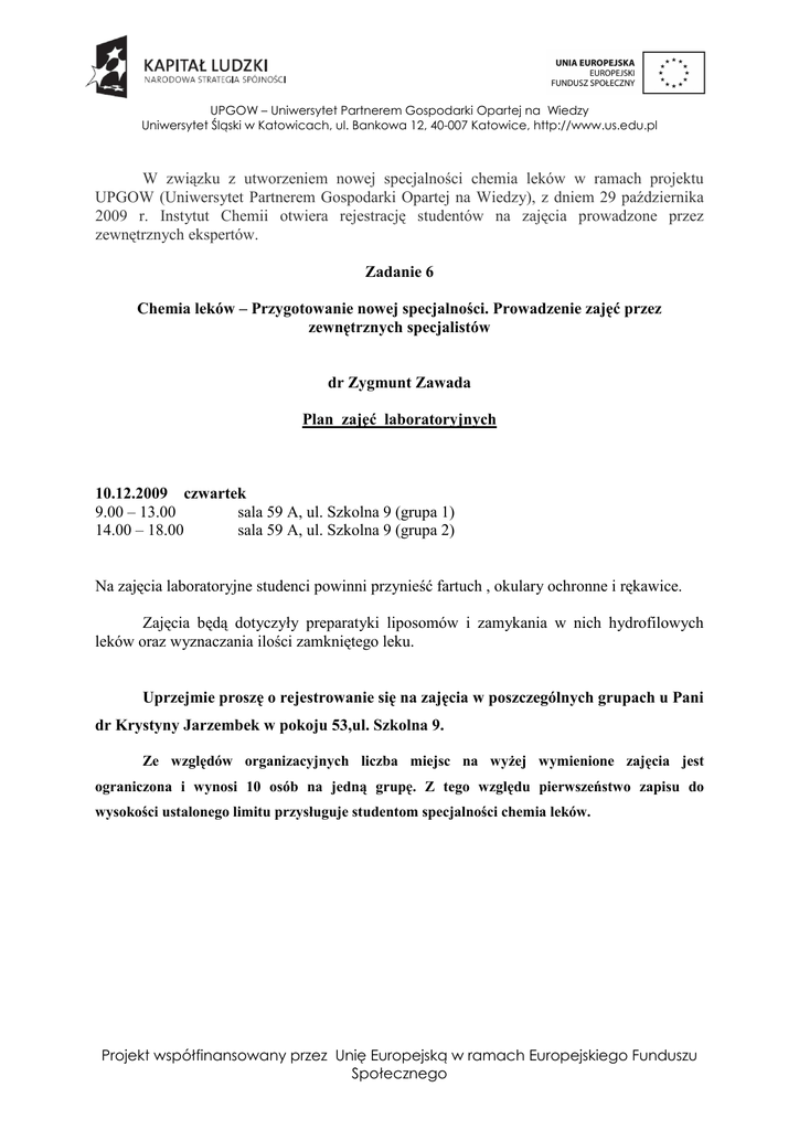 UPGOW – Uniwersytet Partnerem Gospodarki Opartej na Wiedzy Uniwersytet Śląski w Katowicach, ul. Bankowa 12, 40-007 Katowice, http://www.us.edu.pl W związku z utworzeniem nowej specjalności chemia leków w ramach projektu UPGOW (Uniwersytet Partnerem Gospodarki Opartej na Wiedzy), z dniem 29 października 2009 r. Instytut Chemii otwiera rejestrację studentów na zajęcia prowadzone przez zewnętrznych ekspertów. Zadanie 6 Chemia leków – Przygotowanie nowej specjalności. Prowadzenie zajęć przez zewnętrznych specjalistów dr Zygmunt Zawada Plan zajęć laboratoryjnych 10.12.2009 czwartek 9.00 – 13.00 sala 59 A, ul. Szkolna 9 (grupa 1) 14.00 – 18.00 sala 59 A, ul. Szkolna 9 (grupa 2) Na zajęcia laboratoryjne studenci powinni przynieść fartuch , okulary ochronne i rękawice. Zajęcia będą dotyczyły preparatyki liposomów i zamykania w nich hydrofilowych leków oraz wyznaczania ilości zamkniętego leku. Uprzejmie proszę o rejestrowanie się na zajęcia w poszczególnych grupach u Pani dr Krystyny Jarzembek w pokoju 53,ul. Szkolna 9. Ze względów organizacyjnych liczba miejsc na wyŜej wymienione zajęcia jest ograniczona i wynosi 10 osób na jedną grupę. Z tego względu pierwszeństwo zapisu do wysokości ustalonego limitu przysługuje studentom specjalności chemia leków. Projekt współfinansowany przez Unię Europejską w ramach Europejskiego Funduszu Społecznego