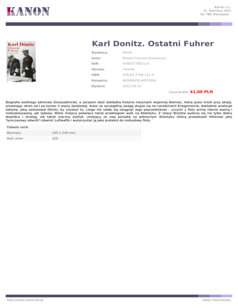 Kanon s.c. Ul. Zamiany 16/2 02-786 Warszawa Karl Donitz. Ostatni Fuhrer Wydawca: MUZA Autor: Brezet Francois-Emmanuel EAN: 9788377582114 Oprawa: Twarda ISBN: 978-83-7758-211-4 Kategoria: BIOGRAFIE,HISTORIA Wydano: 2012-09-12 Cena brutto: 41,00 PLN Biografia wielkiego admirała (Grossadmiral), a zarazem dość dokładna historia marynarki wojennej Niemiec, którą autor kreśli przy okazji, omawiając okres od I po koniec II wojny światowej. Autor ze szczególną uwagą skupia się na narodzinach Kriegsmarine, dokładnie analizuje taktykę, jaką zastosował Dönitz, by uzyskać to, czego nie udało się osiągnąć jego poprzednikowi - uczynić z floty armię równie ważną i rozbudowywaną, jak lądowa. Wiele miejsca poświęca także przebiegowi walk na Atlantyku. Z relacji Brezeta wyłania się nie tylko dobry dowódca i strateg, ale także zręczny polityk, umiejący za swą porażkę na północnym Atlantyku (którą przedstawił Hitlerowi jako 'tymczasowy odwrót') obwinić Luftwaffe i wykorzystać ją jako pretekst do rozbudowy floty. Tabela cech Wymiary 160 x 240 mm Ilość stron 320 http://www.kanon24.pl sklep internetowy