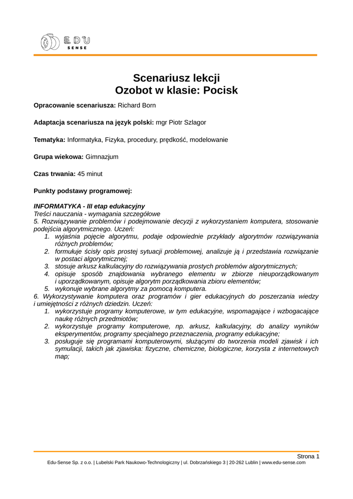 Scenariusz lekcji Ozobot w klasie: Pocisk Opracowanie scenariusza: Richard Born Adaptacja scenariusza na język polski: mgr Piotr Szlagor Tematyka: Informatyka, Fizyka, procedury, prędkość, modelowanie Grupa wiekowa: Gimnazjum Czas trwania: 45 minut Punkty podstawy programowej: INFORMATYKA - III etap edukacyjny Treści nauczania - wymagania szczegółowe 5. Rozwiązywanie problemów i podejmowanie decyzji z wykorzystaniem komputera, stosowanie podejścia algorytmicznego. Uczeń: 1. wyjaśnia pojęcie algorytmu, podaje odpowiednie przykłady algorytmów rozwiązywania różnych problemów; 2. formułuje ścisły opis prostej sytuacji problemowej, analizuje ją i przedstawia rozwiązanie w postaci algorytmicznej; 3. stosuje arkusz kalkulacyjny do rozwiązywania prostych problemów algorytmicznych; 4. opisuje sposób znajdowania wybranego elementu w zbiorze nieuporządkowanym i uporządkowanym, opisuje algorytm porządkowania zbioru elementów; 5. wykonuje wybrane algorytmy za pomocą komputera. 6. Wykorzystywanie komputera oraz programów i gier edukacyjnych do poszerzania wiedzy i umiejętności z różnych dziedzin. Uczeń: 1. wykorzystuje programy komputerowe, w tym edukacyjne, wspomagające i wzbogacające naukę różnych przedmiotów; 2. wykorzystuje programy komputerowe, np. arkusz, kalkulacyjny, do analizy wyników eksperymentów, programy specjalnego przeznaczenia, programy edukacyjne; 3. posługuje się programami komputerowymi, służącymi do tworzenia modeli zjawisk i ich symulacji, takich jak zjawiska: fizyczne, chemiczne, biologiczne, korzysta z internetowych map; Strona 1 Edu-Sense Sp. z o.o. | Lubelski Park Naukowo-Technologiczny | ul. Dobrzańskiego 3 | 20-262 Lublin | www.edu-sense.com Przed przystąpieniem do pracy: • • • Naładuj w pełni swojego Ozobota, Ustaw maksymalną jasność ekranu, by robocik nie miał problemów z pobraniem programu ze strony ozoblockly.com, Skalibruj Ozobota do swojego ekranu. Wstęp Omawianie ruchu wystrzelonego ciała pojawia się na lekcjach fizyki już w gimnazjum. Nie jest to dla uczniów proste zagadnienie. Na szczęście Ozobot, wraz z odpowiednio przygotowanym oprogramowaniem i planszą, może zostać użyty w taki sposób, by zachowywał się jak pocisk. Przykład takiej mapy lotu Ozobota znajduje się na Rysunku 1. Zaleca się wydrukować kopie planszy zamieszczonej na następnej stronie, dla każdej grupki uczniowskiej biorącej udział w doświadczeniu. Rysunek 1 Jak można to zaobserwować na Rysunku 1., Ozobot będzie się zachowywał się jak pocisk wystrzelony z krawędzi klifu. Gruba, czarna linia jest parabolą, modelującą zachowanie robota w locie. Zakładamy oczywiście, że w warunkach przeprowadzania naszego doświadczenia, opory stawiane przez powietrze są niezauważalne, inaczej krzywa lotu musiałaby wyglądać nieco inaczej. To bardzo częste założenie, stosowane na lekcjach fizyki. Szare, pionowe i poziome linie przecinają się tam, gdzie na paraboli występują czerwone kreski. Strona 2 Edu-Sense Sp. z o.o. | Lubelski Park Naukowo-Technologiczny | ul. Dobrzańskiego 3 | 20-262 Lublin | www.edu-sense.com Instrukcje 1. Należy przypomnieć uczniom, żeby przed uruchomieniem programu na papierze dokonali kalibracji Ozobota oraz o tym, żeby robot miał czyste kółka i w pełni naładowaną baterię. 2. Nauczyciel może wydrukować kopie planszy zamieszczonej na następnej stronie, dla każdej grupki uczniowskiej biorącej udział w doświadczeniu. Do pamięci Ozobota należy wgrać program Projectile.ozocode. 3. Robot należy zawsze umieszczać na pozycji oznaczonej napisem Start, przodem jazdy w stronę wyznaczoną przez szarą strzałkę. 4. Program uruchamiamy poprzez dwukrotne wciśnięcie przycisku Start na Ozobocie. 5. Ozobot zaświeci na czerwono, przejedzie drogę wyznaczoną przez parabolę i zatrzyma się przy czerwonej kresce, w prawym dolnym rogu planszy. Ćwiczenie 1: Pierwszą rzeczą, do jakiej należy przekonać siebie (i uczniów) jest to, że czerwone kreski są rozlokowane w równych odstępach czasowych (nie odległości). Ustaw robota w pozycji startowej i uruchom go. Kiedy dojedzie do drugiej czerwonej kreski, powiedz głośno 1. Licz tak dalej od 2 do 14, aż robot dojedzie do ostatniej kreski. Na pewno zauważysz, że kolejne cyfry występowały, podczas liczenia, w równych odstępach czasowych, chociaż kreski są od siebie oddalone w różnych odstępach. Co ta obserwacja pozwala ci stwierdzić o czasie między pionowymi, szarymi kreskami? Co ta obserwacja pozwala ci stwierdzić o czasie między poziomymi, szarymi kreskami? Ćwiczenie 2: Jak zapewne zauważyłeś, Ozobot jest wystrzeliwany z klifu pod kątem około 45 o. Rysunek 2 Przekładając tę informację na wektory: wektor prędkości robota w dowolnym czasie może być przedstawiony jako suma wektora prędkości poziomej i pionowej, co zostało przedstawione na Rysunku 2. • W świetle odpowiedzi przedstawionej w Ćwiczeniu 1., co możesz powiedzieć o wartości Strona 3 Edu-Sense Sp. z o.o. | Lubelski Park Naukowo-Technologiczny | ul. Dobrzańskiego 3 | 20-262 Lublin | www.edu-sense.com wektora prędkości poziomej? Jest stała, czy może zmienia się? • Prędkość Ozobota osiąga wartość równą zero w wierzchołku paraboli (oznaczonym na planszy szarą strzałką). Co dzieje się z tą wartością, gdy robot leci z klifu do wierzchołka, a co kiedy od wierzchołka leci w stronę ziemi? Ćwiczenie 3: Spróbujemy określić prędkość poziomą vx naszego Ozobota. Użyj stopera (np. w telefonie komórkowym), żeby zmierzyć długość lotu, począwszy od pierwszego czerwonego znacznika, a kończąc na ostatnim. Gdy skończysz, zmierz linijką odstęp w poziomie, pokonany przez robota (przedstaw go w cm). Skoro wiesz już z poprzednich ćwiczeń, że prędkość w poziomie będzie stała, możesz skorzystać z równania V = S , do określenia prędkości t poziomej. (Poprawne odpowiedzi powinny oscylować w oko