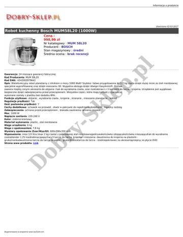 Informacje o produkcie Utworzono 02-03-2017 Robot kuchenny Bosch MUM58L20 (1000W) Cena : 998,99 zł p. pl Nr katalogowy : MUM 58L20 Producent : BOSCH Stan magazynowy : średni Średnia ocena : brak recenzji D ob ry - Sk le Gwarancja: 24 miesiące gwarancji fabrycznej Kod Producenta: MUM 58L20 Kod EAN:: 4242002879642 Opis: Wielofunkcyjny robot planetarny z silnikiem o mocy 1000 Watt! Szybkie i łatwe przygotowanie do 2,7 kg ciasta dzięki dużej misie ze stali nierdzewnej specjalnie wyprofilowanej oraz dzięki mieszaniu 3D. Wygodna obsługa dzięki dźwigni EasyArmLift. Zestaw zawiera między innymi akcesoria do ubijania i hak do wyrabiania ciasta, oraz rozdrabniacz z 3 tarczami do tarcia i krojenia. Urządzenie jest wyjątkowo bezpieczne dzięki zabezpieczeniu przed przeciążeniem. Wszystkie części, które mają kontakt z żywnością wykonane zostały z plastiku bez dodatku BPA. Funkcje użytkowe: ubijanie , wyrabianie ciasta , krojenie , ścieranie , mieszanie planetarne , koktajl Regulacja prędkości: Tak Ilość poziomów prędkości: 7 Cechy dodatkowe: schowek na przewód , otwór w pokrywie do napełniania dodatkami , łagodny rozbieg Zabezpieczenia: ochrona przed przeciążeniem , blokada zwolnienia ramienia stojaka Moc: 1000 W Napięcie zasilania: 220-240 V Kolor: srebrno-kremowy Materiał wykonania: plastik , stal nierdzewna Waga urządzenia: 6 kg Waga z opakowaniem: 7,6 kg Wymiary opakowania (Szer/Wys/Gł): 600x390x350 mm Wyposażenie: misa 3,9 litra (max 2 kg ciasta) z polerowanej stali nierdzewnejpokrywakońcówka ubijającakońcówka mieszającahak do wyrabiania ciastablender 1,25 lrozdrabniaczpopychacz3 tarcze do tarcia, krojenia i mieszania: dwustronna do krojenia na plasterki grubo/cienkodwustronna tarcza do tarcia na wiórki - grubo/drobnotarcza do tarcia - średniopokrowiec na akcesoriaprzepisy na płycie DVD Strona www produktu: Link Wygenerowano w programie www.oscGold.com