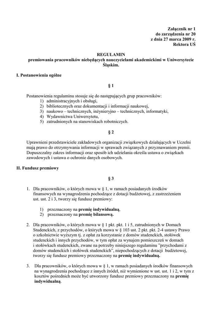 Załącznik nr 1 do zarządzenia nr 20 z dnia 27 marca 2009 r. Rektora UŚ REGULAMIN premiowania pracowników niebędących nauczycielami akademickimi w Uniwersytecie Śląskim. I. Postanowienia ogólne §1 Postanowienia regulaminu stosuje się do następujących grup pracowników: 1) administracyjnych i obsługi, 2) bibliotecznych oraz dokumentacji i informacji naukowej, 3) naukowo – technicznych, inżynieryjno – technicznych, informatyki, 4) Wydawnictwa Uniwersytetu, 5) zatrudnionych na stanowiskach robotniczych. §2 Uprawnieni przedstawiciele zakładowych organizacji związkowych działających w Uczelni mają prawo do otrzymywania informacji w sprawach związanych z przyznawaniem premii. Dopuszczalny zakres informacji oraz sposób ich udzielania określa ustawa o związkach zawodowych i ustawa o ochronie danych osobowych. II. Fundusz premiowy §3 1. Dla pracowników, o których mowa w § 1, w ramach posiadanych środków finansowych na wynagrodzenia pochodzące z dotacji budżetowej, z zastrzeżeniem ust. ust. 2 i 3, tworzy się fundusz premiowy: 1) przeznaczony na premię indywidualną, 2) przeznaczony na premię bilansową. 2. Dla pracowników, o których mowa w § 1 pkt. pkt. 1 i 5, zatrudnionych w Domach Studenckich, z przychodów, o których mowa w § 103 ust. 2 pkt. pkt. 2-4 ustawy Prawo o szkolnictwie wyższym tj. z opłat za korzystanie z domów studenckich, stołówek studenckich i innych przychodów, w tym opłat za wynajem pomieszczeń w domach i stołówkach studenckich, zwane na potrzeby niniejszego regulaminu ”przychodami z domów studenckich i stołówek studenckich”, niepochodzących z dotacji budżetowej, tworzy się fundusz premiowy przeznaczony na premię indywidualną. 3. Dla pracowników, o których mowa w § 1, w ramach posiadanych środków finansowych na wynagrodzenia pochodzące z innych źródeł, niż wymienione w ust. ust. 1 i 2, w tym z kosztów pośrednich może być utworzony fundusz premiowy przeznaczony na premię indywidualną. 4. Środki finansowe: 1) pochodzące z dochodów własnych Uczelni ( przez dochody własne rozumie się ujęte w zatwierdzonym przez Senat planie rzeczowo – finansowym przychody z odpłatności za świadczone usługi edukacyjne oraz przychody z opłat za korzystanie z usług zakwaterowania), 2) stanowiące przychody z domów studenckich i stołówek studenckich, 3) pochodzące z innych źródeł, niż wymienione w pkt. pkt. 1 i 2, w tym z kosztów pośrednich, mogą zostać przeznaczone na premię za zadania dodatkowe. §4 Fundusz premiowy, o którym mowa w § 3 tworzy się w podziale na jednostki organizacyjne, w ramach planu rzeczowo – finansowego Uniwersytetu Śląskiego i przekazuje do dyspozycji kierownikom jednostek, o których mowa w § 6 ust. 1. III. Zasady naliczania funduszu premiowego i przyznawania premii indywidualnej i premii bilansowej 1. Zasady naliczania funduszu premiowego na premię indywidualną §5 1. Naliczenie funduszu premiowego dla pracowników Uczelni na premię indywidualną następuje jeden raz w roku kalendarzowym, uwzględniając stan zatrudnienia w miesiącu naliczenia. 2. Rektor ustala wysokość minimalnego naliczenia funduszu premiowego na premię indywidualną w porozumieniu płacowym, procentowo w stosunku do rocznej sumy wynagrodzeń zasadniczych pracowników, o których mowa w § 1, a każdą zmianę wysokości naliczenia w uzgodnieniu z zakładowymi organizacjami związkowymi. 3. Podstawą do dokonania korekty naliczenia funduszu premiowego na premię indywidualną w trakcie roku jest zmiana wysokości wynagrodzenia zasadniczego pracowników oraz zmiana stanu zatrudnienia spowodowana przyznaniem etatu lub likwidacją etatu. 4. Naliczenie funduszu premiowego na premię indywidualną nie ulega zmniejszeniu w związku z: a) okresami usprawiedliwionej nieobecności pracownika w pracy spowodowanej chorobą własną, opieką nad członkiem rodziny, przebywaniem na zasiłku macierzyńskim, świadczeniem rehabilitacyjnym i odosobnieniem związanym z chorobą zakaźną oraz urlopem bezpłatnym lub wychowawczym, b) vacatem tj. nieobsadzonym stanowiskiem pracy, z tym że czas istnienia vacatu nie może być dłuższy niż 6 miesięcy. 2 5. Kwotę naliczenia funduszu premiowego na premię indywidualną na rok kalendarzowy dla pracowników zatrudnionych w danej jednostce organizacyjnej przekazuje kierownikom jednostek wymienionym w § 6 ust. 1 Dział Płac. 6. Kwotę naliczenia, o której mowa w ust. 5, należy wykorzystać w danym roku kalendarzowym. 7. Podstawą naliczenia premii indywidualnej dla pracownika jest jego wynagrodzenie zasadnicze. 2. Zasady przyznawania premii indywidualnej §6 1. Dysponentami poszczególnych części funduszu premiowego na premię indywidualną są: 1) rektor dla części obejmującej premię dla kanclerza i kwestora oraz prorektor ds. Nauki i Współpracy z Gospodarką dla części obejmującej premię dla pracowników Wydawnictwa, wymienionych w § 10 pkt 2, 2) dziekani wydziałów oraz kierownicy pozostałych jednostek organizacyjnych wymienionych w § 43 Statutu UŚ dla części obejmującej premię dla pracowników danej jednostki organizacyjnej. 2. Premię dla poszczególnych pracowników w ramach kwoty naliczenia podanej przez Dział Płac przyznają miesięcznie kierownicy jednostek, o których mowa ust. 1, na podstawie wniosku bezpośredniego przełożonego pracownika. Wzór wniosku stanowi załącznik nr 1 do niniejszego regulaminu. 3. Premię dla osób będących bezpośrednimi przełożonymi pracowników przyznają kierownicy jednostek, o których mowa ust. 1. 4. Dziekani wydziałów oraz kierownicy pozostałych jednostek organizacyjnych wymienionych w § 43 Statutu UŚ mogą przekazać swoje uprawnienia do przyznawania premii indywidualnej swoim zastępcom – każdy odrębnie w zakresie zwierzchnictwa wynikającego ze struktury organizacyjnej. 5. Premię wypłaca się z dołu w okresach miesięcznych, w miesiącu następującym bezpośrednio p