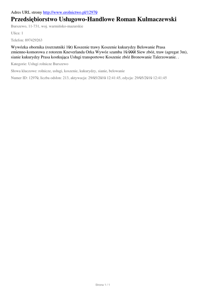Adres URL strony http://www.erolnictwo.pl/12970 Przedsiębiorstwo Usługowo-Handlowe Roman Kulmaczewski Burszewo, 11-731, woj. warmińsko-mazurskie Ulica: 1 Telefon: 897429263 Wywózka obornika (rozrzutniki 10t) Koszenie trawy Koszenie kukurydzy Belowanie Prasa zmienno-komorowa z rotorem Kneverlanda Orka Wywóz szamba 10.000l Siew zbóż, traw (agregat 3m), sianie kukurydzy Prasa kostkująca Usługi transportowe Koszenie zbóż Bronowanie Talerzowanie. . Kategorie: Usługi rolnicze Burszewo Słowa kluczowe: rolnicze, usługi, koszenie, kukurydzy, sianie, belowanie Numer ID: 12970, liczba odsłon: 213, aktywacja: 29/05/2010 12:41:45, edycja: 29/05/2010 12:41:45 Strona 1 / 1