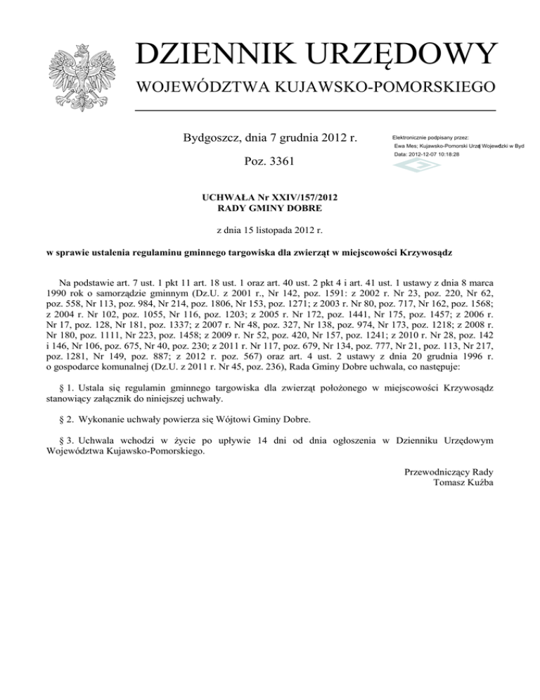 DZIENNIK URZĘDOWY WOJEWÓDZTWA KUJAWSKO-POMORSKIEGO Bydgoszcz, dnia 7 grudnia 2012 r. Elektronicznie podpisany przez: Ewa Mes; Kujawsko-Pomorski Urząd Wojewódzki w Bydgoszcz Poz. 3361 Data: 2012-12-07 10:18:28 UCHWAŁA Nr XXIV/157/2012 RADY GMINY DOBRE z dnia 15 listopada 2012 r. w sprawie ustalenia regulaminu gminnego targowiska dla zwierząt w miejscowości Krzywosądz Na podstawie art. 7 ust. 1 pkt 11 art. 18 ust. 1 oraz art. 40 ust. 2 pkt 4 i art. 41 ust. 1 ustawy z dnia 8 marca 1990 rok o samorządzie gminnym (Dz.U. z 2001 r., Nr 142, poz. 1591: z 2002 r. Nr 23, poz. 220, Nr 62, poz. 558, Nr 113, poz. 984, Nr 214, poz. 1806, Nr 153, poz. 1271; z 2003 r. Nr 80, poz. 717, Nr 162, poz. 1568; z 2004 r. Nr 102, poz. 1055, Nr 116, poz. 1203; z 2005 r. Nr 172, poz. 1441, Nr 175, poz. 1457; z 2006 r. Nr 17, poz. 128, Nr 181, poz. 1337; z 2007 r. Nr 48, poz. 327, Nr 138, poz. 974, Nr 173, poz. 1218; z 2008 r. Nr 180, poz. 1111, Nr 223, poz. 1458; z 2009 r. Nr 52, poz. 420, Nr 157, poz. 1241; z 2010 r. Nr 28, poz. 142 i 146, Nr 106, poz. 675, Nr 40, poz. 230; z 2011 r. Nr 117, poz. 679, Nr 134, poz. 777, Nr 21, poz. 113, Nr 217, poz. 1281, Nr 149, poz. 887; z 2012 r. poz. 567) oraz art. 4 ust. 2 ustawy z dnia 20 grudnia 1996 r. o gospodarce komunalnej (Dz.U. z 2011 r. Nr 45, poz. 236), Rada Gminy Dobre uchwala, co następuje: § 1. Ustala się regulamin gminnego targowiska dla zwierząt położonego w miejscowości Krzywosądz stanowiący załącznik do niniejszej uchwały. § 2. Wykonanie uchwały powierza się Wójtowi Gminy Dobre. § 3. Uchwala wchodzi w życie po upływie 14 dni od dnia ogłoszenia w Dzienniku Urzędowym Województwa Kujawsko-Pomorskiego. Przewodniczący Rady Tomasz Kuźba Dziennik Urzędowy Województwa Kujawsko-Pomorskiego –2– Poz. 3361 załącznik do uchwały nr XXIV/157/2012 Rady Gminy Dobre z dnia 15 listopada 2012 r. REGULAMIN GMINNEGO TARGOWISKA DLA ZWIERZĄT W MIEJSCOWOSCI KRZYWOSĄDZ § 1. Niniejszy regulamin określa zasady korzystania z gminnego targowiska dla zwierząt położonego w miejscowości Krzywosądz, na gruncie stanowiącym własność Gminy Dobre, oznaczonym ewidencyjnie jako działka nr 144/8, zwanym dalej „targowiskiem”. § 2. Handel na targowisku jest dozwolony na zasadach określonych prawem i niniejszym regulaminem. § 3.1. Targowisko jest własnością Gminy Dobre. 2. Teren targowiska wyznaczają tablice z napisem: GMINNE TARGOWISKO DLA ZWIERZĄT. 3. Targowiskiem zarządza Wójt Gminy Dobre. 4. Placem targowym zarządza wyznaczony przez Wójta Gminy Dobre pracownik zwany Administratorem. 5. Administrator zarządza targowiskiem przy pomocy Inkasentów oraz pracowników porządkowych. 6. Inkasenci zbierający opłatę targową będą ubrani w kamizelki o jaskrawym żółtym kolorze z napisem „INKASENT” w kolorze czarnym oraz widocznym identyfikatorem. § 4. Do zadań Administratora targowiska należy: 1. Wyznaczanie sprzedającemu miejsca handlu na targowisku; 2. Kontrolowanie sprzedających pod kątem posiadania dowodu uiszczenia opłaty targowej; 3. Nadzorowanie przestrzegania przepisów niniejszego Regulaminu. § 5.1. Administrator targowiska zobowiązany jest do zapewnienia czystości i porządku na targowisku. 2. Na żądanie Administratora osoby wjeżdżające na teren targowiska są zobowiązane do okazania wwożonego towaru. § 6.1. Uprawnionymi do prowadzenia handlu na targowisku są osoby fizyczne i prawne, które uiściły opłatę targową. 2. Opłata targowa pobierana jest przez Inkasenta przy wjeździe na plac targowy. Dowodem uiszczenia opłaty targowej jest pokwitowanie wystawione przez Inkasenta, które należy zachować do kontroli i posiadać stale przy sobie w miejscu sprzedaży. 3. Wysokość opłaty targowej określa odrębna uchwała Rady Gminy Dobre. 4. Administrator targowiska wywiesza na tablicy ogłoszeń na targowisku regulamin targowiska oraz informację o opłacie targowej. § 7. Na targowisku może być prowadzony wyłącznie handel zwierząt gospodarskich i ptactwa domowego. § 8.1. Prowadzący sprzedaż na targowisku obowiązani są do: 1) znajomości i przestrzegania niniejszego regulaminu, przepisów przeciwpożarowych, sanitarnoepidemiologicznych oraz innych przepisów obowiązujących w obrocie zwierzętami; 2) posiadania przy sobie dokumentu tożsamości oraz innych dokumentów umożliwiających określenie legalności prowadzonej działalności handlowej oraz dokumenty potwierdzające pochodzenie zwierzęcia zgodne z jego oznakowaniem zewnętrznym; 3) utrzymywania czystości w czasie trwania handlu. Po zakończeniu sprzedaży miejsce handlu winno być pozostawione w stanie czystym i uporządkowanym, a odpady i śmieci usunięte do przeznaczonych na ten cel pojemników, usytuowanych w stałym miejscu na terenie placu targowego. 2. Zwierzęta wprowadzane na targowisko powinny odpowiadać wymogom przepisów weterynaryjnych. 3. Na targowisku nie mogą być zwierzęta z obszarów, na których wystąpiła choroba zakaźna. Sprzedający przy wjeździe na plac targowy obowiązani są do okazania administratorowi stosownych dokumentów i świadectw. 4. Zgłoszenia o przypadkach padnięcia zwierzęcia lub zachorowania na terenie targowiska należy niezwłocznie przekazywać Administratorowi targowiska i dyżurującemu lekarzowi weterynarii. Dziennik Urzędowy Województwa Kujawsko-Pomorskiego –3– Poz. 3361 5. Zwierzę podejrzane o chorobę należy niezwłocznie odizolować od zwierząt zdrowych. 6. Narzędzia pomiarowe używane na targowisku powinny posiadać ważną cechę legalizacyjną oraz powinny być ustawione i używane w sposób pozwalający kupującemu stwierdzić prawidłowość i rzetelność ważenia i mierzenia. § 9. Do przeprowadzenia kontroli przestrzegania postanowień niniejszego regulaminu uprawnieni są upoważnieni pracownicy Urzędu Gminy Dobre. § 10. W przypadku uzasadnionej potrzeby Administrator może zmienić godziny otwarcia i zamknięcia placu targowego w danym dniu i z