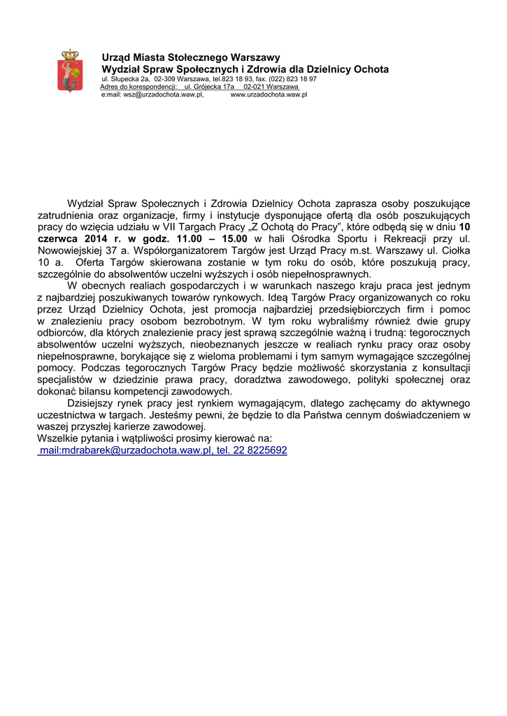 Urząd Miasta Stołecznego Warszawy Wydział Spraw Społecznych i Zdrowia dla Dzielnicy Ochota ul. Słupecka 2a, 02-309 Warszawa, tel.823 18 93, fax. (022) 823 18 97 Adres do korespondencji: ul. Grójecka 17a 02-021 Warszawa e:mail: [email protected], www.urzadochota.waw.pl Wydział Spraw Społecznych i Zdrowia Dzielnicy Ochota zaprasza osoby poszukujące zatrudnienia oraz organizacje, firmy i instytucje dysponujące ofertą dla osób poszukujących pracy do wzięcia udziału w VII Targach Pracy „Z Ochotą do Pracy”, które odbędą się w dniu 10 czerwca 2014 r. w godz. 11.00 – 15.00 w hali Ośrodka Sportu i Rekreacji przy ul. Nowowiejskiej 37 a. Współorganizatorem Targów jest Urząd Pracy m.st. Warszawy ul. Ciołka 10 a. Oferta Targów skierowana zostanie w tym roku do osób, które poszukują pracy, szczególnie do absolwentów uczelni wyższych i osób niepełnosprawnych. W obecnych realiach gospodarczych i w warunkach naszego kraju praca jest jednym z najbardziej poszukiwanych towarów rynkowych. Ideą Targów Pracy organizowanych co roku przez Urząd Dzielnicy Ochota, jest promocja najbardziej przedsiębiorczych firm i pomoc w znalezieniu pracy osobom bezrobotnym. W tym roku wybraliśmy również dwie grupy odbiorców, dla których znalezienie pracy jest sprawą szczególnie ważną i trudną: tegorocznych absolwentów uczelni wyższych, nieobeznanych jeszcze w realiach rynku pracy oraz osoby niepełnosprawne, borykające się z wieloma problemami i tym samym wymagające szczególnej pomocy. Podczas tegorocznych Targów Pracy będzie możliwość skorzystania z konsultacji specjalistów w dziedzinie prawa pracy, doradztwa zawodowego, polityki społecznej oraz dokonać bilansu kompetencji zawodowych. Dzisiejszy rynek pracy jest rynkiem wymagającym, dlatego zachęcamy do aktywnego uczestnictwa w targach. Jesteśmy pewni, że będzie to dla Państwa cennym doświadczeniem w waszej przyszłej karierze zawodowej. Wszelkie pytania i wątpliwości prosimy kierować na: mail:[email protected], tel. 22 8225692