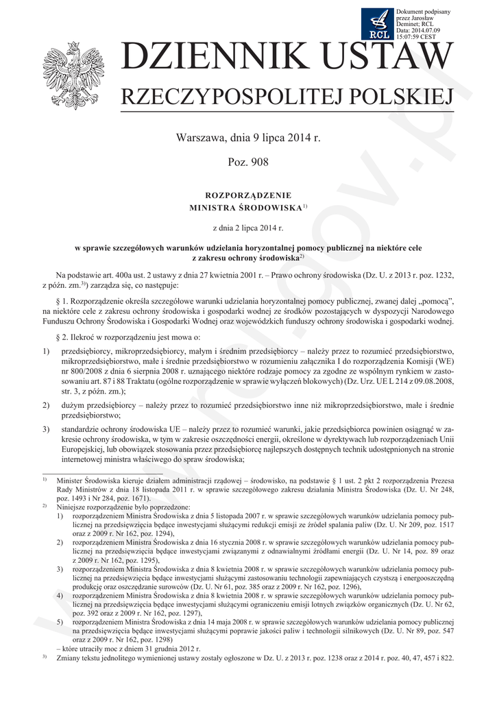 Dokument podpisany przez Jarosław Deminet; RCL Data: 2014.07.09 15:07:59 CEST DZIENNIK USTAW v.p l RZECZYPOSPOLITEJ POLSKIEJ Warszawa, dnia 9 lipca 2014 r. Poz. 908 ROZPORZĄDZENIE MINISTRA ŚRODOWISKA 1) .go z dnia 2 lipca 2014 r. w sprawie szczegółowych warunków udzielania horyzontalnej pomocy publicznej na niektóre cele z zakresu ochrony środowiska2) Na podstawie art. 400a ust. 2 ustawy z dnia 27 kwietnia 2001 r. – Prawo ochrony środowiska (Dz. U. z 2013 r. poz. 1232, z późn. zm.3)) zarządza się, co następuje: § 1. Rozporządzenie określa szczegółowe warunki udzielania horyzontalnej pomocy publicznej, zwanej dalej „pomocą”, na niektóre cele z zakresu ochrony środowiska i gospodarki wodnej ze środków pozostających w dyspozycji Narodowego Funduszu Ochrony Środowiska i Gospodarki Wodnej oraz wojewódzkich funduszy ochrony środowiska i gospodarki wodnej. § 2. Ilekroć w rozporządzeniu jest mowa o: 2) 3) dużym przedsiębiorcy – należy przez to rozumieć przedsiębiorstwo inne niż mikroprzedsiębiorstwo, małe i średnie przedsiębiorstwo; standardzie ochrony środowiska UE – należy przez to rozumieć warunki, jakie przedsiębiorca powinien osiągnąć w zakresie ochrony środowiska, w tym w zakresie oszczędności energii, określone w dyrektywach lub rozporządzeniach Unii Europejskiej, lub obowiązek stosowania przez przedsiębiorcę najlepszych dostępnych technik udostępnionych na stronie internetowej ministra właściwego do spraw środowiska; inister Środowiska kieruje działem administracji rządowej – środowisko, na podstawie § 1 ust. 2 pkt 2 rozporządzenia Prezesa M Rady Ministrów z dnia 18 listopada 2011 r. w sprawie szczegółowego zakresu działania Ministra Środowiska (Dz. U. Nr 248, poz. 1493 i Nr 284, poz. 1671). 2) Niniejsze rozporządzenie było poprzedzone: 1)rozporządzeniem Ministra Środowiska z dnia 5 listopada 2007 r. w sprawie szczegółowych warunków udzielania pomocy publicznej na przedsięwzięcia będące inwestycjami służącymi redukcji emisji ze źródeł spalania paliw (Dz. U. Nr 209, poz. 1517 oraz z 2009 r. Nr 162, poz. 1294), 2)rozporządzeniem Ministra Środowiska z dnia 16 stycznia 2008 r. w sprawie szczegółowych warunków udzielania pomocy publicznej na przedsięwzięcia będące inwestycjami związanymi z odnawialnymi źródłami energii (Dz. U. Nr 14, poz. 89 oraz z 2009 r. Nr 162, poz. 1295), 3)rozporządzeniem Ministra Środowiska z dnia 8 kwietnia 2008 r. w sprawie szczegółowych warunków udzielania pomocy publicznej na przedsięwzięcia będące inwestycjami służącymi zastosowaniu technologii zapewniających czystszą i energooszczędną produkcję oraz oszczędzanie surowców (Dz. U. Nr 61, poz. 385 oraz z 2009 r. Nr 162, poz. 1296), 4)rozporządzeniem Ministra Środowiska z dnia 8 kwietnia 2008 r. w sprawie szczegółowych warunków udzielania pomocy publicznej na przedsięwzięcia będące inwestycjami służącymi ograniczeniu emisji lotnych związków organicznych (Dz. U. Nr 62, poz. 392 oraz z 2009 r. Nr 162, poz. 1297), 5)rozporządzeniem Ministra Środowiska z dnia 14 maja 2008 r. w sprawie szczegółowych warunków udzielania pomocy publicznej na przedsięwzięcia będące inwestycjami służącymi poprawie jakości paliw i technologii silnikowych (Dz. U. Nr 89, poz. 547 oraz z 2009 r. Nr 162, poz. 1298) – które utraciły moc z dniem 31 grudnia 2012 r. 3) Zmiany tekstu jednolitego wymienionej ustawy zostały ogłoszone w Dz. U. z 2013 r. poz. 1238 oraz z 2014 r. poz. 40, 47, 457 i 822. ww 1) przedsiębiorcy, mikroprzedsiębiorcy, małym i średnim przedsiębiorcy – należy przez to rozumieć przedsiębiorstwo, mikroprzedsiębiorstwo, małe i średnie przedsiębiorstwo w rozumieniu załącznika I do rozporządzenia Komisji (WE) nr 800/2008 z dnia 6 sierpnia 2008 r. uznającego niektóre rodzaje pomocy za zgodne ze wspólnym rynkiem w zastosowaniu art. 87 i 88 Traktatu (ogólne rozporządzenie w sprawie wyłączeń blokowych) (Dz. Urz. UE L 214 z 09.08.2008, str. 3, z późn. zm.); w. rcl 1) Dziennik Ustaw –2– Poz. 908 polskim standardzie ochrony środowiska – należy przez to rozumieć warunki, jakie przedsiębiorca ma osiągnąć w zakresie ochrony środowiska, w tym w zakresie oszczędności energii, określone w przepisach prawa polskiego; 5) wartości pomocy – należy przez to rozumieć ekwiwalent dotacji brutto obliczany zgodnie z przepisami rozporządzenia Rady Ministrów z dnia 11 sierpnia 2004 r. w sprawie szczegółowego sposobu obliczania wartości pomocy publicznej udzielanej w różnych formach (Dz. U. Nr 194, poz. 1983, z 2006 r. Nr 183, poz. 1355 oraz z 2009 r. Nr 122, poz. 1008); 6) intensywności pomocy – należy przez to rozumieć stosunek wartości pomocy do kosztów kwalifikujących się do objęcia pomocą. v.p l 4) § 3. Pomoc jest udzielana zgodnie z Wytycznymi wspólnotowymi w sprawie pomocy państwa na ochronę środowiska (Dz. Urz. UE C 82 z 01.04.2008, str. 1), zwanymi dalej „Wytycznymi wspólnotowymi”, oraz z załącznikiem XII do Traktatu o przystąpieniu Rzeczypospolitej Polskiej do Unii Europejskiej. § 4. 1. Pomoc na realizację celów z zakresu ochrony środowiska może być udzielana na: rekultywację terenów zanieczyszczonych substancjami niebezpiecznymi w wyniku działalności człowieka; 2) inwestycje w odnawialne źródła energii lub produkcję biopaliw spełniających kryteria zrównoważonego rozwoju, o których mowa w pkt 1.5.6 Wytycznych wspólnotowych; 3) inwestycje służące wytwarzaniu energii w wysokosprawnej kogeneracji w rozumieniu przepisów ustawy z dnia 10 kwietnia 1997 r. – Prawo energetyczne (Dz. U. z 2012 r. poz. 1059, z późn. zm.4)); 4) inwestycje służące zmniejszeniu zużycia energii; 5) inwestycje związane z ochroną powietrza, powierzchni ziemi, wód powierzchniowych, wód podziemnych lub mające na celu ograniczenie hałasu; 6) inwestycje związane ze zmniejszeniem zapotrzebowania na surowce lub