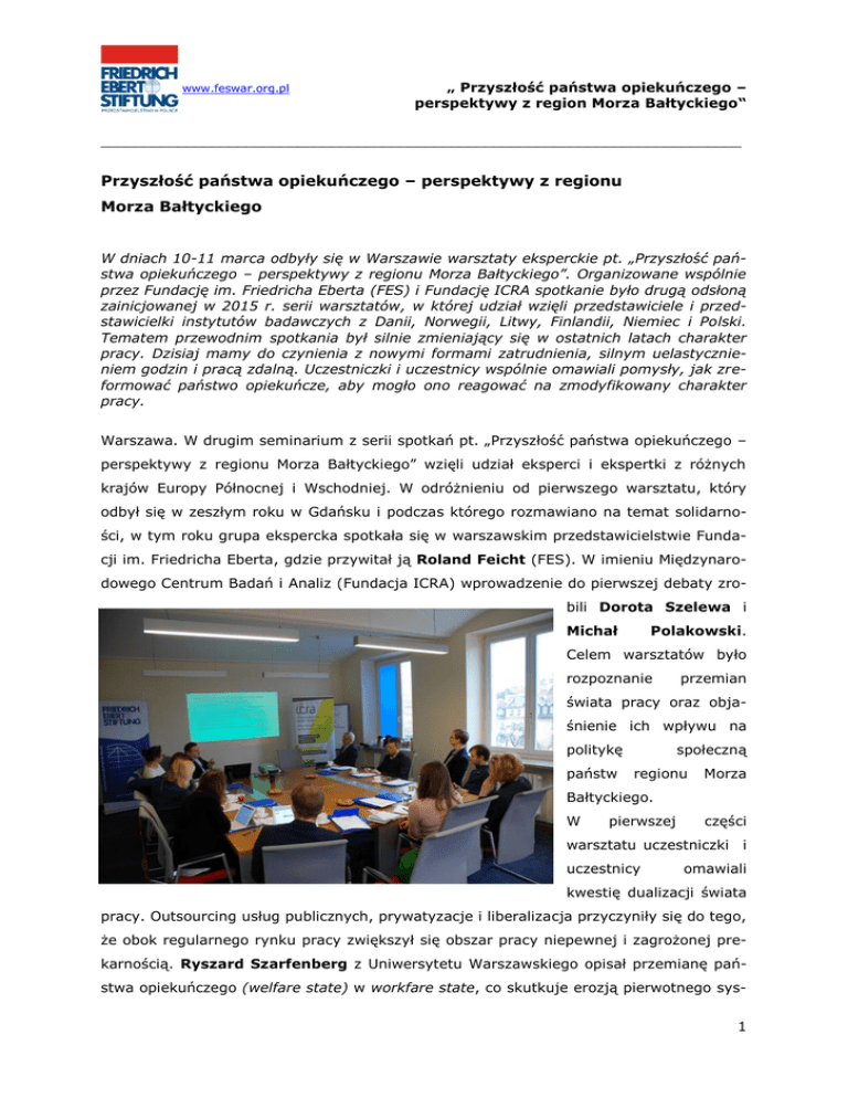 www.feswar.org.pl „ Przyszłość państwa opiekuńczego – perspektywy z region Morza Bałtyckiego“ ___________________________________________________________________________ Przyszłość państwa opiekuńczego – perspektywy z regionu Morza Bałtyckiego W dniach 10-11 marca odbyły się w Warszawie warsztaty eksperckie pt. „Przyszłość państwa opiekuńczego – perspektywy z regionu Morza Bałtyckiego”. Organizowane wspólnie przez Fundację im. Friedricha Eberta (FES) i Fundację ICRA spotkanie było drugą odsłoną zainicjowanej w 2015 r. serii warsztatów, w której udział wzięli przedstawiciele i przedstawicielki instytutów badawczych z Danii, Norwegii, Litwy, Finlandii, Niemiec i Polski. Tematem przewodnim spotkania był silnie zmieniający się w ostatnich latach charakter pracy. Dzisiaj mamy do czynienia z nowymi formami zatrudnienia, silnym uelastycznieniem godzin i pracą zdalną. Uczestniczki i uczestnicy wspólnie omawiali pomysły, jak zreformować państwo opiekuńcze, aby mogło ono reagować na zmodyfikowany charakter pracy. Warszawa. W drugim seminarium z serii spotkań pt. „Przyszłość państwa opiekuńczego – perspektywy z regionu Morza Bałtyckiego” wzięli udział eksperci i ekspertki z różnych krajów Europy Północnej i Wschodniej. W odróżnieniu od pierwszego warsztatu, który odbył się w zeszłym roku w Gdańsku i podczas którego rozmawiano na temat solidarności, w tym roku grupa ekspercka spotkała się w warszawskim przedstawicielstwie Fundacji im. Friedricha Eberta, gdzie przywitał ją Roland Feicht (FES). W imieniu Międzynarodowego Centrum Badań i Analiz (Fundacja ICRA) wprowadzenie do pierwszej debaty zrobili Dorota Szelewa i Michał Polakowski. Celem warsztatów było rozpoznanie przemian świata pracy oraz objaśnienie ich wpływu na politykę państw społeczną regionu Morza Bałtyckiego. W pierwszej części warsztatu uczestniczki i uczestnicy omawiali kwestię dualizacji świata pracy. Outsourcing usług publicznych, prywatyzacje i liberalizacja przyczyniły się do tego, że obok regularnego rynku pracy zwiększył się obszar pracy niepewnej i zagrożonej prekarnością. Ryszard Szarfenberg z Uniwersytetu Warszawskiego opisał przemianę państwa opiekuńczego (welfare state) w workfare state, co skutkuje erozją pierwotnego sys1 www.feswar.org.pl „ Przyszłość państwa opiekuńczego – perspektywy z region Morza Bałtyckiego“ ___________________________________________________________________________ temu. Jednym z problemów, który jest charakterystyczny dla dzisiejszej sytuacji, jest wzrost liczby osób zatrudnionych na podstawie umów na czas określony. Wśród tej grupy pracowniczek i pracowników rośnie odsetek tych, którzy zostali zatrudnieni na z góry określony czas wbrew ich woli. Nie więcej niż 15 procent osób zatrudnionych na czas określony otrzymuje po okresie ich wygaśnięcia stałe zatrudnienie, na co wskazywał kowski. Michał Praca niepewnych kach Polaw warun- oznacza nie- rzadko większą ilość pracy oraz wzmożoną presję na jak najlepsze wyniki. W Norwegii następuje proces zrównania poziomu niepewności osób zatrudnionych na podstawie umów na czas nieokreślony z osobami posiadającymi umowy terminowe, których liczba w ostatnich latach również znacznie wzrosła, opisała Åshild Olaussen z norweskiej konfederacji związków zawodowych Unio. Merja Jutila Roon z Fundacji im. Kaleviego Sorsy odnotowała, że podobny trend można zaobserwować w Finlandii od lat 90. XX wieku. Zdaniem Margarity Jankauskaité z Uniwersytetu Wileńskiego oraz Vaidy Tretjakovej z Litewskiego Centrum Badań Społecznych sytuacja na litewskim rynku pracy jest stabilna. W najbliższych latach istnieje jednakże duże prawdopodobieństwo zmian, co wynika z tego, iż rząd kieruje się zaleceniami ekspertów zainspirowanych doktryną New Public Management. Ceną wysokiej elastyczności jest utrata bezpieczeństwa. Pozostaje mniej czasu na szkolenia, samodzielne wdrożenie do pracy, naukę i odpoczynek. Ekspertki i eksperci byli zgodni, że nowa sytuacja jest – poza małymi wyjątkami – wspólna dla wszystkich państw regionu. Istotne dla przyszłości państwa opiekuńczego jest pytanie, czy powinniśmy dopasować politykę do nowej sytuacji, a więc ją zaakceptować, czy ją zwalczać. Badania potwierdzają, że dalsza deregulacja na rzecz jeszcze większej elastyczności nie zmniejszy poziomu dualizacji. Podczas drugiej części warsztatu dyskutowano na temat pracy nieformalnej i kwestii uznania prac domowych, takich jak np. zakupy, gotowanie albo opieka nad dziećmi. Do2 www.feswar.org.pl „ Przyszłość państwa opiekuńczego – perspektywy z region Morza Bałtyckiego“ ___________________________________________________________________________ rota Szelewa przedstawiła dane dot. podziału prac domowych między kobietami a mężczyznami – w szczególności w przypadku Polski widoczne są duże różnice w dystrybucji zadań. Uczestniczki i uczestnicy omawiali także działania poszczególnych państw, które miały na celu zwiększenie zaangażowania mężczyzn w prace domowe, np. poprzez możliwość przejścia na urlop rodzicielski. Ekspertki i eksperci byli zgodni co do tego, aby nie wypłacać dodatkowego zasiłku matkom, które decydują się na to, aby nie wysyłać swoich podopiecznych do przedszkoli i opiekować się nimi w domu, uznając to działanie za niepotrzebne wzmocnienie tradycyjnego podziału ról. Równouprawnienie płci jest powiązane z sytuacją i możliwościami ekonomicznymi, w związku z czym instytucje opieki nad dzieckiem i edukacji powinny być bezpłatne i ogólnodostępne. Działania na rzecz zwiększenia dostępności żłobków i przedszkoli oraz zaoferowanie ojcom możliwości opieki nad dziećmi w domu bez wynikających z tego niedogodności w życiu zawodowym, wydają się koniecznie w kontekście wspomnianych wyżej przemian świata pracy. Wart