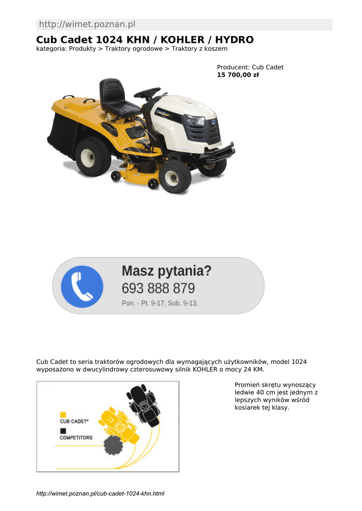http://wimet.poznan.pl Cub Cadet 1024 KHN / KOHLER / HYDRO kategoria: Produkty > Traktory ogrodowe > Traktory z koszem Producent: Cub Cadet 15 700,00 zł Cub Cadet to seria traktorów ogrodowych dla wymagających użytkowników, model 1024 wyposażono w dwucylindrowy czterosuwowy silnik KOHLER o mocy 24 KM. http://wimet.poznan.pl/cub-cadet-1024-khn.html Promień skrętu wynoszący ledwie 40 cm jest jednym z lepszych wyników wśród kosiarek tej klasy. Zbiornik paliwa z wskaźnikiem zawartości pozwala na ciągłą kontrolę poziomu paliwa z pozycji operatora. Niezwykle duży 10 litrowy zbiornik może być napełniany bez konieczności podnoszenia maski, wlew umieszczony pod kątem ułatwia napełnianie i chroni przed rozlaniem. Seria CC charakteryzuje się jedynym na rynku i łatwym w obsłudze systemem wstecznego koszenia REV-TEC, który można uruchomić po wciśnięciu pojedynczego przycisku obok stacyjki, bez konieczności jego ciągłego przytrzymywania, co ma miejsce u konkurencyjnych rozwiązań. SPECYFIKACJA Silnik Moc silnika KOHLER 7000 14.5 kW (przy 2400 obr./min.) Pojemność / Ilość cylindrów 725 cc / 2 105 cm / 2 noże 20-120 mm Ręczna, 12 poziomów koszenia Hydrostatyczna Pasek klinowy 15x6.50" / 20x8.00" 40 cm Szerokość cięcia Wysokość cięcia Regulacja wysokości cięcia Przekładnia Przeniesienie napędu Średnica kół (p/t) Promień skrętu Elementy dodatkowe: - Ciśnieniowe smarowanie silnika - Żeliwna oś przednia - Solidny podwójny zderzak przedni - Licznik motogodzin - Łożyskowane koła jezdne - Regulacja siedziska http://wimet.poznan.pl/cub-cadet-1024-khn.html Deflektor Zaślepka mieląca Pojemność / Opróżnianie kosza Waga Gwarancja producenta - RevTEK - koszenie podczas cofania - Szybkozłączki do mycia deka Opcja* Opcja* 350 L / Elektrycznie 240 kg 3 lata http://wimet.poznan.pl/cub-cadet-1024-khn.html
