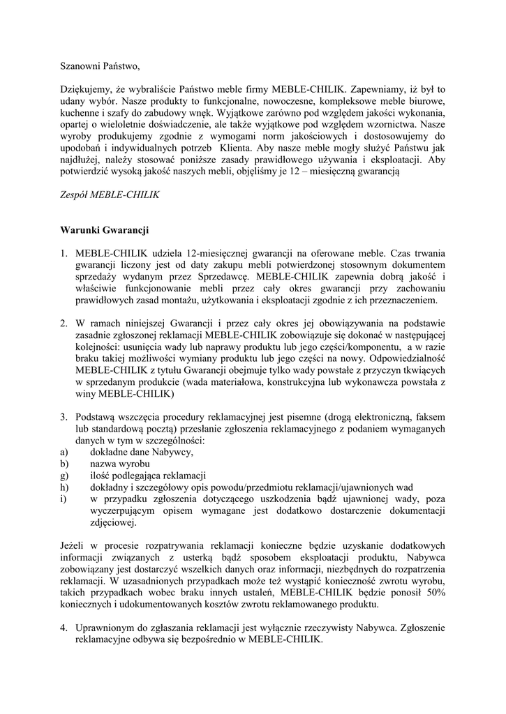 Szanowni Państwo, Dziękujemy, że wybraliście Państwo meble firmy MEBLE-CHILIK. Zapewniamy, iż był to udany wybór. Nasze produkty to funkcjonalne, nowoczesne, kompleksowe meble biurowe, kuchenne i szafy do zabudowy wnęk. Wyjątkowe zarówno pod względem jakości wykonania, opartej o wieloletnie doświadczenie, ale także wyjątkowe pod względem wzornictwa. Nasze wyroby produkujemy zgodnie z wymogami norm jakościowych i dostosowujemy do upodobań i indywidualnych potrzeb Klienta. Aby nasze meble mogły służyć Państwu jak najdłużej, należy stosować poniższe zasady prawidłowego używania i eksploatacji. Aby potwierdzić wysoką jakość naszych mebli, objęliśmy je 12 – miesięczną gwarancją Zespół MEBLE-CHILIK Warunki Gwarancji 1. MEBLE-CHILIK udziela 12-miesięcznej gwarancji na oferowane meble. Czas trwania gwarancji liczony jest od daty zakupu mebli potwierdzonej stosownym dokumentem sprzedaży wydanym przez Sprzedawcę. MEBLE-CHILIK zapewnia dobrą jakość i właściwie funkcjonowanie mebli przez cały okres gwarancji przy zachowaniu prawidłowych zasad montażu, użytkowania i eksploatacji zgodnie z ich przeznaczeniem. 2. W ramach niniejszej Gwarancji i przez cały okres jej obowiązywania na podstawie zasadnie zgłoszonej reklamacji MEBLE-CHILIK zobowiązuje się dokonać w następującej kolejności: usunięcia wady lub naprawy produktu lub jego części/komponentu, a w razie braku takiej możliwości wymiany produktu lub jego części na nowy. Odpowiedzialność MEBLE-CHILIK z tytułu Gwarancji obejmuje tylko wady powstałe z przyczyn tkwiących w sprzedanym produkcie (wada materiałowa, konstrukcyjna lub wykonawcza powstała z winy MEBLE-CHILIK) 3. Podstawą wszczęcia procedury reklamacyjnej jest pisemne (drogą elektroniczną, faksem lub standardową pocztą) przesłanie zgłoszenia reklamacyjnego z podaniem wymaganych danych w tym w szczególności: a) dokładne dane Nabywcy, b) nazwa wyrobu g) ilość podlegająca reklamacji h) dokładny i szczegółowy opis powodu/przedmiotu reklamacji/ujawnionych wad i) w przypadku zgłoszenia dotyczącego uszkodzenia bądź ujawnionej wady, poza wyczerpującym opisem wymagane jest dodatkowo dostarczenie dokumentacji zdjęciowej. Jeżeli w procesie rozpatrywania reklamacji konieczne będzie uzyskanie dodatkowych informacji związanych z usterką bądź sposobem eksploatacji produktu, Nabywca zobowiązany jest dostarczyć wszelkich danych oraz informacji, niezbędnych do rozpatrzenia reklamacji. W uzasadnionych przypadkach może też wystąpić konieczność zwrotu wyrobu, takich przypadkach wobec braku innych ustaleń, MEBLE-CHILIK będzie ponosił 50% koniecznych i udokumentowanych kosztów zwrotu reklamowanego produktu. 4. Uprawnionym do zgłaszania reklamacji jest wyłącznie rzeczywisty Nabywca. Zgłoszenie reklamacyjne odbywa się bezpośrednio w MEBLE-CHILIK. 5. Czas rozpatrywania reklamacji wynosi 7 dni roboczych od daty wpłynięcia reklamacji do MEBLE-CHILIK. 6. Klient zostanie niezwłocznie poinformowany o przyjęciu bądź odrzuceniu reklamacji. W wyjątkowych przypadkach wymagających np. wizyty u Nabywcy w celu oględzin i oceny zasadności reklamacji Nabywca zostanie powiadomiony o podjętych w związku z reklamacją działaniach. Nabywca może w każdym czasie uzyskać informację o stanie realizowanej reklamacji pod numerem telefonu 13 43 535 35. 7. MEBLE-CHILIK dostarczy komponenty zamienne i dokona naprawy lub dokona wymiany produktów lub ich komponentów na nowe wolne od wad dla wszystkich produktów, które zostaną zareklamowane zgodnie z opisaną tu procedurą i uznane przez MEBLE-CHILIK za produkty zareklamowane zasadnie. Wymiana reklamowanego produktu na nowy będzie możliwa po bezskutecznych próbach naprawy lub wymiany wadliwych komponentów danego produktu, chyba że co innego będzie wynikało z odrębnej umowy. 8. Gwarancją nie są objęte: − naturalne zużycie produktu, w tym także naturalne starzenie się lub odbarwianie się wskutek oddziaływania światła; − mechaniczne uszkodzenie produktu powstałe po jego wydaniu przez MEBLE-CHILIK; − wady spowodowane niewłaściwym użytkowaniem, niewłaściwym przechowywaniem lub niewłaściwą konserwacją, a w przypadku produktów, do których załączona jest instrukcja montażu lub instrukcja użytkowania produktu, również wady spowodowane działaniami niezgodnymi z tymi instrukcjami; − produkty po jakichkolwiek modyfikacjach i zmianach konstrukcyjnych oraz naprawach dokonanych przez osoby nieuprawnione (przez osoby uprawnione rozumie się pracowników MEBLE-CHILIK); − uszkodzenie, zniszczenie, utrata lub zmniejszenie funkcjonalności produktu, wynikłe z innych przyczyn niż wady tkwiące w produkcie; − wady i uszkodzenia w następstwie których obniżono cenę wyrobu przy jego zakupie; − szkody i usterki spowodowane przez zwierzęta. − uszkodzeń powstałych w wyniku niewłaściwego oraz nieostrożnego przewozu, czy przenoszenia mebli (chyba że przewóz lub przenoszenie były wykonywane przez MEBLE-CHILIK), 9. Reklamacje dotyczące opisanych powyżej kwestii będą traktowane jako bezzasadne i nie będą uznawane. 10. Zasięg terytorialny gwarancji obejmuje wyłącznie kraj będący siedzibą MEBLE-CHILIK. 11. Gwarancja udzielona jest zgodnie z prawem polskim i podlega wyłącznie prawu polskiemu. W sprawach nie uregulowanych niniejszymi warunkami gwarancji mają zastosowanie odpowiednie przepisy prawa polskiego, w szczególności Kodeksu cywilnego. Wszelkie spory powstałe na gruncie niniejszej gwarancji poddane są wyłącznie właściwości sądów w Polsce. Gwarancja na sprzedany towar nie wyłącza, nie ogranicza ani nie zawiesza uprawnień Nabywcy będącego Konsumentem wynikających z niezgodności towaru z umową. Instrukcja prawidłowego użytkowania i zasady eksploatacji Mebli 1. Meble należy użytkować zgodnie z ich przeznaczeniem. Należy zawsze stosować się do zasad umieszczonych w instrukcjach m