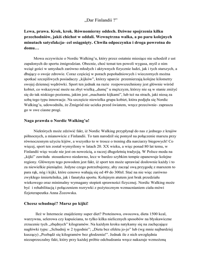 „Dar Finlandii ?” Lewa, prawa. Krok, krok. Równomierny oddech. Dziwne spojrzenia kilku przechodniów, jakiś chichot w oddali. Wewnętrzna walka, a po paru kolejnych minutach satysfakcja- cel osiągnięty. Chwila odpoczynku i droga powrotna do domu… Mowa oczywiście o Nordic Walking’u, który przez ostatnie miesiące nie schodził z ust zapalonych do sportu żmigrodzian. Obecnie, choć temat ten powoli wygasa, myśl o nim wciąż gości w umysłach zarówno młodych i aktywnych fizycznie ludzi, jak i tych starszych, a dbający o swoje zdrowie. Coraz częściej w porach popołudniowych i wieczornych można spotkać szczęśliwych posiadaczy „kijków”, którzy uparcie przemierzają kolejne kilometry swojej dziennej wędrówki. Sport ten jednak na razie rozpowszechniony jest głównie wśród kobiet, co wskazywać może na zbyt wielką „dumę” u mężczyzn, którzy nie są w stanie zniżyć się do tak niskiego poziomu, jakim jest „machanie kijkami”, lub też na strach, jaki niosą za sobą tego typu innowacje. Na szczęście niewielka grupa kobiet, która podjęła się Nordic Walking’u, udowodniła, że Żmigród nie ucieka przed światem, wręcz przeciwnie- zaprasza go w swe ciasne progi. Naga prawda o Nordic Walking’u! Niektórych może zdziwić fakt, iż Nordic Walking przypłynął do nas z jednego z krajów północnych, a mianowicie z Finlandii. To tam narodził się pomysł na połączenie marszu przy równoczesnym użyciu kijów, a wszystko to w trosce o trening dla narciarzy biegowych! Co więcej, sport ten został wymyślony w latach 20. XX wieku, a więc ponad 80 lat temu, w Finlandii więc wcale nie jest on nowością, a raczej długoletnią tradycją. W Polsce moda na „kijki” zawitała stosunkowo niedawno, lecz w bardzo szybkim tempie opanowuje kolejne regiony. Głównym tego powodem jest fakt, iż sport ten może uprawiać dosłownie każdy i to za niewielkie pieniądze. Jedyne czego potrzebujemy, aby zacząć swą przygodę z marszem to para rąk, nóg i kijki, które cenowo wahają się od 49 do 300zł. Stać na nie więc zarówno zwykłego śmiertelnika, jak i fanatyka sportu. Kolejnym atutem jest brak przedziału wiekowego oraz minimalny wymagany stopień sprawności fizycznej. Nordic Walking może być i rehabilitacją i połączeniem rozrywki z pożytecznym wzmacnianiem ciała-mówi fizjoterapeutka Anna Żozowska. Chcesz schudnąć? Marsz po kijki! Ileż w Internecie znajdziemy super diet? Proteinowa, owocowa, dieta 1500 kcal, warzywna, selerowa czy kapuściana, to tylko kilka nielicznych sposobów na błyskawiczne zrzucenie tych „zbędnych” kilogramów. Na każdym kroku natykamy się na zachęcające nagłówki typu: „Schudnij w 2 tygodnie”; „Dieta bez efektu jo-jo” lub (wg mnie najbardziej kuszący) „Pozbądź się kilogramów bez głodzenia!”. Jednak ile z nich uwzględnia niezaprzeczalny fakt, który przy każdej próbie odchudzania wręcz nakazuje wzmożoną aktywność fizyczną? W końcu ile z nas, kobiet często z ogromną nadwyżką kompleksów i równie wielką niechęcią do żmudnych ćwiczeń wybierze katowanie się, zamiast bezbolesnej cud diety? Nie dajmy się zwieść! Nie idźmy za głosem naszej słabości, idźmy za głosem rozumu. Są sposoby, które umożliwiają osiągnięcie zamierzonego celu bez odwoływania się do radykalnych środków. Jednym z tych sposobów jest właśnie Nordic Walking. - Od kiedy 8 miesięcy temu zaczęłam uprawiać Nordic Walking, schudłam prawie 13 kilo, bez rezygnowania z ulubionych potraw- stwierdza pani Jowita, jedna z fanek finlandzkiego sportu.- Dzięki codziennym spacerom czuję się coraz lepiej, już nie pamiętam kiedy ostatni raz skarżyłam się na bóle mięśni czy stawów, co jeszcze niedawno zdawało się być niemożliwe. Przyznaję, że początki nie były łatwe. Koleżanki z pracy, widząc mnie na ulicy podczas treningu wyśmiały to nietypowe widowisko mówiąc: „Te kijki i tak niewiele ci już pomogą”, jednak po 2 miesiącach zawstydzone przyznały mi rację i same zaopatrzyły się w sprzęt, aby również zacząć ćwiczyć.- wspomina śmiejąc się pani Jowita. Nordic Walking jest więc nie tylko dobrym sposobem na prawidłowe schudnięcie, ale i również na poprawienie ogólnej kondycji zdrowotnej, co chwalą sobie szczególnie osoby starsze-dodaje z przekonaniem. Książki, zeszyty i…kijki? Jak się okazuje północny sport nie jest już tylko indywidualną sprawą każdego z nas. Od niedawna w Żmigrodzie można zauważyć grupki gimnazjalistów, którzy w godzinach lekcyjnych maszerują z kijkami. Fatamorgana? Nie! Również uczniowie z Gimnazjum im. Macieja Rataja, mieszczącym się przy ulicy Sienkiewicza 6 biorą udział w nowości sportowej jaką jest Nordic Walking, a to wszystko całkowicie bezpłatnie, w ramach lekcji wf-u. - Nordic Walking? Myślę, że to dobry sposób na urozmaicenie naszych zajęć. Mamy okazję trochę poruszać się na świeżym powietrzu przy (tak naprawdę) minimalnym wysiłku. To czysta przyjemność.-komentuje Karolina, jedna z uczennic gimnazjum. Nieco inne zdanie mają na ten temat chłopcy.- To strata czasu- stwierdza Tomek, z niemałym grymasem na twarzy- te kijki to sport dla mięczaków, nigdy nie dam się na to namówić- po czym odchodzi, by kontynuować grę w piłkę nożną. Wśród płci męskiej znalazł się jednak ktoś, kto obronił honor mężczyzn, wykazując wyrozumiałość, a nawet chęć spróbowania zmierzenia się z tą dyscypliną- Nigdy tego nie próbowałem, ale myślę, że to dobry sposób na trening swojego ciała. Wkońcu narciarze biegowi uprawiają ten sport przez cały rok, aby nie wypaść z kondycji, więc dlaczego nie? Słyszałem o Noric Walking’u wiele dobrych rzeczy: nie obciąża kręgosłupa, stawu skokowego, biodrowego i kolanowego, odpręża, koryguje postawę a do tego można go uprawiać na każdym terenie- zachwala i dodaje z entuzjazmem- dzisiaj idę na ki
