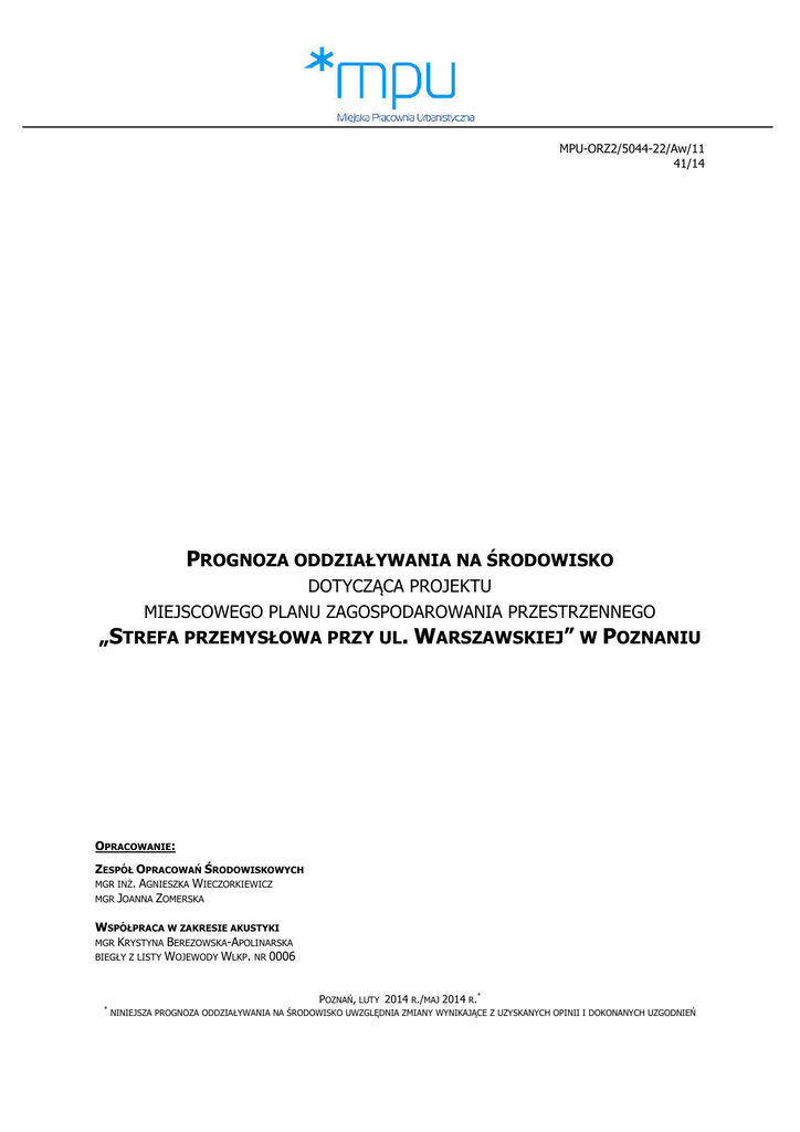 MPU-ORZ2/5044-22/Aw/11 41/14 PROGNOZA ODDZIAŁYWANIA NA ŚRODOWISKO DOTYCZĄCA PROJEKTU MIEJSCOWEGO PLANU ZAGOSPODAROWANIA PRZESTRZENNEGO „STREFA PRZEMYSŁOWA PRZY UL. WARSZAWSKIEJ” W POZNANIU OPRACOWANIE: ZESPÓŁ OPRACOWAŃ ŚRODOWISKOWYCH MGR INŻ. AGNIESZKA WIECZORKIEWICZ MGR JOANNA ZOMERSKA WSPÓŁPRACA W ZAKRESIE AKUSTYKI KRYSTYNA BEREZOWSKA-APOLINARSKA BIEGŁY Z LISTY WOJEWODY WLKP. NR 0006 MGR POZNAŃ, LUTY 2014 R./MAJ 2014 R.* * NINIEJSZA PROGNOZA ODDZIAŁYWANIA NA ŚRODOWISKO UWZGLĘDNIA ZMIANY WYNIKAJĄCE Z UZYSKANYCH OPINII I DOKONANYCH UZGODNIEŃ PROGNOZA ODDZIAŁYWANIA NA ŚRODOWISKO DOTYCZĄCA PROJEKTU MPZP „STREFA PRZEMYSŁOWA PRZY UL. WARSZAWSKIEJ” W POZNANIU SPIS TREŚCI 1. 2. 3. 4. 5. 6. 7. 8. 9. WPROWADZENIE ............................................................................................................................................... 3 1.1. Informacje wstępne .......................................................................................................................................... 3 1.2. Podstawy formalno-prawne opracowania ........................................................................................................... 3 1.3. Cel i zakres merytoryczny opracowania .............................................................................................................. 3 1.4. Wykorzystane materiały i metody pracy ............................................................................................................. 4 CHARAKTERYSTYKA ORAZ STAN ŚRODOWISKA PRZYRODNICZEGO ................................................................ 8 2.1. Położenie, użytkowanie i zagospodarowanie terenu ............................................................................................ 8 2.2. Rzeźba terenu .................................................................................................................................................. 9 2.3. Budowa geologiczna i warunki gruntowe .......................................................................................................... 10 2.4. Zasoby naturalne ............................................................................................................................................ 10 2.5. Warunki wodne .............................................................................................................................................. 10 2.6. Szata roślinna ................................................................................................................................................. 12 2.7. Zwierzęta ....................................................................................................................................................... 13 2.8. Gleby ............................................................................................................................................................. 14 2.9. Klimat lokalny ................................................................................................................................................. 14 2.10. Obszary cenne kulturowo ................................................................................................................................ 15 2.11. Jakość powietrza atmosferycznego .................................................................................................................. 16 2.12. Klimat akustyczny ........................................................................................................................................... 19 2.13. Jakość wód .................................................................................................................................................... 23 ISTNIEJĄCE PROBLEMY OCHRONY ŚRODOWISKA ISTOTNE Z PUNKTU WIDZENIA REALIZACJI PROJEKTU PLANU, W SZCZEGÓLNOŚCI DOTYCZĄCE OBSZARÓW CHRONIONYCH NA PODSTAWIE USTAWY O OCHRONIE PRZYRODY ....................................................................................................................................................... 25 INFORMACJA O GŁÓWNYCH CELACH I ZAWARTOŚCI PROJEKTU PLANU ....................................................... 26 4.1. Cel opracowania projektu planu ....................................................................................................................... 26 4.2. Ustalenia projektu planu ................................................................................................................................. 27 4.3. Powiązanie ustaleń projektu planu z innymi dokumentami ................................................................................. 29 4.4. Potencjalne zmiany stanu środowiska w przypadku braku realizacji ustaleń projektu planu .................................. 30 CELE OCHRONY ŚRODOWISKA USTANOWIONE NA SZCZEBLU MIĘDZYNARODOWYM, KRAJOWYM I LOKALNYM ISTOTNE Z PUNKTU WIDZENIA PROJEKTOWANEGO DOKUMENTU .............................................. 31 PRZEWIDYWANE ODDZIAŁYWANIA USTALEŃ PROJEKTU PLANU NA ŚRODOWISKO ..................................... 33 6.1. Oddziaływanie na powierzchnię ziemi............................................................................................................... 33 6.2. Oddziaływanie na wody powierzchniowe i podziemne ....................................................................................... 36 6.3. Oddziaływanie na zasoby naturalne ................................................................................................................. 38 6.4. Oddziaływanie na różnorodność biologiczną ..................................................................................................... 38 6.5. Oddziaływanie na szatę roślinną ...................................................................................................................... 39 6.6. Oddziaływanie na zwierzęta........................................