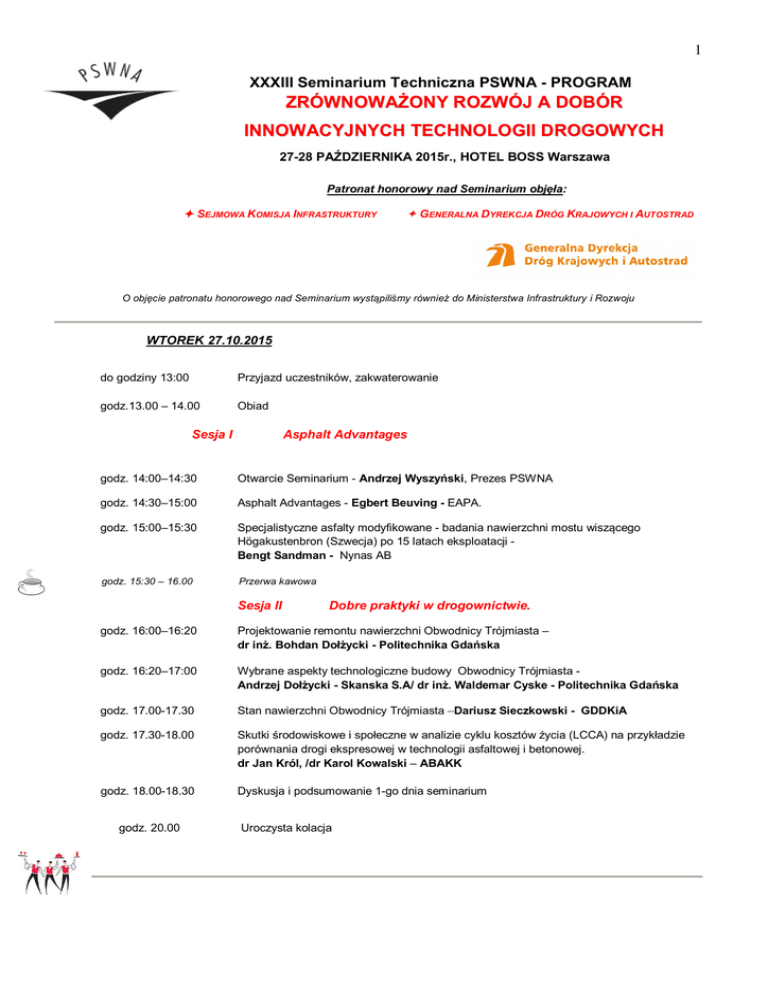 1 XXXIII Seminarium Techniczna PSWNA - PROGRAM ZRÓWNOWAŻONY ROZWÓJ A DOBÓR INNOWACYJNYCH TECHNOLOGII DROGOWYCH 27-28 PAŹDZIERNIKA 2015r., HOTEL BOSS Warszawa Patronat honorowy nad Seminarium objęła: SEJMOWA KOMISJA INFRASTRUKTURY GENERALNA DYREKCJA DRÓG KRAJOWYCH I AUTOSTRAD O objęcie patronatu honorowego nad Seminarium wystąpiliśmy również do Ministerstwa Infrastruktury i Rozwoju WTOREK 27.10.2015 do godziny 13:00 Przyjazd uczestników, zakwaterowanie godz.13.00 – 14.00 Obiad Sesja I Asphalt Advantages godz. 14:00–14:30 Otwarcie Seminarium - Andrzej Wyszyński, Prezes PSWNA godz. 14:30–15:00 Asphalt Advantages - Egbert Beuving - EAPA. godz. 15:00–15:30 Specjalistyczne asfalty modyfikowane - badania nawierzchni mostu wiszącego Högakustenbron (Szwecja) po 15 latach eksploatacji Bengt Sandman - Nynas AB godz. 15:30 – 16.00 Przerwa kawowa Sesja II Dobre praktyki w drogownictwie. godz. 16:00–16:20 Projektowanie remontu nawierzchni Obwodnicy Trójmiasta – dr inż. Bohdan Dołżycki - Politechnika Gdańska godz. 16:20–17:00 Wybrane aspekty technologiczne budowy Obwodnicy Trójmiasta Andrzej Dołżycki - Skanska S.A/ dr inż. Waldemar Cyske - Politechnika Gdańska godz. 17.00-17.30 Stan nawierzchni Obwodnicy Trójmiasta –Dariusz Sieczkowski - GDDKiA godz. 17.30-18.00 Skutki środowiskowe i społeczne w analizie cyklu kosztów życia (LCCA) na przykładzie porównania drogi ekspresowej w technologii asfaltowej i betonowej. dr Jan Król, /dr Karol Kowalski – ABAKK godz. 18.00-18.30 Dyskusja i podsumowanie 1-go dnia seminarium godz. 20.00 Uroczysta kolacja 2 ŚRODA 28.10.2015 godz. 08:00–09:30 Śniadanie (dla uczestników z noclegiem) Sesja III Nowe technologie – innowacje materiałowe Ekologia (recykling) i Ochrona Środowiska godz. 09:30–10:00 Efekt reaktywnego chemicznie silanu, dodatku adhezyjnego asfalt-kruszywo – prof. Dariusz Sybilski - IBDiM godz. 10:00–-10:30 System „Projektuj i buduj” – mocne i słabe strony -dr inż. Tadeusz Suwara – Transprojekt Warszawa godz. 10:30–-11:00 Energooszczędne i przyjazne dla środowiska naturalnego nawierzchnie asfaltowe – prof. Marek Iwański - Politechnika Świętokrzyska godz. 11:00–11:30 Technologie przeciwspękaniowe dla nawierzchni asfaltowych Jacek Boratyński/Przemysław Ostrowski - Eurovia Polska godz. 11:30–12:00 Asfalty do specjalnych zastosowań - Paweł Czajkowski - LOTOS Asfalt godz. 12.00–12:15 Przepisy techniczne – informacja o postępie prac - Zbigniew Krupa -PSWNA godz. 12:15 –13:00 Podsumowanie i zamknięcie obrad godz. 13:00 Obiad PSWNA zastrzega sobie prawo do zmian w programie. SPONSOR GŁÓWNY SPONSOR PATRONAT MEDIALNY
