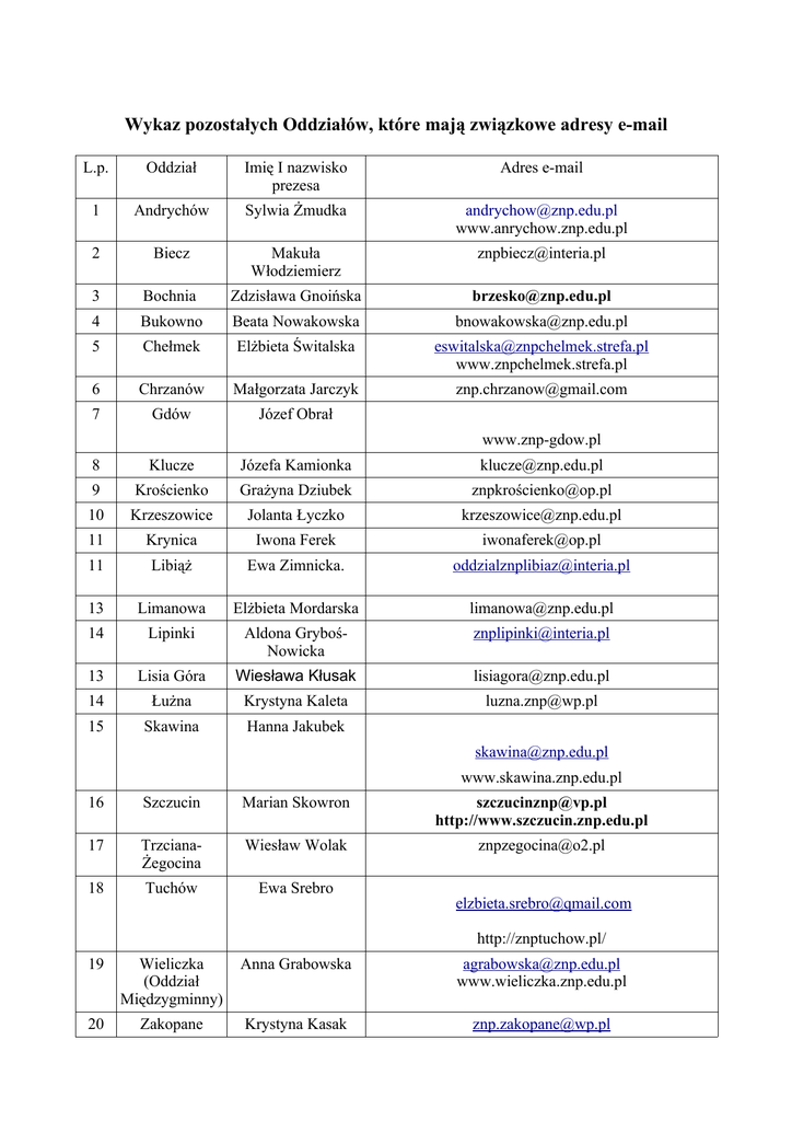Wykaz pozostałych Oddziałów, które mają związkowe adresy e-mail L.p. Oddział Imię I nazwisko prezesa Adres e-mail 1 Andrychów Sylwia Żmudka [email protected] www.anrychow.znp.edu.pl 2 Biecz Makuła Włodziemierz [email protected] 3 Bochnia Zdzisława Gnoińska [email protected] 4 Bukowno Beata Nowakowska [email protected] 5 Chełmek Elżbieta Świtalska [email protected] www.znpchelmek.strefa.pl 6 Chrzanów Małgorzata Jarczyk [email protected] 7 Gdów Józef Obrał www.znp-gdow.pl 8 Klucze Józefa Kamionka [email protected] 9 Krościenko Grażyna Dziubek znpkroś[email protected] 10 Krzeszowice Jolanta Łyczko [email protected] 11 Krynica Iwona Ferek [email protected] 11 Libiąż Ewa Zimnicka. [email protected] 13 Limanowa Elżbieta Mordarska [email protected] 14 Lipinki Aldona GrybośNowicka [email protected] 13 Lisia Góra Wiesława Kłusak [email protected] 14 Łużna Krystyna Kaleta [email protected] 15 Skawina Hanna Jakubek [email protected] www.skawina.znp.edu.pl 16 Szczucin Marian Skowron [email protected] http://www.szczucin.znp.edu.pl 17 TrzcianaŻegocina Wiesław Wolak [email protected] 18 Tuchów Ewa Srebro [email protected] http://znptuchow.pl/ 19 Wieliczka (Oddział Międzygminny) Anna Grabowska [email protected] www.wieliczka.znp.edu.pl 20 Zakopane Krystyna Kasak [email protected]
