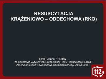 RESUSCYTACJA KRĄŻENIOWO – ODDECHOWA (RKO) CPR Poznań, 12/2015 (na podstawie wytycznych Europejskiej Rady Resuscytacji (ERC) i Amerykańskiego Towarzystwa Kardiologicznego (AHA) 2015) Wiadomości podstawowe • Nagłe zatrzymanie krążenia jest główną przyczyną śmierci w Europie • Dochodzi do 350 – 700 tys. NZK w roku • Szanse przeżycia maleją o 10 – 12% z każdą minutą opóźniającą defibrylację • Szanse maleją wolniej o 3 – 4% jeśli świadkowie podejmą RKO • RKO w połączeniu z defibrylacją w czasie 3 – 5 minut od NZK może skutkować przeżywalnością na poziomie 50 – 70% • Podjęcie RKO przez świadków zdarzenia może powodować 2 – 3 krotny wzrost przeżywalności • Zwiększenie częstości podejmowania RKO przez świadków NZK mogłoby rocznie uratować 100 tys. osób. Łańcuch przeżycia Standardowy schemat RKO Oceń bezpieczeństwo Miejsca zdarzenia Ratownika Poszkodowanego Świadków Oceń przytomność Potrząśnij za barki Zapytaj: “Co się stało?!” Jeżeli poszkodowany zareaguje: • Pozostaw go w pozycji w zastanej • Dowiedz się co się stało • Regularnie powtarzaj ocenę poszkodowanego Jeśli nieprzytomny – wołaj o pomoc Odchyl głowę do tył i oceń oddech Oceń oddech Patrz, słuchaj i staraj się wyczuć obecność PRAWIDŁOWEGO oddechu Jeśli w ciągu 10 s. zaobserwujesz dwa prawidłowe oddechy, to poszkodowany oddycha. Jeśli: - nie usłyszałeś oddechu, - usłyszałeś charczenie, ciężkie sapanie lub poszkodowany „łapał” oddech, - nie jesteś pewien czy poszkodowany oddycha, to znaczy, że poszkodowany nie oddycha prawidłowo i doszło do NZK Dzwoń na numer alarmowy Rozpocznij uciskanie klatki piersiowej • Uklęknij na wysokości klatki piersiowej poszkodowanego • Ułóż dwie splecione dłonie na środku odsłoniętej klatki piersiowej • Uciskaj klatkę piersiową • Jeżeli to możliwe ratownicy prowadzący RKO powinni się zmieniać co 2 minuty Kontynuuj uciski: Do momentu, gdy poszkodowany zacznie oddychać lub zmieni się jego stan. Do momentu dostarczenia AED lub przejęcia czynności przez zespół ratownictwa medycznego. Do momentu zmęczenia. Do momentu, gdy pojawi się niebezpieczeństwo. Oddechy ratownicze – jeśli jesteś osobą przeszkoloną i posiadasz umiejętność wykonywania oddechów ratowniczych • • • • Odegnij głowę do tył Zaciśnij nos Obejmij wargami usta poszkodowanego Wykonaj spokojnie 2 oddechy – do uniesienia się klatki piersiowej Kontynuuj RKO 30 2 Sytuacje wyjątkowe: 1. Gdy przyczyną zatrzymania krążenia może być niedotlenienie (podtopienie, powieszenie), RKO należy rozpocząć od 5 wstępnych oddechów, a następnie uciskać klatkę piersiową i kontynuować RKO w stosunku 30 uciśnięć, 2 wdechy. 2. Przy zachłyśnięciu – jeśli osoba traci przytomność i przestaje oddychać należy uciskać klatkę piersiową (głównie w celu usunięcia ciała obcego), a każdorazowo przed wykonaniem oddechów, sprawdzać jamę ustną pod kątem obecności ciała obcego. 3. Prowadząc RKO u kobiety w zaawansowanej ciąży, należy podłożyć koc pod prawe biodro, aby przesunąć macicę i dziecko na lewą stronę ciała Użycie AED - defibrylacja Postępowanie z użyciem AED 4 uniwersalne kroki współpracy z AED 1. Włącz urządzenie. 2. Przyklej elektrody. 3. Przeprowadź analizę. 4. Wykonaj defibrylację. SŁUCHAJ AED! Jeśli poszkodowany zacznie oddychać – ułóż go w pozycji bocznej, okryj i czekaj na przyjazd ratownictwa medycznego PAMIĘTAJ! Szkolenia z zakresu pierwszej pomocy łączące zajęcia teoretyczne z ćwiczeniami praktycznymi, pozwalają zdobyć niezbędne umiejętności w zakresie prowadzenia RKO i obsługi AED.