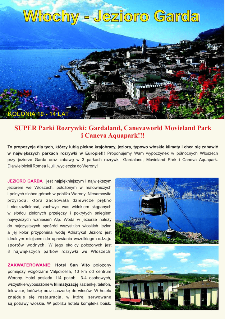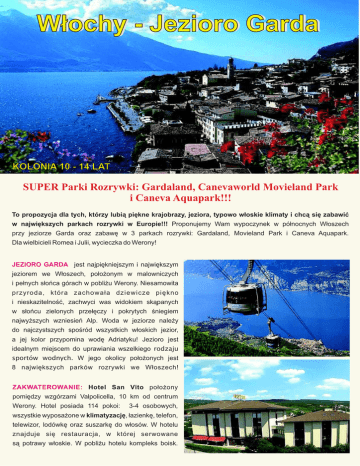 Włochy Włochy -- Jezioro Jezioro Garda Garda KOLONIA 10 - 14 LAT SUPER Parki Rozrywki: Gardaland, Canevaworld Movieland Park i Caneva Aquapark!!! To propozycja dla tych, którzy lubią piękne krajobrazy, jeziora, typowo włoskie klimaty i chcą się zabawić w największych parkach rozrywki w Europie!!! Proponujemy Wam wypoczynek w północnych Włoszech przy jeziorze Garda oraz zabawę w 3 parkach rozrywki: Gardaland, Movieland Park i Caneva Aquapark. Dla wielbicieli Romea i Julii, wycieczka do Werony! JEZIORO GARDA jest najpiękniejszym i największym jeziorem we Włoszech, położonym w malowniczych i pełnych słońca górach w pobliżu Werony. Niesamowita przyroda, która zachowała dziewicze piękno i nieskazitelność, zachwyci was widokiem skąpanych w słońcu zielonych przełęczy i pokrytych śniegiem najwyższych wzniesień Alp. Woda w jeziorze należy do najczystszych spośród wszystkich włoskich jezior, a jej kolor przypomina wodę Adriatyku! Jezioro jest idealnym miejscem do uprawiania wszelkiego rodzaju sportów wodnych. W jego okolicy położonych jest 8 największych parków rozrywki we Włoszech! ZAKWATEROWANIE: Hotel San Vito położony pomiędzy wzgórzami Valpolicella, 10 km od centrum Werony. Hotel posiada 114 pokoi: 3-4 osobowych, wszystkie wyposażone w klimatyzację, łazienkę, telefon, telewizor, lodówkę oraz suszarkę do włosów. W hotelu znajduje się restauracja, w której serwowane są potrawy włoskie. W pobliżu hotelu kompleks boisk. WYŻYWIENIE: 3 posiłki dziennie: śniadanie kontynentalne wzmocnione, lunch oraz obiadokolacja serwowana, składająca się z pierwszego i drugiego dania oraz deseru lub owoców. Woda do posiłków w cenie. Napoje do posiłków dodatkowo płatne. PROGRAM: Dzień 1: Wyjazd w godzinach popołudniowych. Przejazd przez Niemcy do Włoch. Dzień 2: Przyjazd do hotelu, zakwaterowanie, obiad. Dzień 3: Zajęcia programowe, przejście na basen, zajęcia sportowe na boiskach. Dzień 4: Wycieczka do Parku rozrywki Gardaland: Największy włoski park rozrywki Gardaland usytuowany jest na południowowschodnim brzegu jeziora Garda. Jest trzecim najpopularniejszym parkiem tematycznym w Europie. (www.gardaland.it) Dzień 5: Wycieczka do Werony - miasto Romea i Julii, zwiedzanie zabytkowego centrum. Dzień 6: Zajęcia programowe, przejście na basen, zajęcia sportowe na boiskach. Dzień 7: Wycieczka do Parku rozrywki Gardaland Wodny Świat. Dzień 8: Zajęcia programowe, przejście na basen, zajęcia sportowe na boiskach. Dzień 9: Całodzienna wyprawa do parków rozrywki Canevaworld Movieland Park i Caneva Aquapark (www.canevaworld.it). Park rozrywki podzielony na 2 części: olbrzymi Lunapark i Aquapark. Dzień 10: Wycieczka do kurortu Riva del Garda połozonego nad jeziorem Garda. Wjazd kolejką na Monte Baldo. Wieczorem podsumowanie obozu i wręczenie dyplomów, pożegnalna dyskoteka. Dzień 11: Wykwaterowanie, śniadanie, pobranie suchego prowiantu na drogę powrotną. Wyjazd w kierunku Niemiec. Dzień 12: Powrót do Polski w godzinach popołudniowych. ATRAKCJE: dwukrotny całodzienny wypad do parku Gardaland, jednego z największych parków rozrywki w Europie całodzienny pobyt w świecie filmowym Canevaworld Movieland Park wycieczka autokarowa do Werony, najbardziej romantycznego miasta Włoch, gdzie rozgrywała się historia Romea i Julii w y c i e c z k a autokarowa do najpiękniejszej miejscowości nad Jeziorem Garda - Riva del Garda lzabawa w parku wodnym Caneva Aquapark lzabawy i konkursy lzajęcia fitness lstretching - zajęcia rozciągające lkorzystanie z basenu lrozgrywki sportowe m.in. beach volleybal, koszykówka, piłka nożna WYCIECZKI W PROGRAMIE: GARDALAND jest to największy park rozrywki we Włoszech, gdzie każdy znajdzie coś dla siebie. Znajdują się tutaj trzy krainy tematyczne. Przebywając w krainie tematycznej “Adventure” przeżyjecie prawdziwą niezapomnianą przygodę: spływ pontonem po rwącej rzece oraz bitwę morską na statku pirackim. Natomiast kraina tematyczna “Adrenaline” to wyzwanie dla najodważniejszych. Tutaj znajdują się m.in. dwa roller coastery pozostawiające niezapomniane wrażenia: Blue Tornado oraz Magic Mountain, a do tego możliwość obejrzenia kina 3D, gdzie siedząc na fotelu, poczujecie się tak samo jak na rzeczywistym roller coasterze. I wszystko to w jednym parku rozrywki! Trzecia częścią kompleksu Gardaland jest "Akwarium", w którym można podziwiać stworzenia żyjące w wodach morskich na całym świecie, od płaszczek przez koniki morskie, aż po rozgwiazdy. Można tutaj poobserwować karmienie rekinów, wziąć udział w poszukiwaniach ośmiornicy, czy też obejrzeć w kinie wiele interesujących filmów przyrodniczych. WERONA to miasto Romea i Julii, a to za sprawą Szekspira, który w Weronie umieścił swoją opowieść o nieszczęśliwej miłości. Tutaj harmonijnie łączy się życie nowoczesnej europejskiej metropolii oraz powolne tempo śródziemnomorskiej osady. Główną ozdobą miasta jest rzymski amfiteatr Arena di Verona. Zanurzyć się w atmosferę tego miasta pozwoli spacer po placu Piazza del Erbe, gdzie w czasach Imperium Rzymskiego znajdował się kapitol. Natomiast obecnie na jego miejscu możecie zobaczyć Palazzo del Comune, czyli Ratusz oraz gotycki Domus Mercatorum, czyli Dom Kupców. Zobaczycie także słynny balkon w Casa di Giulietta, który stał się sławny dzięki sztuce Williama Szekspira. RIVA DEL GARDA - Przy najdalej wysuniętym na północ fragmencie jeziora Garda, po stronie należącej do Trydentu leży Riva del Garda. Miasteczko szczyci się historycznym centrum, deptakiem i promenadą wzdłuż jeziora. Spacerując po Riva del Garda odczuwamy nie tylko to, że jesteśmy na pograniczu trzech regionów, ale także to, że łączą się tu wpływy trzech krajów: Włoch, Niemiec i Szwajcarii. CANEVAWORLD MOVIELAND PARK tylko tutaj dwa parki rozrywki w jednym. Znajduje się tutaj Movieland Park, czyli pokazowe studio