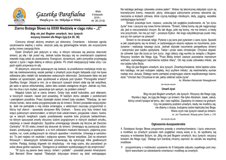 Gazetka Parafialna Parafia p.w. św. Mikołaja w Wielu Wiele 6 listopada 2016 r. Nr 36 (319) Ziarno Bożego Słowa na XXXII Niedzielę w ciągu roku – „C” Bóg nie jest Bogiem umarłych, lecz żywych: wszyscy bowiem dla Niego żyją (Łk 20, 38). Coroczny obrzęd złożony zmarłym już dokonany. Cmentarze - kolorowe ogrody uszanowania więdną z wolna. Jeszcze palą się gdzieniegdzie lampki, ale oczyszczone groby znowu zasypują liście. Dzień Zmarłych jest jedynym w roku, w którym odczuwa się jeszcze obecność śmierci, jej siłę i lęk przed nią. Jednak ludzie tłoczący się na cmentarzach częstokroć niewiele mają sobie do powiedzenia. Energiczni, dynamiczni, pełni pomysłów przybiegają wprost z życia i nagle słabną w obliczu grobów. Po chwili niedyspozycji hałas ulicy i zapach spalin przywraca im siły. W aktywnym, wiecznie spieszącym się świecie, ta przedłużona medytacja może wydać się niestosownością, wszak pamięć o zmarłych poza drugim listopada czyż nie bywa odbierana jako nietakt lub świadectwo wstecznych skłonności. Zachowanie takie nie jest dalekie od spostrzeżeń, jakie opublikował w artykule pod tytułem "Pornografia śmierci" Geoffrey Gorger. Ukazał w nim, że w obecnych czasach śmierć stała się tak wstydliwa, jak seks w epoce wiktoriańskiej. Jedno tabu zostało zastąpione drugim. Jednak czy ktoś, kto nie chce o tym myśleć, spowoduje tym samym, że problem zniknie? Niegdyś ludzie żyli w cieniu śmierci. Groby były wokół kościołów, pod ołtarzami, w bocznych nawach, nawet pod posadzką. W każdym domu zakątek z podobiznami i pamiątkami przodków. Przez dziesiątki stuleci śmierć była rytuałem. "Wiedząc, że nadchodzi koniec, dana osoba przygotowywała się do śmierci. Śmierć posiadała swoją etykietę. Jeśli nie pamiętała o niej osoba umierająca, o właściwym zwyczaju przypominali ci, którzy byli obecni - opowiada obrazowo Billy Graham. - Sceny przy łożu śmierci były wręcz publicznym ceremoniałem, w którym brali udział krewni, przyjaciele i dzieci. Ilustracje w starych książkach często przedstawiały wysokie łoże przykryte baldachimem, na którym spoczywał zmarły otoczony ludźmi pogrążonymi w różnych stadiach smutku, niepokoju a nawet obojętności. Sypialnia umierającego stawała się tłoczna jak Dworzec Centralny". W XX wieku zmienił się stosunek do śmierci. Umierający są zazwyczaj odizolowani, przebywają w szpitalach, a w nich oddzieleni maskami tlenowymi, plątaniną przewodów, rur, rurek podłączonych do różnych aparatów i monitorów. Umierają w samotności. To jest niejako ich osobista i wyłączna sprawa. Wprost wstydliwa. Zaś na ekranach filmowych i telewizyjnych bohaterowie przewracają się wykonując kilka gwałtownych ruchów. Padają, dostają drgawek lub eksplodują - nie mają szans, aby pozostawić po sobie słowa godne zapisania. "Zastąpiono je widokiem wydobywających się wnętrzności". "W życiu są pewne dwie rzeczy: śmierć i podatki" - powiadał pewien Amerykanin. Zaś Bernard Show napisał: "Statystyki dotyczące śmierci są dość wstrząsające. Na każdego jednego człowieka umiera jeden". Wobec tej lakonicznej statystyki czym są kosmetyczne kremy, maseczki, płyny, obiecujące zatrzymanie procesu starzenia się, ćwiczenia w klubach zdrowia, które czynią każdego młodszym, diety, jogging, wszelkie odmładzające techniki? Śmierć powoduje bunt, rozpacz, ucieczkę lub pogłębia przekonanie, że "po życiu życie" trwa i zaczyna się nowa forma istnienia. "Śmierć, której boimy się jak najgorszego zła, jest w rzeczywistości niczym. Bo tak długo, póki się boimy, nie ma śmierci, a kiedy ona przychodzi, nie ma już nas" - pociesza Epikur. Ale kogo satysfakcjonuje puste miejsce po nim samym na zawsze? Śmierć to nie straszak religii. Pytanie o jej sens jest pytaniem o sens życia. Sposób w jaki zapatrujemy się na śmierć, w zadziwiającym stopniu wpływa na rozumienie, przeżywanie i realizację naszego życia. Jednak dojrzałe rozumienie perspektywy śmierci i wieczności jest rzadko spotykane. Także i przez wielu chrześcijan. Chrystus objawił, że człowiek żyje dla życia po tym życiu. Jego dalszy ciąg wynika ze związku z Bogiem. Wszyscy bowiem dla Niego żyją. "Poza Biblią śmierć zawsze pozostanie nieznanym widmem, wykradającym bezimienne ludzkie ofiary". Od niej ocala człowieka miłość, ale nie ludzka tylko Boża. Bóg nie jest Bogiem umarłych, lecz żywych. Zmartwychwstanie, które będzie udziałem każdego, nie jest rodzajem odpłaty, lecz szyfrem miłości. Jej nieśmiertelny wymiar nadaje moc Jezusa. Dlatego warto pamiętać przejmujące zdanie współczesnego kaznodziei: "Umrzeć bez Chrystusa to tak, jakby odebrać sobie życie". ks. Wiesław Aleksander Niewęgłowski Umarli żywi Bóg nie jest Bogiem umarłych, ale żywych. Wszyscy dla Niego żyją. Wynika z tego, że żyją dla Niego i po śmierci. Nie tylko Abraham, Izaak, Jakub, którzy umarli tysiące lat temu, ale i nasi najbliżsi. Zapalamy im świece na grobach. Czy nie jesteśmy podobni umarłym, kiedy nie modlimy się, nie dbamy o duszę, budujemy sobie kapliczkę bez Boga. Wiara czyni nas żywymi nawet po śmierci. ks. Jan Twardowski, Wszędy pełno Ciebie, s. 216. Ogłoszenia duszpasterskie 1. Dzisiejsza liturgia Słowa przypomina prawdę o zmartwychwstaniu i życiu wiecznym, a modlitwa za zmarłych pozwala nam pogłębiać naszą wiarę w to, że spotkamy się wszyscy w królestwie Bożym, bo „Bóg nie jest Bogiem umarłych, lecz żywych; wszyscy bowiem dla Niego żyją”. Dlatego tym bardziej chcemy zaprosić do udziału we wspólnej modlitwie: przypominamy o możliwości uzyskania do 8 listopada odpustu zupełnego pod zwykłymi warunkami za odwiedzenie cmentarza i modlitwę za zmarłych. 2. W środę, 9 listopada, będziemy obchodzić święto Rocznicy Poświęcenia Bazyliki Laterańskiej, która jest katedrą biskupa Rzym