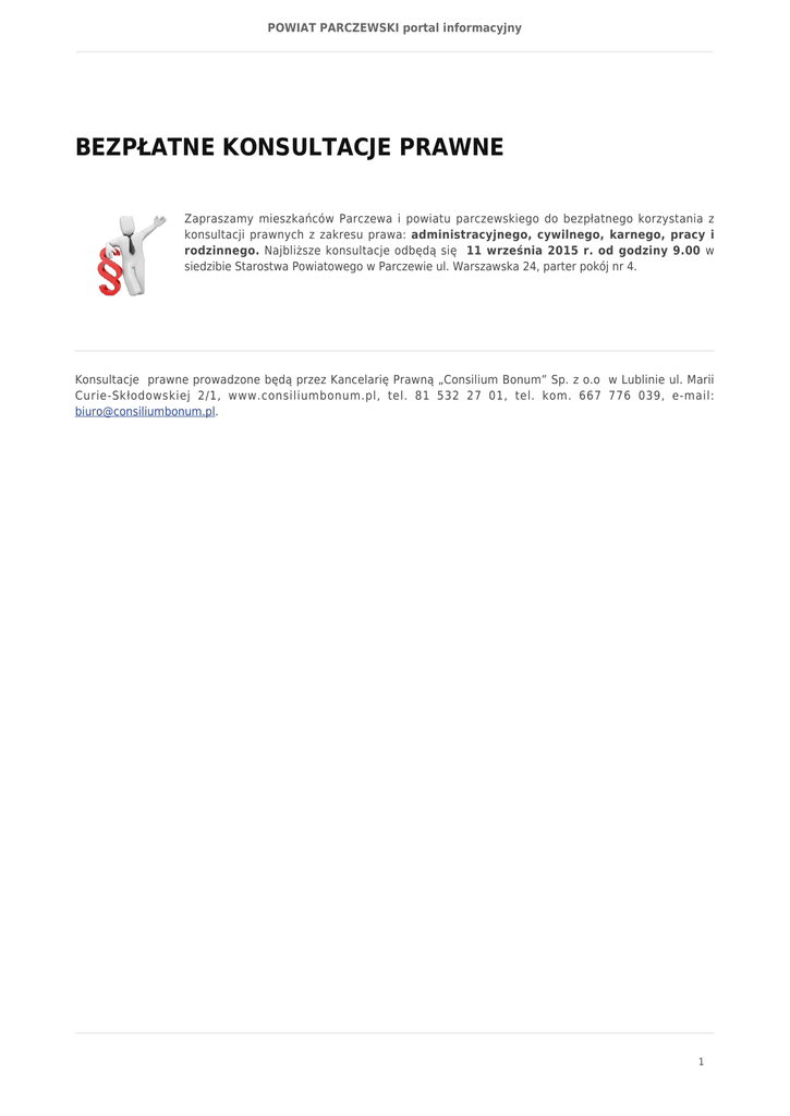 POWIAT PARCZEWSKI portal informacyjny BEZPŁATNE KONSULTACJE PRAWNE Zapraszamy mieszkańców Parczewa i powiatu parczewskiego do bezpłatnego korzystania z konsultacji prawnych z zakresu prawa: administracyjnego, cywilnego, karnego, pracy i rodzinnego. Najbliższe konsultacje odbędą się 11 września 2015 r. od godziny 9.00 w siedzibie Starostwa Powiatowego w Parczewie ul. Warszawska 24, parter pokój nr 4. Konsultacje prawne prowadzone będą przez Kancelarię Prawną „Consilium Bonum” Sp. z o.o w Lublinie ul. Marii Curie-Skłodowskiej 2/1, www.consiliumbonum.pl, tel. 81 532 27 01, tel. kom. 667 776 039, e-mail: [email protected]. 1