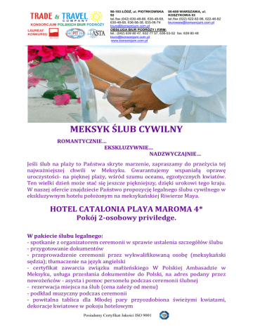 90-103 ŁÓDŹ, ul. PIOTRKOWSKA 00-659 WARSZAWA, ul. 92 KOSZYKOWA 53 tel./fax (042) 630-48-66, 630-48-68, tel./fax (022) 622-82-96, 622-46-82 630-48-69, 636-98-38, 633-06-74 [email protected] [email protected] OBSŁUGA BIUR PODRÓŻY I FIRM: tel.: (042) 639 80 47, 632 77 57, 636-53-52 fax: 639 80 48 [email protected] www.konsorcjum.com.pl MEKSYK ŚLUB CYWILNY ROMANTYCZNIE… EKSKLUZYWNIE… NADZWYCZAJNIE… Jeśli ślub na plaży to Państwa skryte marzenie, zapraszamy do przeżycia tej najważniejszej chwili w Meksyku. Gwarantujemy wspaniałą oprawę uroczystości- na pięknej plaży, wśród szumu oceanu, egzotycznych kwiatów. Ten wielki dzień może stać się jeszcze piękniejszy, dzięki urokowi tego kraju. W naszej ofercie znajdziecie Państwo propozycję legalnego ślubu cywilnego w ekskluzywnym hotelu położonym na meksykańskiej Riwierze Maya. HOTEL CATALONIA PLAYA MAROMA 4* Pokój 2-osobowy priviledge. W pakiecie ślubu legalnego: - spotkanie z organizatorem ceremonii w sprawie ustalenia szczegółów ślubu - przygotowanie dokumentów - przeprowadzenie ceremonii przez wykwalifikowaną osobę (meksykański sędzia); tłumaczenie na język angielski - certyfikat zawarcia związku małżeńskiego W Polskiej Ambasadzie w Meksyku, usługa przesłania dokumentów do Polski, na adres podany przez nowożeńców - asysta i pomoc personelu podczas ceremonii ślubnej - rezerwacja miejsca na ślub (cena zależy od menu) - podkład muzyczny podczas ceremonii - powitalna tablica dla Młodej pary przyozdobiona świeżymi kwiatami, dekoracje kwiatowe w pokoju hotelowym Posiadamy Certyfikat Jakości ISO 9001 - deszcz kwiatów dodatkowy koszt - tort dla max 20 osób - max. 2 butelki orzeźwiającego wina musującego - bukiet dla Panny Młodej oraz butonierka dla Pana Młodego - deser oraz butelka wina musującego na noc poślubną Procedura przygotowań przedślubnych dla Polaków wygląda następująco: Przyszli małżonkowie powinni osobiście podpisać w Konsulacie formularze "zapewnienia o braku przeszkód do zawarcia małżeństwa" na co najmniej jeden miesiąc przed ustaloną datą zawarcia związku małżeńskiego. Jeżeli nie będą mogli Państwo zgłosić się do Konsulatu z takim wyprzedzeniem, to zapewnienia o braku przeszkód powinno podpisane we w/w terminie przed kierownikiem Urzędu Stanu Cywilnego właściwego dla waszego miejsca zamieszkania w Polsce, albo przed konsulem polskim w miejscu waszego pobytu w innym kraju. Powyższe zapewnienie winno być poświadczone przez kierownika USC lub konsula, a następnie przesłać do Konsulatu w Meksyku, co najmniej na dwa tygodnie przed wyznaczonym terminem zawarcia małżeństwa. Niezbędne dokumenty potrzebne do Ambasady są następujące: dowód osobisty, paszport, metryka urodzenia, zaświadczenia z Urzędu Stanu Cywilnego, pieniądze na opłaty, dwóch świadków (możecie poprosić o świadkowanie pracowników Ambasady) * Opłaty konsularne za zawarcie małżeństwa są pokrywane bezpośrednio przez przyszłych małżonków w Ambasadzie (2880 peso czyli ok. 200 USD). Mogą być pokryte przy składaniu wniosku lub wcześniej na konto ambasady. Po wyznaczeniu daty ślubu nastąpi spotkanie z koordynatorem ślubu; należy wówczas wypełnić formularz: pełne imię i nazwisko, wyznanie, zawód, miejsce zamieszkania, dane rodziców obu osób zawierających małżeństwo: imiona, nazwiska, adresy zamieszkania. Inne niezbędne dokumenty: - Ważne paszporty obu narzeczonych oraz świadków - Odpisy aktu poprzedniego małżeństwa z adnotacją o rozwodzie lub odpis prawomocnego wyroku polskiego sądu orzekającego rozwód (jeśli dotyczy) - Od osób, których poprzedni małżonek zmarł wymagany jest odpis aktu zgonu małżonka HOTEL CATALONIA PLAYA MAROMA 4* RIWIERA MAYA Położenie: bezpośrednio przy pięknej piaszczystej plaży Playa Maroma. Do Playa del Carmen ok. 20 min. samochodem. Transfer z lotniska w Cancun ok. 30 min. Wyposażenie: Wnętrza urządzone w tradycyjnym, meksykańskim stylu; przytule, ale jednocześnie nowoczesne. Goście maja do dyspozycji pokoje w 3piętrowych budynkach, w zadbanym ogrodzie pełnym egzotycznych roślin. Można korzystać z 2 barów, z restauracji głównej, serwującej dania kuchni międzynarodowej w formie bufetu, 2 restauracje a la carte: meksykańska i śródziemnomorska, restauracja serwująca potrawy z owoców morza (dodatkowo płatne). Ponadto na terenie hotelu znajdują się sklepy z pamiątkami oraz kawiarnia internetowa. W pięknym ogrodzie kompleks basenów z brodzikiem dla dzieci. Przy basenie oraz na plaży leżaki, pergole i ręczniki kąpielowe bez opłaty. Pokoje: przytulnie urządzone, klimatyzowane, wyposażone w wentylator sufitowy, telefon, TV kablową, sejf, balkon lub taras z widokiem na ogród. Prysznic, WC, suszarka do włosów. Można korzystać z udogodnień tj.: siłownia, aerobik, gimnastyka wodna, strzelanie z łuku, piłka wodna, siatkówka plażowa, niezmotoryzowane sporty wodne; za opłatą bilard, nurkowanie oraz zabiegi w centrum SPA. Hotel oferuje bogaty program animacyjny w ciągu dnia i wieczorem. Dyskoteka od 24:00. Dla dzieci mini klub (4-12 lat). All inclusive: 3 posiłki w formie bufetu, kolacja również w restauracjach a la carte (konieczność wcześniejszej rezerwacji). Przez całą dobę wszystkie lokalne napoje bezalkoholowe i alkoholowe, przekąski.