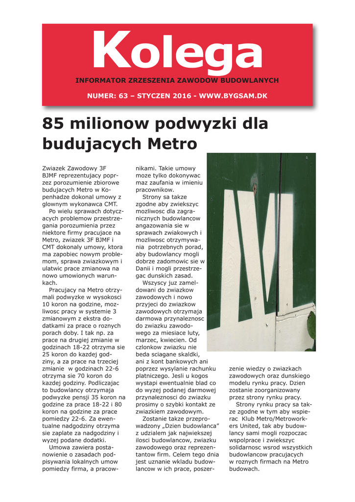 Kolega INFORMATOR ZRZESZENIA ZAWODOW BUDOWLANYCH NUMER: 63 – STYCZEN 2016 - WWW.BYGSAM.DK 85 milionow podwyzki dla budujacych Metro Zwiazek Zawodowy 3F BJMF reprezentujacy poprzez porozumienie zbiorowe budujacych Metro w Kopenhadze dokonal umowy z glownym wykonawca CMT. Po wielu sprawach dotyczacych problemow przestrzegania porozumienia przez niektore firmy pracujace na Metro, zwiazek 3F BJMF i CMT dokonaly umowy, ktora ma zapobiec nowym problemom, sprawa zwiazkowym i ulatwic prace zmianowa na nowo umowionych warunkach. Pracujacy na Metro otrzymali podwyzke w wysokosci 10 koron na godzine, mozliwosc pracy w systemie 3 zmianowym z ekstra dodatkami za prace o roznych porach doby. I tak np. za prace na drugiej zmianie w godzinach 18-22 otrzyma sie 25 koron do kazdej godziny, a za prace na trzeciej zmianie w godzinach 22-6 otrzyma sie 70 koron do kazdej godziny. Podliczajac to budowlancy otrzymaja podwyzke pensji 35 koron na godzine za prace 18-22 i 80 koron na godzine za prace pomiedzy 22-6. Za ewentualne nadgodziny otrzyma sie zaplate za nadgodziny i wyzej podane dodatki. Umowa zawiera postanowienie o zasadach podpisywania lokalnych umow pomiedzy firma, a pracow- nikami. Takie umowy moze tylko dokonywac maz zaufania w imieniu pracownikow. Strony sa takze zgodne aby zwiekszyc mozliwosc dla zagranicznych budowlancow angazowania sie w sprawach zwiakowych i mozliwosc otrzymywania potrzebnych porad, aby budowlancy mogli dobrze zadomowic sie w Danii i mogli przestrzegac dunskich zasad. Wszyscy juz zameldowani do zwiazkow zawodowych i nowo przyjeci do zwiazkow zawodowych otrzymaja darmowa przynaleznosc do zwiazku zawodowego za miesiace luty, marzec, kwiecien. Od czlonkow zwiazku nie beda sciagane skaldki, ani z kont bankowych ani poprzez wysylanie rachunku platniczego. Jesli u kogos wystapi ewentualnie blad co do wyzej podanej darmowej przynaleznosci do zwiazku prosimy o szybki kontakt ze zwiazkiem zawodowym. Zostanie takze przeprowadzony „Dzien budowlanca” z udzialem jak najwiekszej ilosci budowlancow, zwiazku zawodowego oraz reprezentantow firm. Celem tego dnia jest uznanie wkladu budowlancow w ich prace, poszer- zenie wiedzy o zwiazkach zawodowych oraz dunskiego modelu rynku pracy. Dzien zostanie zoorganizowany przez strony rynku pracy. Strony rynku pracy sa takze zgodne w tym aby wspierac Klub Metro/Metroworkers United, tak aby budowlancy sami mogli rozpoczac wspolprace i zwiekszyc solidarnosc wsrod wszystkich budowlancow pracujacych w roznych firmach na Metro budowach. Urlopy, pieniadze wakacyjne i obnizki Czas nowych wakacji i urlopow zbliza sie. Z tego powodu przypominamy Wam kilka waznych spraw zwiazanych z tym milym okresem w naszym zyciu, czasem jakim jest urlop. Pieniadze wakacyjne nazywane w Danii, Ferie Penge, sa przywilejem prawnym wszystkich pracujacych w Danii. Kazdy pracodawca musi obliczac dodatek wakacyjny w wysokosci 12,5% z naszej pensji i wplacac na specjalne konto wakacyjne, Ferie Konto. Pracujacy na stalych miesiecznych pensjach sa traktowani w troche inny sposob. Prosze pamietac aby okresy urlopu umawiac wspolnie z pracodawca. Tutaj radzimy aby umowione okresy urlopowe zapisac wraz pracodawca z podpisami na kartce papieru czy mejlu. Tak aby nie doszlo do niejasnosci dotyczacych co do dokonanych wczesniej umow, zaplanowanych urlopow. Okolo 5 dni po 7 lutego 2016 bedziemy mogli zobaczyc i sprawdzic ile wplat dokonal nasz pracodawca za 2015 rok na Ferie Konto. Mozna to sprawdzic poprzez uzycie Nem id. Jesli macie jakies niepownosci, skontaktujcie sie ze swoim zwiazkiem zawodowym w celu sprawdzenia naliczen Ferie Penge. Okres urlopowy, dni i pieniadze urlopowe za 2015 trzeba wykorzystac w okresie 1 maja 2016, a 30 kwietnia 2017. Pieniadze na zamowiony urlop mozna otrzymac na swoje Nem Konto ( konto bankowe zarejsetrowane jako Nem Konto), 1 miesiac przed rozpoczeciem urlopu. Wszyscy czlonkowie prawdziwych zwiazkow zwiazkow moga skorzystac z obnizek. Do nie prawdziwych zwiazkow zaliczamy Faglig Hus czy Kristelig Fagbevægelse. Czlonkowie prawdziwych zwiazkow posiadaja karte czlonka na ktorej jest podany napis LO PLUS. Na stronie www.LOPLUS.dk mozna znalesc obnizki w biurach podrozy, osrodkach wakacyjnych i inne.Umowy obnizek dokonala nasza wspolna Federacja LO, do ktorej nalezemy my wszyscy ciezko pracujacy i czlonkowie zwiazkow. Przy zakupie podrozy wakacyjnych wystarczy pokazac swoja karte zwiazkowa lub podac swoj numer czlonka, ktory mozna znalesc na karcie. Karta czlonka daje takze rabaty w innych miejscach, jak sklepy, warsztaty czy kawiarnie i restauracje. Na stronie www. LOPLUS.dk mozna tez znale- sc App, ktory automatyczniei szybko pozwoli nam znalesc miejsca gdzie mozemy zaoszczedzic pieniadze. Ponadto wszystkie pojedyncze organizacje zwiazkowe posiadaja swoje wlasne domki letniskowe czy mieszkania. Z najnowsza gazeta zwiazkowa 3F otrzymalismy dodatek w ktorym sa podane ze zdjeciami wszystkich dostepnych mozliwosci pobytu urlopowego na atrakcyjnych warunkach. 3F posiada wlasne mieszkania i domki letniskowe w Danii i takich miastach jak Poznan, Londyn, Barcelona czy Paryz i wielu innych miejscach. Aby skorzystac z tych mozliwosci zakwaterowania w czasie urlopu nalezy zapisac sie na liste czy bezposrednio zarezerwowac lokale poprzez 3F internet. Naturalnie w okresach popularnych urlopowo jest wielu chetnych i wtedy losuje sie lokale, ale w okresach po sezonie jest dosc latwo otrzymac/wynajac jeden ze zwiakowych domkow czy mieszkan. Polski Klub Zwiazkowy zyczy Wam wszystkim milego i pelnego wrazen okresu urlopowego 2016-17. Szukaj wiecej o polskim klubie zwiazkowym na facebook POLSKI KLUB ZWIAZKOWY Napisz i zadzwoń do mówiacych po polsku związkowców: E-mail: [email protected] (+45 22 79 89 60) i Agnieszka Kluczyk 23 45 75 34 ([email protected]). Przeczytaj więcej po polsku i szukaj klubu na: www.bygsam.dk