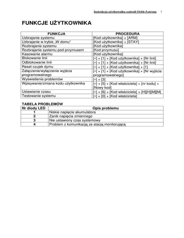 Instrukcja u ytkownika centrali Orbit-5;strona 1 FUNKCJE U YTKOWNIKA FUNKCJA Uzbrajanie systemu Uzbrajanie w trybie „W domu” Rozbrajanie systemu Rozbrajanie systemu pod przymusem Kasowanie alarmu Blokowanie linii Odblokowanie linii Reset czujek dymu Zał czenie/wył czenie wyj cia programowalnego Wy wietlenie problemów Wpisywanie/zmiana kodu u ytkownika Ustawianie czasu Testowanie systemu PROCEDURA [Kod u ytkownika] + [ARM] [Kod u ytkownika] + [STAY] [Kod u ytkownika] [Kod przymusu] [Kod u ytkownika] [∗] + [1] + [Kod u ytkownika] + [Nr linii] [∗] + [1] + [Kod u ytkownika] + [Nr linii] [∗] + [1] + [Kod u ytkownika] + [1] [∗] + [1] + [Kod u ytkownika] + [Nr wyj cia programowalnego] [∗] + [3] [∗] + [5] + [Kod wła ciciela] + [nr kodu] + [Nowy kod] [∗] + [6] + [Kod wła ciciela] + [H][H][M][M] [∗] + [0] + [Kod wła ciciela] TABELA PROBLEMÓW Nr diody LED Opis problemu 1 Niskie napi cie akumulatora 2 Zanik napi cia zmiennego 3 Nie ustawiony czas systemowy 4 Problem z komunikacj ze stacj monitoruj c Instrukcja u ytkownika centrali Orbit-5;strona 2 OPIS SZYFRATORA 1 2 3 4 5 6 1.DIODA POWER Stan diody Wł czona Wył czona Błyska (System rozbrojony) 2.DIODA ARM Stan diody Wł czona Wył czona Błyska 3.DIODA READY Stan diody Wł czona Wył czona Błyska 4.DIODA FIRE Stan diody Wł czona Wył czona Błyska Znaczenie Stan zasilania systemu poprawny; zasilanie z sieci energetycznej, akumulator sprawny Brak zasilania(zarówno sieciowego, jak i awaryjnego); konieczna interwencja serwisu technicznego Wskazuje stan awaryjny systemu Znaczenie System włamaniowy zał czony (uzbrojony), wej cie w stref chronion spowoduje alarm System włamaniowy wył czony(rozbrojony) Stan taki pojawia si podczas alarmu włamaniowego, po arowego lub w przypadku u ycia klawiszy alarmowych Znaczenie Wszystkie linie włamaniowe s w stanie normalnym; system jest gotowy do uzbrojenia Jedna lub wi cej linii wykazuje pobudzenie; systemu nie mo na uzbroi Stan taki pojawia si , gdy co najmniej jedna linia jest zablokowana Znaczenie System wykrył alarm po arowy Linia po arowa jest w stanie normalnym System wykrył usterk linii po arowej, która powinna by usuni ta Instrukcja u ytkownika centrali Orbit-5;strona 5.DIODY LINII Stan diody Wył czona Błyska Wył czona 3 Znaczenie System rozbrojony System uzbrojony Odpowiadaj ca jej linia jest w stanie normalnym Odpowiadaj ca jej linia jest Nie wyst puje pobudzona Nie wyst puje Odpowiadaj ca jej linia jest w stanie alarmu 6.KLAWISZE A) klawisze numeryczne – słu do wprowadzania kodów, które mog by wymagane do uzbrojenia, rozbrojenia systemu oraz innych specjalnych funkcji. B) klawisz ∗ C) klawisz ARM - słu y do wej cia do funkcji u ytkownika - słu y do uzbrajania systemu w trybie normalnym, zale nie od zaprogramowania centrali, mo e by przed wci ni ciem klawisza „ARM” konieczne wpisanie czterocyfrowego kodu D) klawisz STAY - słu y do uzbrajania systemu w trybie normalnym , zale nie od zaprogramowania centrali, mo e by konieczne wpisanie czterocyfrowego kodu przed wci ni ciem klawisza „STAY” ALARMY ZAŁ CZANE Z SZYFRATORA 1.ALARM NAPADOWY – w celu zał czenia wci nij równocze nie klawisze „1” oraz „2” i przytrzymaj przez co najmniej 2 sekundy 2.ALARM PO AROWY – w celu zał czenia wci nij równocze nie klawisze „4” oraz „5” i przytrzymaj przez co najmniej 2 sekundy 3.ALARM MEDYCZNY – w celu zał czenia wci nij równocze nie klawisze „7” oraz „8” i przytrzymaj przez co najmniej 2 sekundy Sygnalizacja zał czenia alarmu zale y od zaprogramowania centrali. Instrukcja u ytkownika centrali Orbit-5;strona 4 KODY U YTKOWNIKÓW Korzystanie z wi kszo ci funkcji u ytkownika w centrali Orbit-5 jest dost pne po wprowadzeniu czterocyfrowego kodu u ytkownika. W centrali Orbit-5 mo emy zaprogramowa pi kodów u ytkownika. W ród nich wyst puje kod wła ciciela, który charakteryzuje si nast puj cymi cechami: - mo liwo ci wpisywania, dokonywania zmian i kasowania pozostałych kodów u ytkowników - mo liwo ci ustawiania zegara systemowego - dost pem do wszystkich funkcji systemowych i mo liwo ci testowania systemu. Poza tym ,nie ma ró nic w posługiwaniu si kodami u ytkowników. WPISYWANIE I DOKONYWANIE ZMIAN WŁA CICIELA I KODÓW U YTKOWNIKÓW KODU KROK 1 Sprawd , czy system jest rozbrojony. Dioda „Arm” powinna by wył czona. Wci nij klawisz „* ”, aby wej do funkcji u ytkownika. Nast pnie wci nij klawisz „5”, aby wej do funkcji zmiany kodów. KROK 2 Wprowad czterocyfrowy kod wła ciciela. KROK 3 A) W celu zmiany kodu wła ciciela wci nij klawisz „0” ; B) w celu zmiany kodu u ytkownika nr 1 wci nij klawisz „1” ; C) w celu zmiany kodu u ytkownika nr 2 wci nij klawisz „2” ; D) w celu zmiany kodu u ytkownika nr 3 wci nij klawisz „3” ; E) w celu zmiany kodu u ytkownika nr 4 wci nij klawisz „4” . KROK 4 Wprowad nowy czterocyfrowy kod . KROK 5 Je li operacja została wykonana poprawnie szyfrator wyemituje jednosekundowy d wi k. KASWANIE KODÓW U YTKOWNIKÓW KROK 1 Sprawd ,czy system jest rozbrojony. Dioda „Arm” powinna by wył czona. Wci nij klawisz „* ”, aby wej do funkcji u ytkownika. Nast pnie wci nij klawisz „5”, aby wej do funkcji zmiany kodów. KROK 2 Wprowad czterocyfrowy kod wła ciciela. Instrukcja u ytkownika centrali Orbit-5;strona 5 KROK 3 A) W celu skasowania kodu u ytkownika nr 1 wci nij klawisz „1” ; C) w celu skasowania kodu u ytkownika nr 2 wci nij klawisz „2” ; D) w celu skasowania kodu u ytkownika nr 3 wci nij klawisz „3” ; E) w celu skasowania kodu u ytkownika nr 4 wci nij klawisz „4” . KROK 4 Wci nij cztery razy klawisz „0”. KROK 5 Je li operacja została wykonana poprawnie szyfrator wyemituje jednosekundowy d wi k UZBRAJANIE SYSTEMU KROK 1 Sprawd stan diody „READY”.Je li wieci wiatłem ci głym lub błyska system jest gotowy do uzbrojenia. W przypadku ,gdy dioda „READY” nie wieci, system jest nie gotowy do uzbrojenia, co najmniej jedna z linii w sys