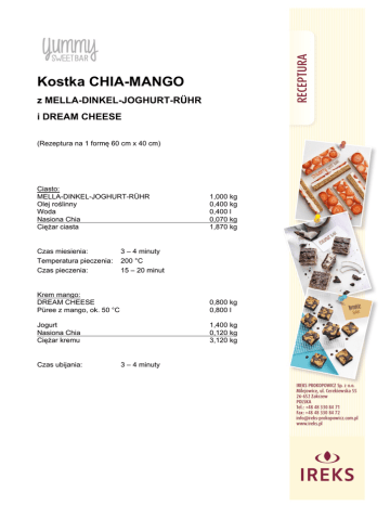 Kostka CHIA-MANGO z MELLA-DINKEL-JOGHURT-RÜHR i DREAM CHEESE (Rezeptura na 1 formę 60 cm x 40 cm) Ciasto: MELLA-DINKEL-JOGHURT-RÜHR Olej roślinny Woda Nasiona Chia Ciężar ciasta Czas miesienia: Temperatura pieczenia: Czas pieczenia: 1,000 kg 0,400 kg 0,400 l 0,070 kg 1,870 kg 3 – 4 minuty 200 °C 15 – 20 minut Krem mango: DREAM CHEESE Püree z mango, ok. 50 °C 0,800 kg 0,800 l Jogurt Nasiona Chia Ciężar kremu 1,400 kg 0,120 kg 3,120 kg Czas ubijania: 3 – 4 minuty Wskazówki przygotowania: Wszystkie składniki wymieszać na gładką masę. Wylać na formę wyłożoną papierem i piec. Podgrzane püree z mango wymieszać z DREAM CHEESE i ubić z jogurtem. Na koniec dodać nasiona Chia. Krem wyłożyć na schłodzone ciasto. Po schłodzeniu kremu udekorować wedle uznania.