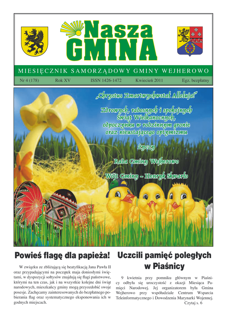 MIESIĘCZNIK SAMORZĄDOWY GMINY WEJHEROWO Nr 4 (178) Rok XV ISSN 1426-1472 Kwiecień 2011 Egz. bezpłatny „Chrystus Zmartwychwstał Alleluja!” Zdrowych, radosnych i spokojnych Świąt Wielkanocnych, odpoczynku w rodzinnym gronie oraz nieustającego optymizmu życzy Rada Gminy Wejherowo Wójt Gminy - Henryk Skwarło Powieś flagę dla papieża! Uczcili pamięć poległych W związku ze zbliżającą się beatyfikacją Jana Pawła II w Piaśnicy oraz przypadającymi na początek maja doniosłymi świętami, w dyspozycji sołtysów znajdują się flagi państwowe, którymi na ten czas, jak i na wszystkie kolejne dni świąt narodowych, mieszkańcy gminy mogą przyozdobić swoje posesje. Zachęcamy zainteresowanych do bezpłatnego pobierania flag oraz systematycznego eksponowania ich w godnych miejscach. 9 kwietnia przy pomniku głównym w Piaśnicy odbyła się uroczystość z okazji Miesiąca Pamięci Narodowej. Jej organizatorem była Gmina Wejherowo przy współudziale Centrum Wsparcia Teleinformatycznego i Dowodzenia Marynarki Wojennej. Czytaj s. 6 NASZA GMINA Drodzy Mieszkańcy! Miniony miesiąc obfitował w wiele wydarzeń, mających istotne znaczenie dla życia nas wszystkich, mieszkańców Gminy Wejherowo. Niewątpliwie, jednymi z nich były i są sprawozdawczo – wyborcze zebrania wiejskie, które – jak dotychczas – zostały przeprowadzone w zdecydowanej większości naszych sołectw. Warto podkreślić (i za to dziękuję) bardzo dużą frekwencję, świadczącą o coraz większym zainteresowaniu życiem macierzystych wsi. W wyniku demokratycznych decyzji kilkorgu z dotychczasowych sołtysów i niemałej rzeszy członków Rad Sołeckich ponownie powierzono sprawowanie tych niełatwych funkcji. W części sołectw nastąpiły dość znaczące zmiany w tym zakresie, co może oznaczać potrzebę nieco innego, niż dotychczas, widzenia spraw sołectwa, ale także aktywizację środowisk dotąd nie w pełni angażujących się w życie lokalnej społeczności. Pragnę gorąco podziękować wszystkim władzom wiejskim za ich dotychczasową pracę, a nowo wy- Zapisz dziecko do przedszkola! Trwają zapisy dzieci w wieku od trzech do sześciu lat do Przedszkola Samorządowego w Gościcinie na rok 2011/2012. Aby dokonać zapisu, należy pobrać kartę zgłoszenia dziecka do przedszkola, wypełnić i zwrócić w terminie do 30.04.2011 r. Podczas rekrutacji, pierwszeństwo będą miały dzieci zgłoszone na co najmniej 8 godzin dziennie. Dzieci na 5. godzinny pobyt, zapraszamy do przedszkola na ul. Krofeya 14 w Wejherowie. Listy zakwalifikowanych dzieci, wywieszone będą na tablicy ogłoszeń w przedszkolu do dnia 13.05.2011 r. Bliższych informacji zasięgnąć można w Przedszkolu Samorządowym w Gościcinie, kontakt telefoniczny : 58-67281-95 lub na www.przedszkolegoscicino.republika.pl. Bieg Piaśnicki 2011 Wójt Henryk Skwarło zaprasza wszystkich mieszkańców Gminy Wejherowo oraz gości na Trzeci Bieg Piaśnicki, podczas którego poprzez sport będzie można oddać hołd pomordowanym w tym miejscu Polakom. Odbędzie się on w sobotę 30 kwietnia br. Aby wziąć udział w zawodach, należy zgłosić się na parking w Lesie Piaśnickim, bezpośrednio przed startem o godzinie 11. Biegi orga- branym sołtysom i Radom Sołeckim życzę powodzenia i satysfakcji ze sprawowanych społecznych powinności. Podczas zebrań wywiązywała się nierzadko gorąca dyskusja, głównie na tle stanu dróg, kanalizacji, oświetlenia i prowadzonych inwestycji. Przyznam, że niekiedy trudno było udzielić wyczerpujących i satysfakcjonujących mieszkańców odpowiedzi, przede wszystkim ze względu na wcześniejsze nie zawsze trafne decyzje, zaniedbania lub wręcz zaniechania. Także ze względu na skalę potrzeb i możliwości organizacyjno – finansowych Gminy. Niemniej, wszystkie uwagi i opinie są skrzętnie ewidencjonowane i – w miarę czasu oraz posiadanych zasobów – będą przedmiotem realizacji. Liczę także, iż opracowywane plany odnowy miejscowości, wzmacniane realnym zwiększeniem poziomu funduszy sołeckich, spowodują istotny przyrost satysfakcji z warunków naszego życia w Gminie i sprawności jej organów. Pozdrawiam Henryk Skwarło Wójt Gminy Wejherowo nizowane będą z podziałem na grupy wiekowe: Grupa przedszkolna: • Dzieci w wieku 1-6 lat – 100 m Szkoły podstawowe: • Dziewczęta i chłopcy klasy I -III – 300m • Dziewczęta i chłopcy klasy IV-VI – 800m,1000m Gimnazjum: • Dziewczęta – 1500m • Chłopcy – 1800m Szkoły średnie: • Dziewczęta – 1800m • Chłopcy – 2800m Kategoria otwarta: • Kobiety – 2800m • Mężczyźni – 3700m Oldboje: • Kobiety – 1800m • Mężczyźni - 2800m Na zwycięzców czekają atrakcyjne nagrody rzeczowe. Do dyspozycji uczestników będą autobusy, które pojadą zgodnie z następującym rozkładem: I - zbiórka przy Szkole Podstawowej w Nowym Dworze Wejherowskim o godz. 10.00. - Sobieszyno - przystanek PKS o godz. 10.15 - Gowino - przystanek PKS o godz. 10.30 II - zbiórka przy Szkole Podstawowej w Gościcinie o godz. 10.15 - Gimnazjum w Bolszewie o godz. 10.25 - parking przy kościele w Bolszewie o godz. 10.35 Więcej informacji na stronie: www.ug.wejher.pl/Aktualności -2- NASZA GMINA Z działalności Wójta Gminy Wejherowo • W drodze postępowania konkursowego, powołany został kierownik Referatu Zarządzania Kryzysowego. Decyzją komisji rekrutacyjnej został nim Zbigniew Kowalewski • Został ogłoszony przetarg na opracowanie dokumentacji projektowej dotyczącej termomodernizacji budynków użyteczności publicznej Gminy Wejherowo. • W celu umożliwienia składania wniosków o dofinansowanie w ramach Programu Rozwoju Obszarów Wiejskich „Odnowa Wsi” podjęto działania mające na celu opracowanie Planów Odnowy Miejscowości. Sukcesywnie organizowane są spotkania w poszczególnych miejscowościach. Odbyły się już one w Górze, Kąpinie, Gowinie, Gościcinie, Ustarbowie oraz Sopiesz