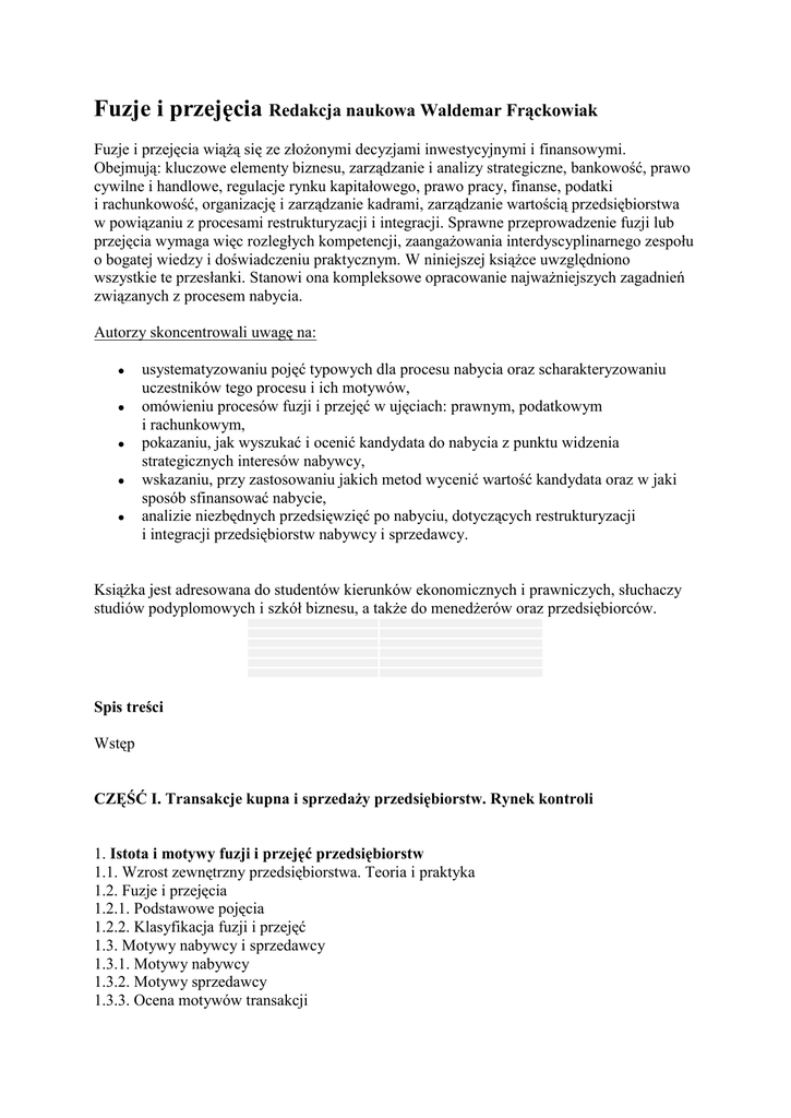 Fuzje i przejęcia Redakcja naukowa Waldemar Frąckowiak