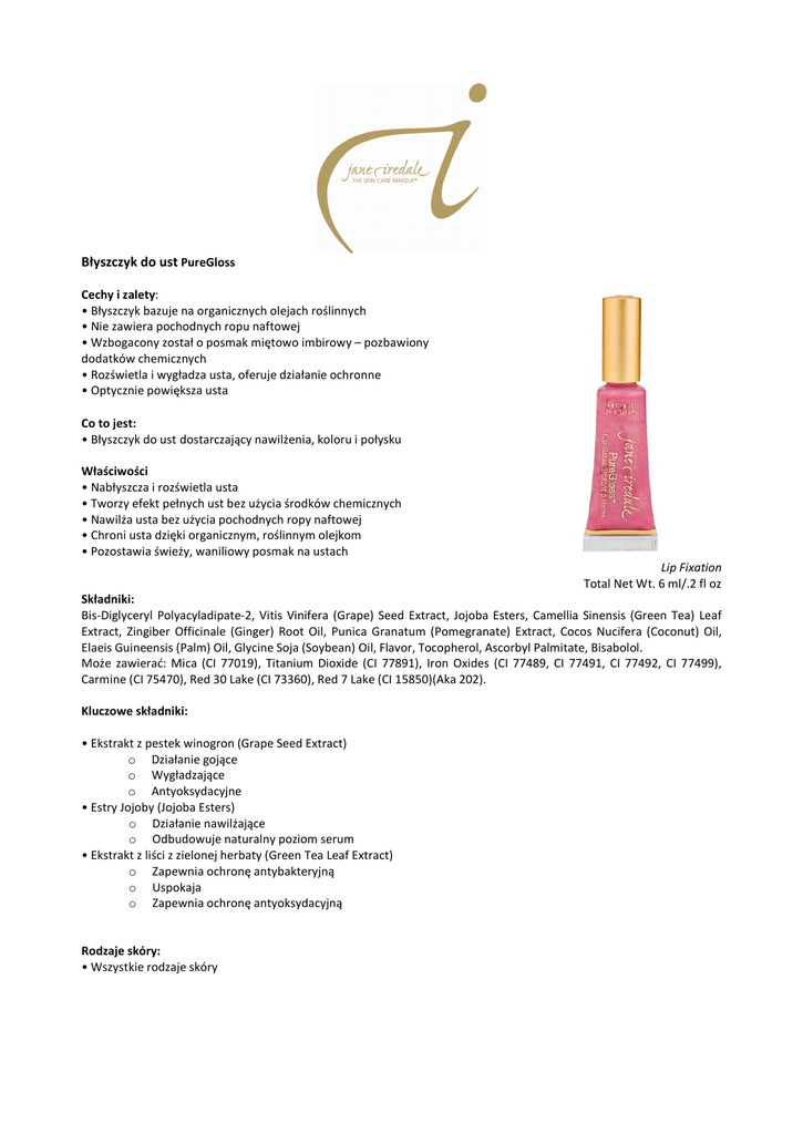Błyszczyk do ust PureGloss Cechy i zalety: • Błyszczyk bazuje na organicznych olejach roślinnych • Nie zawiera pochodnych ropu naftowej • Wzbogacony został o posmak miętowo imbirowy – pozbawiony dodatków chemicznych • Rozświetla i wygładza usta, oferuje działanie ochronne • Optycznie powiększa usta Co to jest: • Błyszczyk do ust dostarczający nawilżenia, koloru i połysku Właściwości • Nabłyszcza i rozświetla usta • Tworzy efekt pełnych ust bez użycia środków chemicznych • Nawilża usta bez użycia pochodnych ropy naftowej • Chroni usta dzięki organicznym, roślinnym olejkom • Pozostawia świeży, waniliowy posmak na ustach Lip Fixation Total Net Wt. 6 ml/.2 fl oz Składniki: Bis-Diglyceryl Polyacyladipate-2, Vitis Vinifera (Grape) Seed Extract, Jojoba Esters, Camellia Sinensis (Green Tea) Leaf Extract, Zingiber Officinale (Ginger) Root Oil, Punica Granatum (Pomegranate) Extract, Cocos Nucifera (Coconut) Oil, Elaeis Guineensis (Palm) Oil, Glycine Soja (Soybean) Oil, Flavor, Tocopherol, Ascorbyl Palmitate, Bisabolol. Może zawierać: Mica (CI 77019), Titanium Dioxide (CI 77891), Iron Oxides (CI 77489, CI 77491, CI 77492, CI 77499), Carmine (CI 75470), Red 30 Lake (CI 73360), Red 7 Lake (CI 15850)(Aka 202). Kluczowe składniki: • Ekstrakt z pestek winogron (Grape Seed Extract) o Działanie gojące o Wygładzające o Antyoksydacyjne • Estry Jojoby (Jojoba Esters) o Działanie nawilżające o Odbudowuje naturalny poziom serum • Ekstrakt z liści z zielonej herbaty (Green Tea Leaf Extract) o Zapewnia ochronę antybakteryjną o Uspokaja o Zapewnia ochronę antyoksydacyjną Rodzaje skóry: • Wszystkie rodzaje skóry System: • Pomadka do ust PureMoist LipColour • Pędzel Sable Lip lub Retractable Lip Zalecane przygotowanie • Oczyść okolicę ust rękawicą Magic Mit • Przygotuj usta przy pomocy odżywki LipDrink, More Lip lub Sugar&Butter • Nanieś na usta kredkę Lip Definer lub tylko pomadkę PureMoist LipColour Aplikacja: 1.Odkręć i nanieś niewielką ilość pomadki, na szpatułkę 2.Ścisnij tubkę, aż niewielka ilość błyszczyka pojawi się na wylocie tubki 3.Nanieś pomadkę na czyste, sterylne miejsce tj. jednorazowa szpatułka lub oczyszczony wierzch dłoni 4.Przy pomocy pędzelka Sable Lip, nabierz błyszczyk ze szpatułki 5.nastepnie pędzelkiem nałóż błyszczyk na usta do czasu, aż zostanie osiągnięty wymagany wygląd ust W użytku domowym, nanieś pomadkę i błyszczyk bezpośrednio na usta, przy pomocy dołączonego do produktu aplikatora i dokładnie rozprowadź Wskazówki Nie nakładaj na usta odcieni błyszczyka które są zbyt ciemne lub zbyt jasne. Stonowane, błyszczące kolory sprawiają, że małe usta wydają się większe.