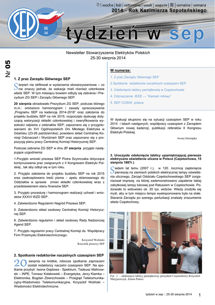 Nr 05 Newsletter Stowarzyszenia Elektryków Polskich 25-30 sierpnia 2014 W numerze: 1. Z prac Zarządu Głównego SEP 1. Z prac Zarządu Głównego SEP ierpień nie obfitował w wydarzenia stowarzyszeniowe – co nie znaczy jednak, że wakacje mieli również członkowie władz SEP. W tym miesiącu bowiem odbyły się zebrania i Prezydium ZG SEP i Zarządu Głównego SEP: S 2.Spotkanie redaktorów naczelnych czasopism SEP 20 sierpnia obradowało Prezydium ZG SEP, podczas którego m.in.: omówiono harmonogram i zasady opracowywania „Programu SEP na kadencję 2014-2018” oraz założenia do projektu budżetu SEP na rok 2015; rozpoczęto dyskusję dotyczącą waloryzacji składki członkowskiej i zweryfikowania wysokości odpisów z oddziałów SEP; zapoznano się z przygotowaniami do XVI Ogólnopolskich Dni Młodego Elektryka w Gdańsku (23-26 października); powołano skład Centralnej Komisji Odznaczeń i Wyróżnień SEP oraz zapoznano się z propozycją planu pracy Centralnej Komisji Historycznej SEP. 5. SEP COSiW poleca Podczas zebrania ZG SEP w dniu 27 sierpnia przyjęto następujące uzgodnienia: 1.Przyjęto wnioski prezesa SEP Piotra Szymczaka dotyczące kontynuowania prac związanych z II Kongresem Elektryki Polskiej , tak aby odbył się w tym roku. 2. Przyjęto założenia do projektu budżetu SEP na rok 2015 oraz zaakceptowano treść pisma – apelu skierowanego do Oddziałów w sprawie zmian składki członkowskiej wraz z przedstawieniem stanu finansów SEP. 3. Przyjęto procedurę i harmonogram realizacji uchwał i wniosków XXXVI WZD SEP . 4. Zatwierdzono Regulamin Nagród Prezesa SEP. 3. Odsłonięcie tablicy pamiątkowej w Częstochowie 4. Odznaczenie IEEE — ”Kamień milowy” W dyskusji skupiono się na sytuacji czasopism SEP w roku 2014 i latach następnych, współpracy czasopism z Zarządem Głównym nowej kadencji, publikacji referatów II Kongresu Elektryki Polskiej. Iwona Sztompka 3. Uroczyste odsłonięcie tablicy upamiętniającej pierwsze elektryczne oświetlenie uliczne w Polsce (Częstochowa, 15 sierpnia 1887r.) S iedem lat temu (2007 r.), w 120. rocznicę zapłonięcia pierwszej na ziemiach polskich elektrycznej lampy oświetlenia ulicznego, Zarząd Oddziału Częstochowskiego SEP zorganizował imprezę, na której zademonstrowano zapalenie takiej zabytkowej lampy łukowej pod Ratuszem w Częstochowie. Podziwiało to widowisko ok. 20 tys. widzów. Wtedy zrodziła się myśl, aby w tym miejscu lampa wyeksponowana była na stałe. Starania Zarządu po szeregu perturbacji znalazły zrozumienie władz Częstochowy. 5. Zatwierdzono skład osobowy Centralnej Komisji Historycznej SEP. 6. Zatwierdzono regulamin i skład osobowy Rady Nadzorczej Agend SEP. 7. Przyjęto regulamin pracy Centralnej Komisji ds. Współpracy Firm Przemysłu Elektrotechnicznego. Krzysztof Woliński Rzecznik prasowy SEP 2. Spotkanie redaktorów naczelnych czasopism SEP 20 sierpnia na krótkie, robocze spotkanie zaproszeni zostali redaktorzy naczelni czasopism SEP. Na spotkanie przybyli: Iwona Gajdowa - Spektrum, Tadeusz Malinowski – INPE, Tomasz Kołakowski – Energetyka, Jerzy Klamka – Elektronika, Bogdan Zbierzchowski – Przegląd Telekomunikacyjny-Wiadomości Telekomunikacyjne, Krzysztof Woliński – Wiadomości Elektrotechniczne. Fot. 1 – odsłonięcie tablicy pamiątkowej: prezydent Częstochowy Krzysztof Matyjaszczyk, Zenon Panicz tydzień w sep :: 25-30 sierpnia 2014 1 Nr 05 Newsletter Stowarzyszenia Elektryków Polskich 28 lipca—2 sierpnia 2014 21 sierpnia 2014 r. Prezydent Miasta Krzysztof Matyjaszczyk wspólnie z kol. Zenonem Paniczem odsłonili tablicę upamiętniającą to epokowe wydarzenie techniczne z XIX w. Tablicę umieszczono na ścianie budynku Muzeum pod Ratuszem przy Centralnym Placu im. dr W. Biegańskiego, a w bezpośredniej odległości postawiono replikę słupa oświetleniowego z tamtych lat z odtworzoną lampą łukową. Uświetnili to wydarzenie przedstawiciele naczelnych władz Stowarzyszenia Elektryków Polskich z prezesem Piotrem Szymczakiem, radni Rady Miasta Częstochowy z przewodniczącym Zdzisławem Wolskim, wiceprezes Rady Naczelnej FSNT NOT w Warszawie Grzegorz Lipowski, dziekan Rady Wydziału Elektrycznego Politechniki Częstochowskiej Fot. 2 Replika historycznej lampy, prof. Lech Borowik, przedstanęła obok ratusza. stawiciele ŚOIIB w Katowicach z wiceprzewodniczącym Waldemarem Szleperem, dyrektor O/Tauron w Częstochowie Andrzej Czerwik, Prezes Zarządu ISD Huty „Częstochowa” Anatolij Fiediajew, prezesi stowarzyszeń technicznych w Częstochowie oraz duża grupa elektryków, działaczy miejscowego Oddziału SEP z wiceprezesem Rafałem Minkiną. Zabierający głos goście byli pełni uznania dla inżynierów i pomysłowości ówczesnych notabli miejskich, potrafiących zalegalizować kwestionowane przez władze carskiej Rosji działania, a które doprowadziły do pionierskiego wyczynu technicznego na skalę Europy. Rys historyczny powstania oświetlenia ulicznego w tym miejscu przedstawił podczas imprezy członek Zarządu obecnej kadencji Oddziału Częstochowskiego SEP i prezes dwu ostatnich kadencji kol. Zenon Panicz, który do pewnego stopnia może być uznany „ojcem chrzestnym” owego wyeksponowania wydarzenia technicznego sprzed lat. Sekundowali mu Śląski Oddział Izby Inżynierów Budownictwa oraz Zakład Energetyczny TAURON Oddział Częstochowa. Instytucje te przede wszystkim (ale i inne) przyczyniły się pospołu z UM Częstochowa do wykonania tego pomnika techniki. Przytoczyć tu należy skrót wypowiedzi kol. Z. Panicza: „Pod koniec 1886 roku w Częstochowie rozpoczęto w miejscu, na którym stoimy budowę Stacji Elektrycznej dla oświetlenia ulic i placów miasta. Budowę prowadzono za pieniądze zebrane przez kasę miejską od anonimowych donatorów. W dniu Święta Wniebowzięcia Najświętszej Maryi Panny, 15 sierpnia 1887 roku o godzinie 20 uruchomiono Stację Elektryczną i zapłonęły lampy elektryczn