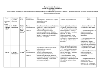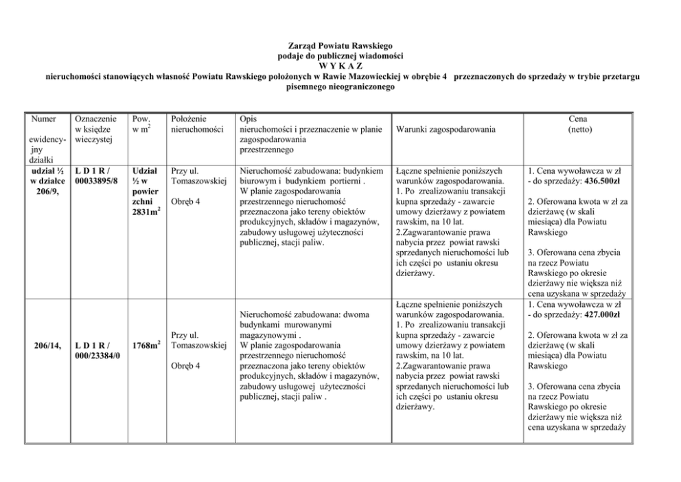Zarząd Powiatu Rawskiego podaje do publicznej wiadomości WYKAZ nieruchomości stanowiących własność Powiatu Rawskiego położonych w Rawie Mazowieckiej w obrębie 4 przeznaczonych do sprzedaży w trybie przetargu pisemnego nieograniczonego Numer Oznaczenie w księdze ewidency- wieczystej jny działki udział ½ L D 1 R / w działce 00033895/8 206/9, 206/14, LD1R/ 000/23384/0 Pow. w m2 Położenie nieruchomości Opis nieruchomości i przeznaczenie w planie zagospodarowania przestrzennego Udział ½w powier zchni 2831m2 Przy ul. Tomaszowskiej Nieruchomość zabudowana: budynkiem biurowym i budynkiem portierni . W planie zagospodarowania przestrzennego nieruchomość przeznaczona jako tereny obiektów produkcyjnych, składów i magazynów, zabudowy usługowej użyteczności publicznej, stacji paliw. 1768m2 Obręb 4 Przy ul. Tomaszowskiej Obręb 4 Nieruchomość zabudowana: dwoma budynkami murowanymi magazynowymi . W planie zagospodarowania przestrzennego nieruchomość przeznaczona jako tereny obiektów produkcyjnych, składów i magazynów, zabudowy usługowej użyteczności publicznej, stacji paliw . Warunki zagospodarowania Łączne spełnienie poniższych warunków zagospodarowania. 1. Po zrealizowaniu transakcji kupna sprzedaży - zawarcie umowy dzierżawy z powiatem rawskim, na 10 lat. 2.Zagwarantowanie prawa nabycia przez powiat rawski sprzedanych nieruchomości lub ich części po ustaniu okresu dzierżawy. Łączne spełnienie poniższych warunków zagospodarowania. 1. Po zrealizowaniu transakcji kupna sprzedaży - zawarcie umowy dzierżawy z powiatem rawskim, na 10 lat. 2.Zagwarantowanie prawa nabycia przez powiat rawski sprzedanych nieruchomości lub ich części po ustaniu okresu dzierżawy. Cena (netto) 1. Cena wywoławcza w zł - do sprzedaży: 436.500zł 2. Oferowana kwota w zł za dzierżawę (w skali miesiąca) dla Powiatu Rawskiego 3. Oferowana cena zbycia na rzecz Powiatu Rawskiego po okresie dzierżawy nie większa niż cena uzyskana w sprzedaży 1. Cena wywoławcza w zł - do sprzedaży: 427.000zł 2. Oferowana kwota w zł za dzierżawę (w skali miesiąca) dla Powiatu Rawskiego 3. Oferowana cena zbycia na rzecz Powiatu Rawskiego po okresie dzierżawy nie większa niż cena uzyskana w sprzedaży 206/7 LD1R/ 00036277/1 163m2 Przy ul. Tomaszowskiej Obręb 4 387/1, 387/2 LD1R/ 00037315/7 pow. łączna 4043m2 Przy ul. Niepodległości Obręb 4 Nieruchomość niezabudowana. W planie zagospodarowania przestrzennego nieruchomość przeznaczona jako teren komunikacji – ulica zbiorcza. Nieruchomość zabudowana budynkiem murowanym. W budynku wyodrębnione są lokale użytkowe. Jeden lokal w użytkowaniu SPZOZ. W planie zagospodarowania przestrzennego przeznaczona jako tereny służby zdrowia, opieki społecznej i socjalnej, tereny komunikacji-ulica lokalna. Łączne spełnienie poniższych warunków zagospodarowania. 1. Po zrealizowaniu transakcji kupna sprzedaży - zawarcie umowy dzierżawy z powiatem rawskim, na 10 lat. 2.Zagwarantowanie prawa nabycia przez powiat rawski sprzedanych nieruchomości lub ich części po ustaniu okresu dzierżawy. Łączne spełnienie poniższych warunków zagospodarowania. 1. Po zrealizowaniu transakcji kupna sprzedaży - zawarcie umowy dzierżawy z powiatem rawskim, na 10 lat. 2.Zagwarantowanie prawa nabycia przez powiat rawski sprzedanych nieruchomości lub ich części po ustaniu okresu dzierżawy. 1. Cena wywoławcza w zł - do sprzedaży: 32.000zł + podatek VAT. 2. Oferowana kwota w zł za dzierżawę (w skali miesiąca) dla Powiatu Rawskiego 3. Oferowana cena zbycia na rzecz Powiatu Rawskiego po okresie dzierżawy nie większa niż cena uzyskana w sprzedaży 1. Cena wywoławcza w zł - do sprzedaży: 2.820.000zł 2. Oferowana kwota w zł za dzierżawę (w skali miesiąca) dla Powiatu Rawskiego 3. Oferowana cena zbycia na rzecz Powiatu Rawskiego po okresie dzierżawy nie większa niż cena uzyskana w sprzedaży Szczegółowe informacje uzyskać można w pokoju nr 4 Starostwa Powiatowego, 96-200 Rawa Mazowiecka, pl. Wolności 1, tel.46 814-27-45 wew. 18, 19. Wykaz podaje się do publicznej wiadomości na okres 21 dni tj. od 10 czerwca 2015 r. do 30 czerwca 2015 r. Termin składania wniosków w sprawie pierwszeństwa w nabyciu działki upływa po 6 tygodniach od dnia podania wykazu do publicznej wiadomości tj. w dniu 22 lipca 2015 r.