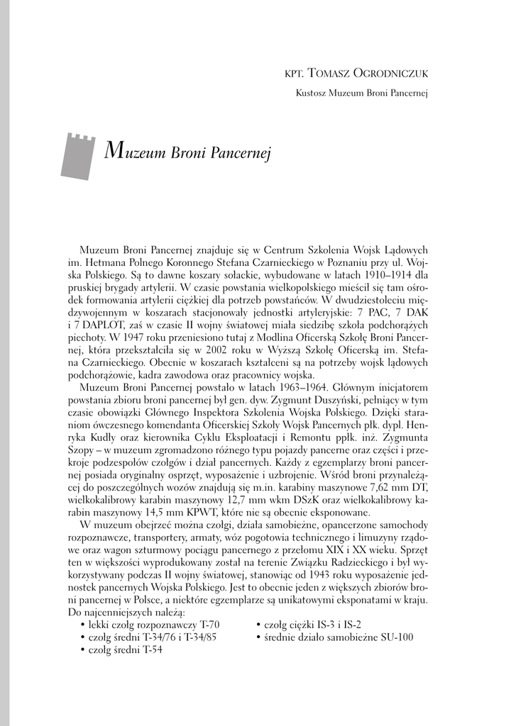 KPT. TOMASZ OGRODNICZUK Kustosz Muzeum Broni Pancernej Muzeum Broni Pancernej Muzeum Broni Pancernej znajduje si´ w Centrum Szkolenia Wojsk Làdowych im. Hetmana Polnego Koronnego Stefana Czarnieckiego w Poznaniu przy ul. Wojska Polskiego. Sà to dawne koszary so∏ackie, wybudowane w latach 1910–1914 dla pruskiej brygady artylerii. W czasie powstania wielkopolskiego mieÊci∏ si´ tam oÊrodek formowania artylerii ci´˝kiej dla potrzeb powstaƒców. W dwudziestoleciu mi´dzywojennym w koszarach stacjonowa∏y jednostki artyleryjskie: 7 PAC, 7 DAK i 7 DAPLOT, zaÊ w czasie II wojny Êwiatowej mia∏a siedzib´ szko∏a podchorà˝ych piechoty. W 1947 roku przeniesiono tutaj z Modlina Oficerskà Szko∏´ Broni Pancernej, która przekszta∏ci∏a si´ w 2002 roku w Wy˝szà Szko∏´ Oficerskà im. Stefana Czarnieckiego. Obecnie w koszarach kszta∏ceni sà na potrzeby wojsk làdowych podchorà˝owie, kadra zawodowa oraz pracownicy wojska. Muzeum Broni Pancernej powsta∏o w latach 1963–1964. G∏ównym inicjatorem powstania zbioru broni pancernej by∏ gen. dyw. Zygmunt Duszyƒski, pe∏niàcy w tym czasie obowiàzki G∏ównego Inspektora Szkolenia Wojska Polskiego. Dzi´ki staraniom ówczesnego komendanta Oficerskiej Szko∏y Wojsk Pancernych p∏k. dypl. Henryka Kud∏y oraz kierownika Cyklu Eksploatacji i Remontu pp∏k. in˝. Zygmunta Szopy – w muzeum zgromadzono ró˝nego typu pojazdy pancerne oraz cz´Êci i przekroje podzespo∏ów czo∏gów i dzia∏ pancernych. Ka˝dy z egzemplarzy broni pancernej posiada oryginalny osprz´t, wyposa˝enie i uzbrojenie. WÊród broni przynale˝àcej do poszczególnych wozów znajdujà si´ m.in. karabiny maszynowe 7,62 mm DT, wielkokalibrowy karabin maszynowy 12,7 mm wkm DSzK oraz wielkokalibrowy karabin maszynowy 14,5 mm KPWT, które nie sà obecnie eksponowane. W muzeum obejrzeç mo˝na czo∏gi, dzia∏a samobie˝ne, opancerzone samochody rozpoznawcze, transportery, armaty, wóz pogotowia technicznego i limuzyny rzàdowe oraz wagon szturmowy pociàgu pancernego z prze∏omu XIX i XX wieku. Sprz´t ten w wi´kszoÊci wyprodukowany zosta∏ na terenie Zwiàzku Radzieckiego i by∏ wykorzystywany podczas II wojny Êwiatowej, stanowiàc od 1943 roku wyposa˝enie jednostek pancernych Wojska Polskiego. Jest to obecnie jeden z wi´kszych zbiorów broni pancernej w Polsce, a niektóre egzemplarze sà unikatowymi eksponatami w kraju. Do najcenniejszych nale˝à: • lekki czo∏g rozpoznawczy T-70 • czo∏g ci´˝ki IS-3 i IS-2 • czo∏g Êredni T-34/76 i T-34/85 • Êrednie dzia∏o samobie˝ne SU-100 • czo∏g Êredni T-54 42 Fortyfikacje Ostrowa Tumskiego Ogromnà atrakcjà dla zwiedzajàcych jest czo∏g Êredni T-34/85 RUDY znany z filmu Czterej pancerni i pies. Wszystkie uj´cia i dzia∏anie za∏ogi we wn´trzu pojazdu realizowane by∏y w∏aÊnie w tym eksponacie. Wyci´cia w pancerzu pokazujà nie tylko wn´trze wozu, ale tak˝e przekrój wi´kszoÊci jego elementów (rozmieszczenie amunicji, gruboÊç pancerza itp.). Niedawno do kolekcji do∏àczono limuzyn´ rzàdowà Zi∏ 111D cabrio z 1965 roku, wo˝àcà dygnitarzy rzàdowych (Wies∏awa Gomu∏k´, Edwarda Gierka i generalicj´ z lat 60. i 70.), wagon szturmowy (prawdopodobnie pociàgu pancernego nr 11 „Poznaƒczyk”) z okresu powstania wielkopolskiego, samochody pancerne Volvo 760 GLE i Peugeot 604 TI, które wozi∏y trzech prezydentów III RP. 27 lipca 2006 roku prosto z poligonu trafi∏ na ekspozycj´ prototyp polskiego czo∏gu „Wilk” PT-91M, który s∏u˝y∏ przez wiele lat poznaƒskim pancerniakom. W 2008 roku, dzi´ki staraniom komendanta CSWL p∏k. Jaros∏awa Wierzcholskiego muzeum wzbogaci∏o si´ o dwa dzia∏a samobie˝ne 2S1 „Goêdzik” oraz 2S7 „Pion”. W tym samym roku w lipcu grupie pasjonatów skupionych wokó∏ Muzeum Broni Pancernej uda∏o si´ wydobyç z rzeki Rgilewki w Grzegorzewie unikatowy pojazd z czasów II wojny – niemieckie dzia∏o pancerne StuG IV, które znajdowa∏o si´ na wyposa˝eniu jednostek artylerii szturmowej i jednostek pancernych. S∏u˝y∏o g∏ównie do niszczenia czo∏gów, lekko opancerzonych pojazdów, umocnieƒ polowych i stanowisk artylerii. Wyremontowany pojazd jest jedynym sprawnym egzemplarzem na Êwiecie i w 95 procentach zbudowany jest z oryginalnych cz´Êci. Czo∏g z filmu „Czterej pancerni i pies”. Muzeum Broni Pancernej W 2008 roku na cele muzealne zaadaptowano budynek starej kuêni z 1913 roku. Nieocenionà pomoc w pracach remontowych zabytkowego budynku muzeum otrzyma∏o od Mariana Baliƒskiego, organizujàc wystaw´ strojów i uzbrojenia z filmu Ogniem i mieczem. Pretekstem do urzàdzenia wystawy by∏ mi´dzynarodowy rajd motocyklowy z okazji 350. rocznicy wyprawy hetmana Stefana Czarnieckiego na czele wojsk Rzeczypospolitej do Danii. Poznaƒski etap rajdu zorganizowano wspólnie z Wydzia∏em Rozwoju Miasta – Biurem Programu „Trakt Królewsko-Cesarski w Poznaniu”. Kilkuset motocyklistów pod kierownictwem ksi´dza Jana Zalewskiego, mieszkajàcego i prowadzàcego duszpasterskà pos∏ug´ w Danii, przemierzy∏o ∏àcznie prawie 3,5 tysiàca kilometrów. Rajd odbywa∏ si´ pod has∏em ,,Ojców naszych starym szlakiem – jak Czarniecki do Poznania”. Wspólna inicjatywa w∏adz Poznania, rodaków z Danii oraz ˝o∏nierzy i pracowników Centrum Szkolenia Wojsk Làdowych pokazuje, jak w ciekawy sposób przybli˝aç histori´ oraz bogatà tradycj´ or´˝a polskiego. Kolejnym wspólnym projektem Urz´du Miasta Poznania – Programu „Trakt Królewsko-Cesarski w Poznaniu” i CSWL jest „Dzieƒ Otwartych Koszar”. Impreza w ramach Europejskich Dni Dziedzictwa kulturowego odbywaç si´ b´dzie w Centrum Szkolenia Wojsk Làdowych pod has∏em „Zabytkom na odsiecz! Szlakiem grodów, zamków i twierdz”. Limuzyna dygnitarzy rzàdowych z lat 60. XX w. 43
