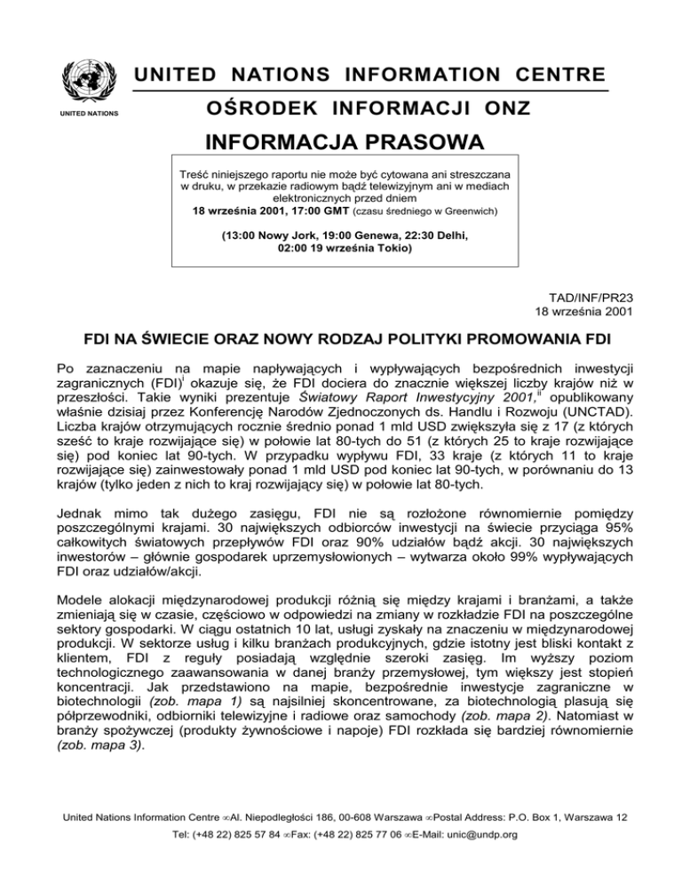 UNITED NATIONS INFORMATION CENTRE UNITED NATIONS OŚRODEK INFORMACJI ONZ INFORMACJA PRASOWA Treść niniejszego raportu nie może być cytowana ani streszczana w druku, w przekazie radiowym bądź telewizyjnym ani w mediach elektronicznych przed dniem 18 września 2001, 17:00 GMT (czasu średniego w Greenwich) (13:00 Nowy Jork, 19:00 Genewa, 22:30 Delhi, 02:00 19 września Tokio) TAD/INF/PR23 18 września 2001 FDI NA ŚWIECIE ORAZ NOWY RODZAJ POLITYKI PROMOWANIA FDI Po zaznaczeniu na mapie napływających i wypływających bezpośrednich inwestycji zagranicznych (FDI)i okazuje się, że FDI dociera do znacznie większej liczby krajów niż w przeszłości. Takie wyniki prezentuje Światowy Raport Inwestycyjny 2001,ii opublikowany właśnie dzisiaj przez Konferencję Narodów Zjednoczonych ds. Handlu i Rozwoju (UNCTAD). Liczba krajów otrzymujących rocznie średnio ponad 1 mld USD zwiększyła się z 17 (z których sześć to kraje rozwijające się) w połowie lat 80-tych do 51 (z których 25 to kraje rozwijające się) pod koniec lat 90-tych. W przypadku wypływu FDI, 33 kraje (z których 11 to kraje rozwijające się) zainwestowały ponad 1 mld USD pod koniec lat 90-tych, w porównaniu do 13 krajów (tylko jeden z nich to kraj rozwijający się) w połowie lat 80-tych. Jednak mimo tak dużego zasięgu, FDI nie są rozłożone równomiernie pomiędzy poszczególnymi krajami. 30 największych odbiorców inwestycji na świecie przyciąga 95% całkowitych światowych przepływów FDI oraz 90% udziałów bądź akcji. 30 największych inwestorów – głównie gospodarek uprzemysłowionych – wytwarza około 99% wypływających FDI oraz udziałów/akcji. Modele alokacji międzynarodowej produkcji różnią się między krajami i branżami, a także zmieniają się w czasie, częściowo w odpowiedzi na zmiany w rozkładzie FDI na poszczególne sektory gospodarki. W ciągu ostatnich 10 lat, usługi zyskały na znaczeniu w międzynarodowej produkcji. W sektorze usług i kilku branżach produkcyjnych, gdzie istotny jest bliski kontakt z klientem, FDI z reguły posiadają względnie szeroki zasięg. Im wyższy poziom technologicznego zaawansowania w danej branży przemysłowej, tym większy jest stopień koncentracji. Jak przedstawiono na mapie, bezpośrednie inwestycje zagraniczne w biotechnologii (zob. mapa 1) są najsilniej skoncentrowane, za biotechnologią plasują się półprzewodniki, odbiorniki telewizyjne i radiowe oraz samochody (zob. mapa 2). Natomiast w branży spożywczej (produkty żywnościowe i napoje) FDI rozkłada się bardziej równomiernie (zob. mapa 3). United Nations Information Centre • Al. Niepodległości 186, 00-608 Warszawa • Postal Address: P.O. Box 1, Warszawa 12 Tel: (+48 22) 825 57 84 • Fax: (+48 22) 825 77 06 • E-Mail: [email protected] UNITED NATIONS INFORMATION CENTRE UNITED NATIONS OŚRODEK INFORMACJI ONZ Na poziomie funkcyjnym, nawet tak istotne obszary wyspecjalizowanych kwalifikacji firmy jak projektowanie, B+R oraz zarządzanie finansami nabierają obecnie coraz bardziej międzynarodowego charakteru w celu optymalizacji kosztów, efektywności i elastyczności. Miejscom o mniejszym stopniu uprzemysłowienia przydzielane są prostsze zadania, np. obsługa linii montażowych i pakowanie, natomiast funkcje wymagające większych umiejętności i bardziej zaawansowanych technologii są alokowane do miejsc o wyższym stopniu rozwoju przemysłu. Autorzy raportu zauważają, że zwiększający się zasięg i mobilność korporacji iii ponadnarodowych sprawia, że lokalne warunki stają się bardziej, a nie mniej istotne. Mobilne FDI kumulują się tylko w tych miejscach, gdzie istnieją efektywne czynniki uzupełniające. Decydując o wyborze lokalizacji należy rozważyć, czy kraje gościnne są zdolne do zaoferowania komplementarnych umiejętności, infrastruktury, dostawców i instytucji potrafiących sprawnie i elastycznie wykorzystywać technologie. Centra przemysłowe odgrywają coraz większą rolę w działalności gospodarczej firm, zwłaszcza, jeśli jest ona zaawansowana technologicznie. Nieustannie poszukując nowych sposobów na uzyskanie przewagi konkurencyjnej, korporacje ponadnarodowe poszukują po całym świecie tzw. „aktywów wytworzonych”, czyli na przykład technologii oraz wykwalifikowanych pracowników. Centra innowacyjności – reprezentowane między innymi przez Dolinę Krzemową, w stanie Kalifornia; Silicon Fen, w Cambridge; Dolinę Bezprzewodową w Sztokholmie; czy Thong Guancum, dzielnicę Pekinu – posiadają wyraźną przewagę, jeśli chodzi o przyciąganie takich (wysokowartościowych) FDI. Wykorzystanie i rozbudowywanie skupisk w celu przyciągnięcia FDI wymaga zastosowania nowego podejścia, wykraczającego poza pierwszą i drugą generację polityki promowania inwestycji. Stosując politykę pierwszej generacji, państwa liberalizują swoje reżimy FDI i zaczynają prowadzić politykę przyjazną dla rynku. W drugiej generacji, rządy państw posuwają się o krok dalej i aktywnie poszukują sposobów na przyciągnięcie FDI głównie poprzez „sprzedawanie” swoich krajów na innych rynkach. Taka postawa prowadzi do powołania krajowych agencji zajmujących się promowaniem inwestycji. Polityka promowania inwestycji trzeciej generacji zakłada, przy uwzględnieniu priorytetów rozwojowych kraju, docieranie do inwestorów zagranicznych na poziomie branż przemysłowych i przedsiębiorstw w celu poznania ich specyficznych wymagań co do warunków w miejscu lokalizacji pod kątem ich działalności i rodzaju skupisk przemysłowych. Bardzo ważnym elementem takiego promowania inwestycji jest unowocześnienie – i sprzedanie – poszczególnych miejsc potencjalnym inwestorom z danej branży. Jednakże docieranie do inwestorów, a zwłaszcza rozwój lokalnych „marek handlowych”, jest trudnym i czasochłonnym zadaniem. Niezbędne okazuje się posiadanie stosunkowo dobrze rozwiniętej infrastruktury instytucjo