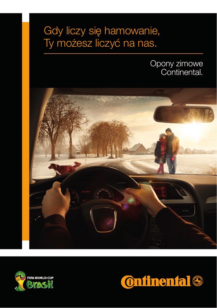 Gdy liczy się hamowanie, Ty możesz liczyć na nas. Opony zimowe Continental. Skuteczne hamowanie kluczem do bezpiecznej jazdy zimą. Bo zima rządzi się swoimi prawami. W miesiącach zimowych możemy się spodziewać ujemnych temperatur i śliskich nawierzchni. Kierowcy muszą się upewnić, czy ich opony są wystarczająco dobre, zwłaszcza w takich krajach europejskich, jak Niemcy, Austria czy Finlandia, w których wprowadzono obowiązek używania opon zimowych przy gołoledzi, ubitym śniegu i błocie pośniegowym lub w ujemnych temperaturach. Pogody oczywiście nie da się zaplanować. Najrozsądniej jest być stale przygotowanym. Można więc używać opon zimowych w okresie od października do Wielkanocy lub gdy temperatura spada poniżej 7 °C. Opony całoroczne – nie idź na kompromisy. W testach hamowania i prowadzenia w warunkach zimowych, w porównaniu do opon zimowych, opony całoroczne wypadają poniżej średniej. Ich droga hamowania na śniegu, lodzie i w niskich temperaturach może być nawet o 11 metrów dłuższa, a prędkość uderzenia w przeszkodę aż o 25,6 km/h większa. Nic dziwnego, skoro zaprojektowano je tak, by znosiły różnice temperatur sięgające 50 °C. W efekcie zimą Twoje bezpieczeństwo szybko zbacza z obranej drogi. Hamowanie na śniegu.* Opony zimowe Opony całoroczne +11 m Prędkość szczątkowa: 25,6 km/h Opony letnie +20 m Hamowanie przy prędkości 50 km/h Prędkość szczątkowa: 35,4 km/h * Podane drogi hamowania oraz różnice pomiędzy oponami letnimi i zimowymi zmierzono dla standardowych pojazdów. Ilustracje służą wyłącznie do celów poglądowych. Droga hamowania każdego pojazdu zależy od jego typu, rodzaju zastosowanych hamulców i opon, a także nawierzchni. Z tego względu dostarczone dane nie powinny być traktowane jako ogólny opis właściwości produktu. (Źródło: Continental AG). CO NT IN L– TA EN TESTOW MAN ENG GER INE ER I NG Trudne zimowe warunki wymagają jeszcze trudniejszych testów. A TWOJ ANE DL EGO A ZEŃSTW BEZPIEC OD U OK 1871 R Żadna odległość nie jest zbyt duża, gdy chodzi o Twoje bezpieczeństwo. Po opracowaniu nowych opon nasz dział testów przejeżdża ponad 20 milionów kilometrów rocznie na mokrej i suchej nawierzchni, a także na śniegu i lodzie, zanim spełnią one nasze normy jakościowe i będą mogły trafić do sprzedawców detalicznych. Oznacza to, że kierowcy testowi okrążają kulę ziemską ponad 500 razy i pokonują ponad 20 000 zakrętów w warunkach zimowych. Długość samej tylko drogi hamowania pokonywanej w czasie testów przekracza 1 700 km. Imponujące wyniki, wymagają jednak szczególnego zaangażowania w najtrudniejszych warunkach. Nasze zespoły testowe znajdują te idealne warunki na śniegu i lodzie praktycznie przez okrągły rok – zimą w północnej Laponii i Szwecji (Jokkmokk i Arvidsjaur), a latem w okolicach Wanaka w odległej Nowej Zelandii, 1 500 metrów n.p.m. Wszystko zmienia się przy 7 °C. Całe bezpieczeństwo tkwi w mieszance. Gdy jesienią spada temperatura, musisz jeszcze bardziej pamiętać o swoim bezpieczeństwie. Stosowana w oponach letnich mieszanka zaczyna bowiem twardnieć przy 7 °C, ograniczając ich przyczepność do nawierzchni. Dzięki innowacyjnej mieszance gumowej, opony zimowe produkowane przez firmę Continental pozostają elastyczne nawet wtedy, gdy temperatura spada znacznie poniżej zera. Możesz się więc odprężyć, wiedząc, że troszczymy się o Ciebie. Hamowanie na śniegu*: Opony zimowe Opony letnie +31 m Hamowanie przy prędkości 50 km/h Prędkość szczątkowa: 35,4 km/h Płatek śniegu dla większego bezpieczeństwa. W firmie Continental bezpieczeństwo jest podstawą wszystkiego co robimy i ma to odzwierciedlenie w symbolach, których używamy. W warunkach zimowych, opony z symbolem płatka śniegu wpisanego w górę trzymają się nawierzchni, aż o 7 % lepiej niż opony standardowe. Opony M+S dla bardziej efektywnego hamowania zimą. Opony z oznaczeniem M+S oferują większą stabilność kierunkową w błocie i śniegu, niż normalne opony, chociaż ich właściwości jezdne nie mogą być porównywane z odpowiednimi oponami zimowymi. Stąpaj bezpiecznie. Bądź bezpieczny z co najmniej 4 mm bieżnikiem. W Europie prawo wymaga, by głębokość bieżnika wynosiła nie mniej niż 1,6 mm. Eksperci są jednak zgodni, że opony o głębokości bieżnika poniżej 4 mm nie nadają się do użytku zimą i mogą zwiększać ryzyko wypadku. Im płytszy bieżnik, tym dłuższa droga hamowania. Rownież z tego powodu przed każdym sezonem zimowym należy skontrolować opony zimowe. Wpływ głębokości bieżnika.* 8 mm 4 mm +14 m Prędkość szczątkowa: 27,9 km/h 1.6 mm +26 m Hamowanie przy 50 km/h Prędkość szczątkowa: 33,8 km/h Bezpieczeństwo na pierwszy rzut oka. Wskaźnik zużycia opony TWI określa czy opony nadają się do użytku zimą. Jeśli wskaźnik ten jest na tym samym poziomie co powierzchnia bieżnika, to głębokość bieżnika jest mniejsza niż 4 mm. Pora na nowe opony zimowe Continental! * Podane drogi hamowania oraz różnice pomiędzy oponami letnimi i zimowymi zmierzono dla standardowych pojazdów. Ilustracje służą wyłącznie do celów poglądowych. Droga hamowania każdego pojazdu zależy od jego typu, rodzaju zastosowanych hamulców i opon, a także nawierzchni. Z tego względu dostarczone dane nie powinny być traktowane jako ogólny opis właściwości produktu. (Źródło: Continental AG). Opony do samochodów osobowych i 4x4. ContiWinterContact™ TS 850 do samochodów kompaktowych i klasy średniej a Wyższa skuteczność hamowania na śniegu, lodzie i mokrej nawierzchni. a Doskonała stabilność w każdych warunkach zimowych. a Bardziej ekonomiczna dzięki ograniczonym oporom toczenia i lepszej charakterystyce jazdy. „dobra” Numer 10/2012 205/55 R16 H ContiWinterContact™ TS 800 do samochodów kompaktowych a Znakomita stabilność i trakcja na zakrętach. a Doskonałe pro