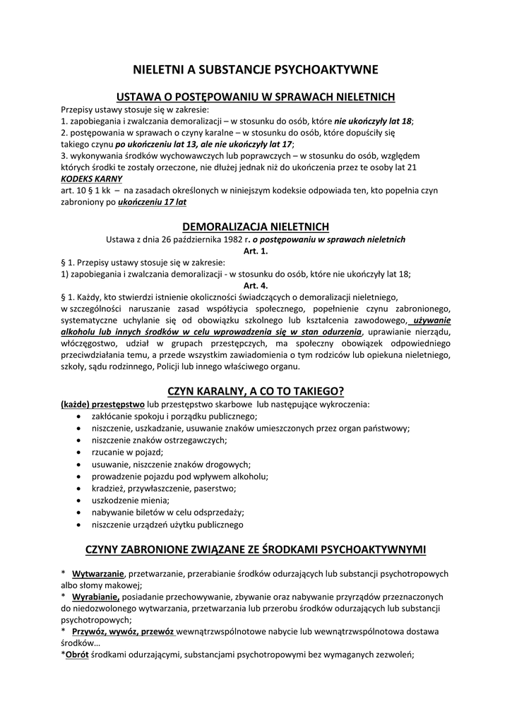 NIELETNI A SUBSTANCJE PSYCHOAKTYWNE USTAWA O POSTĘPOWANIU W SPRAWACH NIELETNICH Przepisy ustawy stosuje się w zakresie: 1. zapobiegania i zwalczania demoralizacji – w stosunku do osób, które nie ukończyły lat 18; 2. postępowania w sprawach o czyny karalne – w stosunku do osób, które dopuściły się takiego czynu po ukończeniu lat 13, ale nie ukończyły lat 17; 3. wykonywania środków wychowawczych lub poprawczych – w stosunku do osób, względem których środki te zostały orzeczone, nie dłużej jednak niż do ukończenia przez te osoby lat 21 KODEKS KARNY art. 10 § 1 kk – na zasadach określonych w niniejszym kodeksie odpowiada ten, kto popełnia czyn zabroniony po ukończeniu 17 lat DEMORALIZACJA NIELETNICH Ustawa z dnia 26 października 1982 r. o postępowaniu w sprawach nieletnich Art. 1. § 1. Przepisy ustawy stosuje się w zakresie: 1) zapobiegania i zwalczania demoralizacji - w stosunku do osób, które nie ukończyły lat 18; Art. 4. § 1. Każdy, kto stwierdzi istnienie okoliczności świadczących o demoralizacji nieletniego, w szczególności naruszanie zasad współżycia społecznego, popełnienie czynu zabronionego, systematyczne uchylanie się od obowiązku szkolnego lub kształcenia zawodowego, używanie alkoholu lub innych środków w celu wprowadzenia się w stan odurzenia, uprawianie nierządu, włóczęgostwo, udział w grupach przestępczych, ma społeczny obowiązek odpowiedniego przeciwdziałania temu, a przede wszystkim zawiadomienia o tym rodziców lub opiekuna nieletniego, szkoły, sądu rodzinnego, Policji lub innego właściwego organu. CZYN KARALNY, A CO TO TAKIEGO? (każde) przestępstwo lub przestępstwo skarbowe lub następujące wykroczenia: zakłócanie spokoju i porządku publicznego; niszczenie, uszkadzanie, usuwanie znaków umieszczonych przez organ państwowy; niszczenie znaków ostrzegawczych; rzucanie w pojazd; usuwanie, niszczenie znaków drogowych; prowadzenie pojazdu pod wpływem alkoholu; kradzież, przywłaszczenie, paserstwo; uszkodzenie mienia; nabywanie biletów w celu odsprzedaży; niszczenie urządzeń użytku publicznego CZYNY ZABRONIONE ZWIĄZANE ZE ŚRODKAMI PSYCHOAKTYWNYMI * Wytwarzanie, przetwarzanie, przerabianie środków odurzających lub substancji psychotropowych albo słomy makowej; * Wyrabianie, posiadanie przechowywanie, zbywanie oraz nabywanie przyrządów przeznaczonych do niedozwolonego wytwarzania, przetwarzania lub przerobu środków odurzających lub substancji psychotropowych; * Przywóz, wywóz, przewóz wewnątrzwspólnotowe nabycie lub wewnątrzwspólnotowa dostawa środków… *Obrót środkami odurzającymi, substancjami psychotropowymi bez wymaganych zezwoleń; *Wytwarzanie, wprowadzanie do obrotu na terytorium Rzeczypospolitej Polskiej środków zastępczych; *Przystosowywanie do niedozwolonego wytwarzania, przetwarzania, przerobu lub konsumpcji środków... naczynia i przyrządy, choćby były wytworzone w innym celu; *Udzielanie innej osobie środka odurzającego lub substancji psychotropowej, ułatwianie oraz umożliwienie ich użycia oraz nakłanianie do użycia takiego środka lub substancji; *Udzielanie, ułatwianie, umożliwienie ich użycia oraz nakłanianie do użycia innej osoby w celu osiągnięcia korzyści majątkowej lub osobistej *Posiadanie środków odurzających lub substancji psychotropowych; *Uprawa maku a także konopi bez stosownego zezwolenia; *Zbieranie mleczka makowego, opium, słomy makowej, żywicy lub słomy makowej; *Kradzież, przywłaszczenie oraz kradzież z włamaniem środków odurzających, substancji psychotropowych, mleczka makowego lub słomy makowej; Kto wytwarza lub wprowadza do obrotu na terytorium Rzeczypospolitej Polskiej środek zastępczy lub nową substancję psychoaktywną, podlega karze pieniężnej w wysokości od 20 000 zł do 1 000 000 zł. KONSEKWENCJE Ustawa z dnia 26 października 1982 r. o postępowaniu w sprawach nieletnich Art. 6. Wobec nieletnich sąd rodzinny może: 1) udzielić upomnienia; 2) zobowiązać do określonego postępowania, a zwłaszcza do naprawienia wyrządzonej szkody, do wykonania określonych prac lub świadczeń na rzecz pokrzywdzonego lub społeczności lokalnej, do przeproszenia pokrzywdzonego, do podjęcia nauki lub pracy, do uczestniczenia w odpowiednich zajęciach o charakterze wychowawczym, terapeutycznym lub szkoleniowym, do powstrzymania się od przebywania w określonych środowiskach lub miejscach albo do zaniechania używania alkoholu lub innego środka w celu wprowadzania się w stan odurzenia; 3) ustanowić nadzór odpowiedzialny rodziców lub opiekuna; 4) ustanowić nadzór organizacji młodzieżowej lub innej organizacji społecznej, zakładu pracy albo osoby godnej zaufania - udzielających poręczenia za nieletniego; 5) zastosować nadzór kuratora; 6) skierować do ośrodka kuratorskiego, a także do organizacji społecznej lub instytucji zajmujących się pracą z nieletnimi o charakterze wychowawczym, terapeutycznym lub szkoleniowym, po uprzednim porozumieniu się z tą organizacją lub instytucją; Ustawa z dnia 26 października 1982 r. o postępowaniu w sprawach nieletnich Art. 6. Wobec nieletnich sąd rodzinny może: 7) orzec zakaz prowadzenia pojazdów; 8) orzec przepadek rzeczy uzyskanych w związku z popełnieniem czynu karalnego; 9) orzec umieszczenie w młodzieżowym ośrodku wychowawczym albo w rodzinie zastępczej zawodowej, która ukończyła szkolenie przygotowujące do sprawowania opieki nad nieletnim; 10) orzec umieszczenie w zakładzie poprawczym; 11) zastosować inne środki zastrzeżone w niniejszej ustawie do właściwości sądu rodzinnego, jak również zastosować środki przewidziane w Kodeksie rodzinnym i opiekuńczym, z wyłączeniem umieszczenia w rodzinie zastępczej spokrewnionej, rodzinie zastępczej niezawodowej, rodzinnym domu dziecka, placówce wsparcia dziennego, placówce opiekuńczo-wychowawczej i regionalnej placówce opiekuńczo-terapeutycznej. CZY REAGOWA