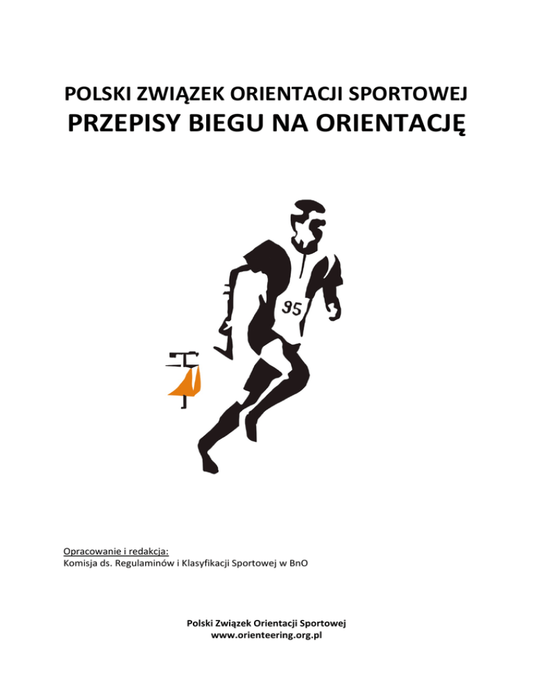 POLSKI ZWIĄZEK ORIENTACJI SPORTOWEJ PRZEPISY BIEGU NA ORIENTACJĘ Opracowanie i redakcja: Komisja ds. Regulaminów i Klasyfikacji Sportowej w BnO Polski Związek Orientacji Sportowej www.orienteering.org.pl 1. Ważność przepisów. 1.1. Niniejsze przepisy (zwane dalej Przepisami BnO) obowiązują we wszystkich zawodach w biegu na orientację organizowanych przez jednostki zrzeszone lub na zlecenie Polskiego Związku Orientacji Sportowej zwanego dalej PZOS, lub na zlecenie wojewódzkich związków sportowych zwanych dalej WZS. 1.2. Przepisy BnO mają zastosowanie we wszystkich zawodach w biegu na orientację organizowanych przez jednostki zrzeszone lub na zlecenie PZOS, o ile przepisy szczegółowe danych zawodów czy konkurencji nie stanowią inaczej. 1.3. Zawody związane z rywalizacją międzynarodową muszą być przeprowadzone zgodnie z aktualnymi przepisami Międzynarodowej Federacji Orientacji Sportowej (zwanej dalej IOF). 1.4. Przepisy BnO obowiązują zawodników, sędziów, trenerów, organizatorów oraz widzów. Ich nieznajomość nie stanowi okoliczności usprawiedliwiającej. 1.5. Zawody powinny być przeprowadzone tak, by zawodnicy nie byli w sposób nieuzasadniony, prowokowani do naruszania niniejszych przepisów. 1.6. Dodatkowe przepisy mogą być dodane przez organizatora w Regulaminie Zawodów pod warunkiem, że nie kolidują one z tymi przepisami i regulaminami sportowymi i uzyskają zgodę Komisji ds. Regulaminów i Klasyfikacji Sportowej w BnO. 1.7. W sztafetach stosuje się przepisy dot. biegów indywidualnych o ile inne zapisy nie stanowią inaczej. 2. Postanowienia ogólne. 2.1. Bieg na orientację jest dyscypliną sportu, w której zawodnik (osoba, która uprawia dyscyplinę i uczestniczy w rywalizacji) posługując się mapą i kompasem, ma za zadanie w jak najkrótszym czasie pokonać trasę wyznaczoną przez umieszczone w terenie punkty kontrolne (zwane dalej PK). 2.2. Dla interpretacji niniejszych przepisów przez zawodników, organizatorów i sędziów podstawowym wyznacznikiem powinny być zasady „fair play”. 3. Podział zawodów BnO. 3.1. Ze względu na formę: 3.1.1. Indywidualne - zawodnicy biegają pojedynczo i są klasyfikowani indywidualnie. 3.1.2. Sztafetowe - zawody, w których kolejne wyznaczone odcinki trasy (zmiany) pokonują bezpośrednio po sobie kolejni zawodnicy zespołu - sztafety. Sztafeta składa się minimum z dwóch zmian. 3.1.3. Drużynowe - zawody indywidualne lub sztafetowe z punktacją drużynową (suma czasów lub punktacja miejsc zawodników drużyny). 3.2. Ze względu na porę dnia: 3.2.1. Dzienne - odbywają się między wschodem, a zachodem słońca. 3.2.2. Nocne - odbywają się w naturalnej ciemności t.j 90 min. po zachodzie, a 90 min. przed wschodem słońca. 3.2.3. Dzienno-nocne lub nocno-dzienne - czas ich rozgrywania przekracza okresy przewidziane dla zawodów dziennych lub nocnych. 3.3. Ze względu na długość tras: 3.3.1. Sprint – opis w pkt. 15.4.1 3.3.2. Średniodystansowe (IOF. middle distance) – opis w pkt. 15.4.2 3.3.3. Klasyczne (IOF long distance) – opis w pkt. 15.4.3 3.3.4. Długodystansowe (IOF superlong distance) – opis w pkt. 15.4.5 3.3.5. Micro-O 3.3.6. Inne dystanse 3.4. Ze względu na sposób określania wyników zawodów: 3.4.1. Jednoetapowe (wyniki pojedynczego biegu są wynikami końcowymi zawodów). 3.4.2. Wieloetapowe (końcowy rezultat jest wynikiem połączonych rezultatów dwóch lub kilku etapów). 3.4.3. Zawody kwalifikacyjne (zawodnicy są kwalifikowani do finałowego biegu w wyniku jednego lub kilku biegów kwalifikacyjnych, w których mogą być podzieleni na różne grupy. Ostateczne wyniki zawodów są wyłącznie wynikami biegu/biegów finałowych. Może odbyć się kilka finałów (finał A, finał B, itd.), w których zawodnicy biegający w finale B zajmują w wynikach kolejność po zawodnikach finału A, itd. 3.5. Ze względu na rangę: 3.5.1. Międzynarodowe - związane z rywalizacją międzynarodową i umieszczone w kalendarzu IOF (World Games, World Orienteering Championships, World Cup, Junior World Orienteering Championships, European Youth Orienteering Championship, World Master Orienteering Championships, World Ranking Events, Regional Championships) 3.5.2. Ogólnopolskie - umieszczone w Centralnym Terminarzu Zawodów PZOS (zwanym dalej CTZ). W ramach CTZ rozgrywane są w szczególności imprezy mistrzowskie: Ogólnopolska Olimpiada Młodzieży, Mistrzostwa Polski Juniorów Młodszych, Juniorów, Młodzieżowców, Seniorów, Weteranów, Puchar Najmłodszych, Klubowe Mistrzostwa Polski. 3.5.3. Regionalne - umieszczone w regionalnych terminarzach zawodów (zwanych dalej RTZ) jako zawody rankingowe (A-RTZ) lub popularyzacyjne (B-RTZ). 3.6. Ze względu na kolejność potwierdzania PK 3.6.1. Z potwierdzaniem PK w określonej kolejności (kolejność jest obligatoryjna). 3.6.2. Z potwierdzaniem PK w nieokreślonej kolejności (zawodnik ma dowolność wyboru kolejności). 3.7. Ze względu na wyposażenie i usytuowanie PK 3.7.1. Tradycyjne - PK mają widoczny kod i brak potwierdzenia PK równoznaczny jest z nieklasyfikowaniem zawodnika) 3.7.2. Micro-O - PK nie mają kodów, a w bliskim sąsiedztwie ustawione są inne PK, za brak potwierdzenia właściwego PK zawodnikowi do uzyskanego czasu biegu dolicza się dodatkowe minuty – zobacz oddzielne przepisy dot. Micro-O) 4. Nadawanie licencji sportowych klubom (sekcjom) i zawodnikom. 4.1. Przyjęcie klubu (sekcji) w poczet członków PZOS następuje zgodnie z „Postanowieniem w sprawie zasad nadawania i pozbawiania licencji uprawniających kluby sportowe do udziału we współzawodnictwie sportowym w orientacji sportowej”. 4.2. Nadanie licencji sportowej zawodnikowi w PZOS następuje zgodnie z „Postanowieniem w sprawie zasad przyznawania zawodnikom licencji na uprawianie biegu na orientację”. 4.3. Zarząd PZOS może wprowadzić składki członkowskie dla klubów i zawodników, których wysokość powinna być ustalana
