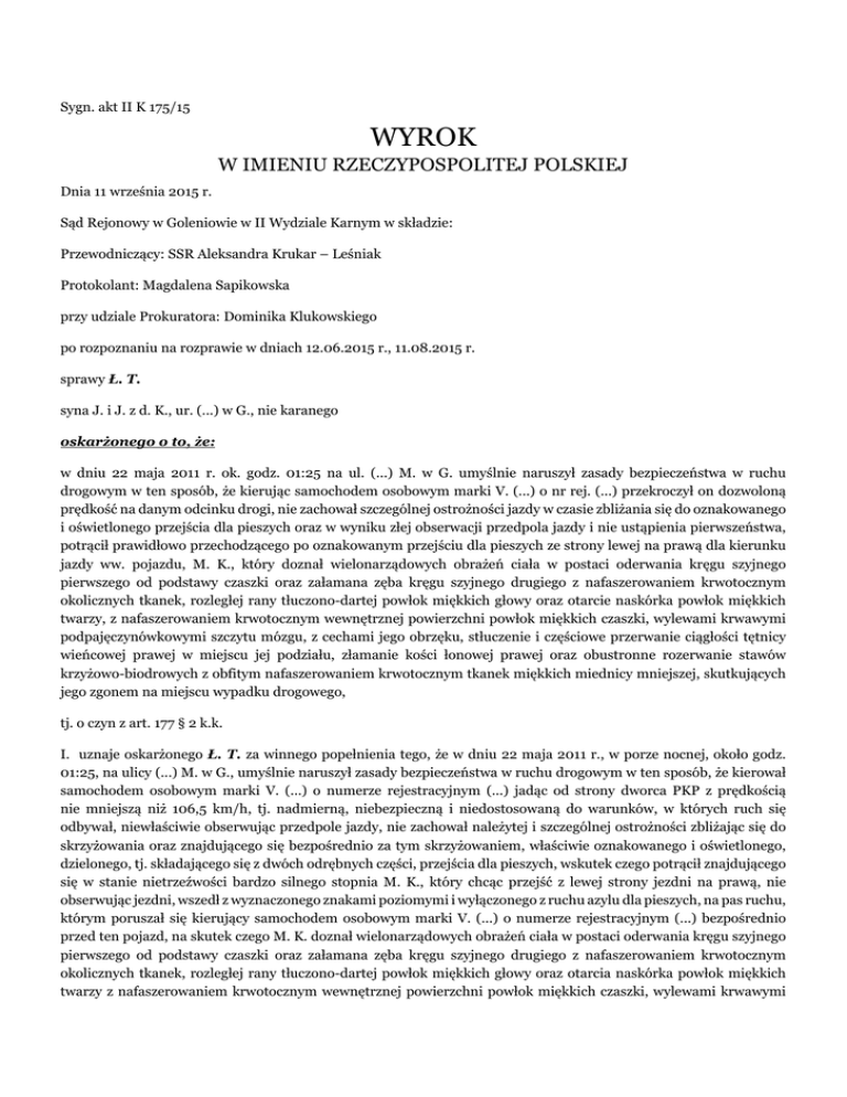 Sygn. akt II K 175/15 WYROK W IMIENIU RZECZYPOSPOLITEJ POLSKIEJ Dnia 11 września 2015 r. Sąd Rejonowy w Goleniowie w II Wydziale Karnym w składzie: Przewodniczący: SSR Aleksandra Krukar – Leśniak Protokolant: Magdalena Sapikowska przy udziale Prokuratora: Dominika Klukowskiego po rozpoznaniu na rozprawie w dniach 12.06.2015 r., 11.08.2015 r. sprawy Ł. T. syna J. i J. z d. K., ur. (...) w G., nie karanego oskarżonego o to, że: w dniu 22 maja 2011 r. ok. godz. 01:25 na ul. (...) M. w G. umyślnie naruszył zasady bezpieczeństwa w ruchu drogowym w ten sposób, że kierując samochodem osobowym marki V. (...) o nr rej. (...) przekroczył on dozwoloną prędkość na danym odcinku drogi, nie zachował szczególnej ostrożności jazdy w czasie zbliżania się do oznakowanego i oświetlonego przejścia dla pieszych oraz w wyniku złej obserwacji przedpola jazdy i nie ustąpienia pierwszeństwa, potrącił prawidłowo przechodzącego po oznakowanym przejściu dla pieszych ze strony lewej na prawą dla kierunku jazdy ww. pojazdu, M. K., który doznał wielonarządowych obrażeń ciała w postaci oderwania kręgu szyjnego pierwszego od podstawy czaszki oraz załamana zęba kręgu szyjnego drugiego z nafaszerowaniem krwotocznym okolicznych tkanek, rozległej rany tłuczono-dartej powłok miękkich głowy oraz otarcie naskórka powłok miękkich twarzy, z nafaszerowaniem krwotocznym wewnętrznej powierzchni powłok miękkich czaszki, wylewami krwawymi podpajęczynówkowymi szczytu mózgu, z cechami jego obrzęku, stłuczenie i częściowe przerwanie ciągłości tętnicy wieńcowej prawej w miejscu jej podziału, złamanie kości łonowej prawej oraz obustronne rozerwanie stawów krzyżowo-biodrowych z obfitym nafaszerowaniem krwotocznym tkanek miękkich miednicy mniejszej, skutkujących jego zgonem na miejscu wypadku drogowego, tj. o czyn z art. 177 § 2 k.k. I. uznaje oskarżonego Ł. T. za winnego popełnienia tego, że w dniu 22 maja 2011 r., w porze nocnej, około godz. 01:25, na ulicy (...) M. w G., umyślnie naruszył zasady bezpieczeństwa w ruchu drogowym w ten sposób, że kierował samochodem osobowym marki V. (...) o numerze rejestracyjnym (...) jadąc od strony dworca PKP z prędkością nie mniejszą niż 106,5 km/h, tj. nadmierną, niebezpieczną i niedostosowaną do warunków, w których ruch się odbywał, niewłaściwie obserwując przedpole jazdy, nie zachował należytej i szczególnej ostrożności zbliżając się do skrzyżowania oraz znajdującego się bezpośrednio za tym skrzyżowaniem, właściwie oznakowanego i oświetlonego, dzielonego, tj. składającego się z dwóch odrębnych części, przejścia dla pieszych, wskutek czego potrącił znajdującego się w stanie nietrzeźwości bardzo silnego stopnia M. K., który chcąc przejść z lewej strony jezdni na prawą, nie obserwując jezdni, wszedł z wyznaczonego znakami poziomymi i wyłączonego z ruchu azylu dla pieszych, na pas ruchu, którym poruszał się kierujący samochodem osobowym marki V. (...) o numerze rejestracyjnym (...) bezpośrednio przed ten pojazd, na skutek czego M. K. doznał wielonarządowych obrażeń ciała w postaci oderwania kręgu szyjnego pierwszego od podstawy czaszki oraz załamana zęba kręgu szyjnego drugiego z nafaszerowaniem krwotocznym okolicznych tkanek, rozległej rany tłuczono-dartej powłok miękkich głowy oraz otarcia naskórka powłok miękkich twarzy z nafaszerowaniem krwotocznym wewnętrznej powierzchni powłok miękkich czaszki, wylewami krwawymi podpajęczynówkowymi szczytu mózgu, z cechami jego obrzęku, stłuczenia i częściowego przerwania ciągłości tętnicy wieńcowej prawej w miejscu jej podziału, złamania kości łonowej prawej oraz obustronnego rozerwanie stawów krzyżowo-biodrowych z obfitym nafaszerowaniem krwotocznym tkanek miękkich miednicy mniejszej, skutkujących jego zgonem na miejscu zdarzenia, tj. przestępstwa kwalifikowanego z art. 177 § 2 k.k. i za ten czyn na podstawie art. 177 § 2 k.k. skazuje go na karę 2 (dwóch) lat pozbawienia wolności; II. na podstawie art. 69 § 1 i § 2 k.k., art. 70 § 1 pkt 1 k.k. w zw. z art. 4 § 1 k.k. warunkowo zawiesza wykonanie orzeczonej oskarżonemu kary pozbawienia wolności na okres 5 (pięciu) lat próby; III. na podstawie art. 42 § 2 k.k. orzeka wobec oskarżonego zakaz prowadzenia wszelkich pojazdów mechanicznych w ruchu lądowym na okres 8 (ośmiu) lat; IV. na podstawie art. 63 § 1 k.k. na poczet orzeczonej oskarżonemu kary pozbawienia wolności zalicza okres zatrzymania w sprawie w dniu 22.05.2011 r. przyjmując, że jeden dzień rzeczywistego pozbawienia wolności równa się jednemu dniowi kary pozbawienia wolności; V. na podstawie art. 627 k.p.k. w zw. z art. 618 § 1 pkt 11 k.p.k., § 14 ust. 2 pkt 3 i ust. 7 w zw. z § 16 rozporządzenia Ministra Sprawiedliwości z dnia 28 września 2002 r. w sprawie opłat za czynności adwokackie oraz ponoszenia przez Skarb Państwa kosztów nieopłaconej pomocy prawnej udzielonej z urzędu zasądza od oskarżonego na rzecz oskarżycieli posiłkowych Z. K. i H. K. (1) wydatki w kwocie 1.596 (jednego tysiąca pięciuset dziewięćdziesięciu sześciu) złotych; VI. na podstawie art. 627 k.p.k., art. 2 ust. 1 pkt 4 ustawy z dnia 23.06.1973 r. o opłatach w sprawach karnych zasądza od oskarżonego na rzecz Skarbu Państwa koszty sądowe, w tym wymierza mu 300 (trzysta) złotych opłaty. Sygn. akt II K 175/15 UZASADNIENIE W nocy z 21 na 22 maja 2011 roku Ł. T. wraz ze swoją koleżanką N. K. (1) pojechał na dyskotekę do miejscowości S.. Udali się tam należącym do Ł. T. samochodem osobowym marki V. (...) o numerze rejestracyjnym (...). Pojazd prowadził Ł. T., natomiast N. K. (1) zajmowała miejsce pasażera z przodu obok kierowcy. Na dyskotece w S. N. K. (1) wypiła jedno piwo. N. K. (1) i Ł. T. spędzili tam około godziny. Po tym czasie postanowili wrócić do G.. Tak jak poprzednio pojazd prowadził Ł. T., natomiast N. K. (1) zajmo