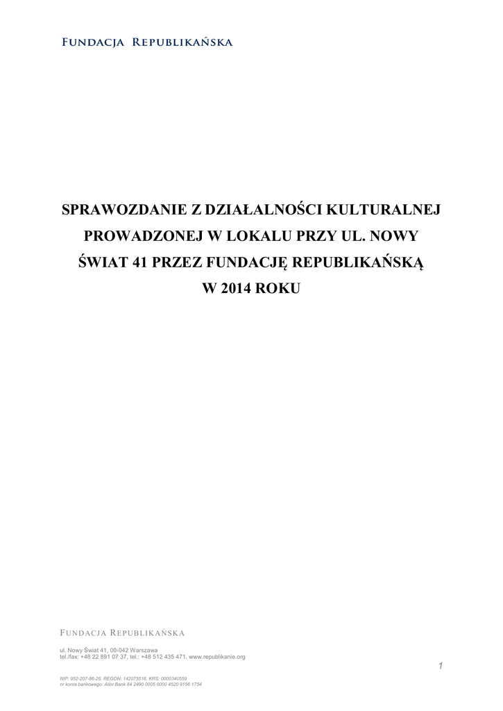 SPRAWOZDANIE Z DZIAŁALNOŚCI KULTURALNEJ PROWADZONEJ W LOKALU PRZY UL. NOWY ŚWIAT 41 PRZEZ FUNDACJĘ REPUBLIKAŃSKĄ W 2014 ROKU FUNDACJA REPUBLIKAŃSKA ul. Nowy Świat 41, 00-042 Warszawa tel./fax: +48 22 891 07 37, tel.: +48 512 435 471, www.republikanie.org 1 NIP: 952-207-86-26, REGON: 142075516, KRS: 0000340559 nr konta bankowego: Alior Bank 84 2490 0005 0000 4520 9156 1754 Fundacja Republikańska (zwana dalej Fundacją) korzysta z lokalu przy ul. Nowy Świat 41 zgodnie z umową najmu nr 253/0z/12 z dnia 22 czerwca 2012 roku zawartą pomiędzy Fundacją a Zakładem Gospodarowania Nieruchomościami w Dzielnicy Śródmieście m.st. Warszawy. Działalność kulturalna w lokalu przy ul. Nowy Świat 41 jest prowadzona zgodnie z zasadami zawartymi w protokole uzgodnień, ustalonymi przez Fundację Republikańską i Wydział Kultury i Promocji dla Dzielnicy Śródmieście m.st. Warszawy z dnia 15 maja 2012 roku. OD 1 STYCZNIA 2014 ROKU DO 31 GRUDNIA 2014 ROKU W LOKALU PRZY UL. NOWY ŚWIAT 41 ZOSTAŁY PRZEPROWADZONE NASTĘPUJĄCE DZIAŁANIA KULTURALNE: 1. 10 stycznia 2014 r. Wspomnienie ofiar katastrofy w Smoleńsku z okazji 43 miesięcznicy 2. 21 stycznia 2014 r. Wernisaż prac scenografa Wowo Bielickiego "Cytaty z dorobku artystycznego". Wernisaż zdjęć scenografii i plakatów nieżyjącego już wybitnego reżysera i autora wystaw muzealnych - Wowo Bielickiego. Wowo Bielicki zmarł w 2012 roku. Był laureatem wielu nagród za wystawy muzealne, współtwórcą i reżyserem popularnego Studia 2, autorem scenografii dla teatru TV, współtwórcą i reżyserem telewizyjnego programu satyrycznego EKSPRES, autorem wielu popularnych widowisk muzycznych. Miał okazję reżyserować Marlene Dietrich, uścisnąć dłoń Edith Piaf. Autor blisko 1000 realizacji telewizyjnych, operowych, teatralnych, estradowych i stadionowych. 3. 25 stycznia 2014 r. Debata „Niezrozumiały republikanizm” Dyskusja pod tytułem „Niezrozumiały republikanizm” była poświęcona problemowi definiowania współczesnego republikanizmu. Główną osią sporu były dwa spojrzenia na republikanizm. Pierwsze spojrzenie z punktu widzenia liberalnego, gdzie wolność nie może zostać ograniczona w żaden sposób oraz polskiego republikanizmu, dla którego wolność jest narzędziem do osiągnięcia szczęścia. Istotę całej dyskusji można odnaleźć w słowach Michała Jarczewskiego: „Dzisiaj musimy zdefiniować republikanizm na polskie warunki. Jaka jest relacja między naszym republikanizmem a polskością? Gdyby udało się zdefiniować polski republikanizm to stanowiłoby to emanację polskości.” FUNDACJA REPUBLIKAŃSKA ul. Nowy Świat 41, 00-042 Warszawa tel./fax: +48 22 891 07 37, tel.: +48 512 435 471, www.republikanie.org 2 NIP: 952-207-86-26, REGON: 142075516, KRS: 0000340559 nr konta bankowego: Alior Bank 84 2490 0005 0000 4520 9156 1754 4. 7 lutego 2014 r. Warsztaty retoryczne Dyskusja dotyczyła pytania: "Czy można i powinno się stosować wulgaryzmy w debacie publicznej?” Uczestnicy trenowali także formę wypowiedzi publicznej Public Forum Debate, czyli dwie osoby na dwie, bez prowadzącego. 5. 8 lutego 2014 r. Warsztaty retoryczne Dyskusja została oparta na cytacie: "Kochaj swych wrogów: bo oni mówią ci o twoich błędach" – Benjamina Franklina, jednego z Ojców-założycieli Stanów Zjednoczonych. Na warsztatach uczestnicy starali się także odpowiedzieć na pytanie: „Czy warto sięgać do mądrości masonów?”. 6. 10 lutego 2014 r. Wspomnienie ofiar katastrofy w Smoleńsku z okazji 44 miesięcznicy 7. 13 lutego 2014 r. Dyskusyjny Klub Filmowy Pierwsze spotkanie Dyskusyjnego Klubu Filmowego, na którym został wyświetlony dokument pt. “Miliard szczęśliwych ludzi”, będący zapisem próby wejścia na rynek chiński polskiego zespołu muzyki disco-polo “Bayer Full”. Pokaz filmowy został zakończony krótką dyskusją, gdzie uczestnicy wymieniali się wrażeniami z dokumentu. Głównymi wątkami dyskusji wśród zebranych osób były różnice kulturowe, nie tylko pomiędzy Polską a Chinami, ale też pomiędzy różnymi pokoleniami Polaków. Dyskutowano także nad uwarunkowaniami społeczno-gospodarczo-politycznymi w Chinach i w Polsce, jak również nad brakiem umiejętności pracy zespołowej Polaków. Zwrócono ponadto uwagę na fantastyczne ujęcia oraz na klarowność przekazu dokumentu. 8. 14 lutego 2014 r. Warsztaty retoryczne Uczestnicy warsztatów oparli dyskusję na pytaniu: "Czy warto zakochać się w Walentynki?" oraz na znaczeniu importowanych świąt w polskiej popkulturze. 9. 15 lutego 2014 r. Warsztaty retoryczne Dyskusja wokół tezy "Balansujcie dopóki się da, a gdy się już nie da, podpalcie świat!" znaczenie impactu (zakończenia wypowiedzi) w przemowach publicznych. 10. 18 lutego 2014 r. Warsztaty retoryczne FUNDACJA REPUBLIKAŃSKA ul. Nowy Świat 41, 00-042 Warszawa tel./fax: +48 22 891 07 37, tel.: +48 512 435 471, www.republikanie.org 3 NIP: 952-207-86-26, REGON: 142075516, KRS: 0000340559 nr konta bankowego: Alior Bank 84 2490 0005 0000 4520 9156 1754 Stwierdzenie "Gospodarka udziałowa jest ewolucyjną formą rozwoju kapitalizmu" stało się asumptem do dyskusji prowadzonej w formie Lincoln-Douglas Debate.,najpopularniejszej debaty telewizyjnej w USA i Polsce 11. 19 lutego 2014 r. Warsztaty retoryczne Znaczenie mów końcowych w polskim systemie sądowniczym. Warsztaty tworzenia sądowych mów końcowych. 12. 22 lutego 2014 r. Debata "Wolny człowiek w silnym państwie" Co oznacza silne państwo? Czy chcemy silnego państwa? Jaka jest relacja miedzy wolnością a silnym państwem? Czy dążenia wielu polityków do tworzenia silnego państwa nie jest zagrożeniem dla wolności obywatela? Na te i inne pytania starali się odpowiedzieć uczestnicy dyskusji. Konkluzje z debaty zostały zawarte w postaci mapy myśli. Zebrani mieli różne wizje silnego państwa oraz różne poglądy na wolność i obowiązki obywateli. 13. 25 lutego 2014 r. Wars